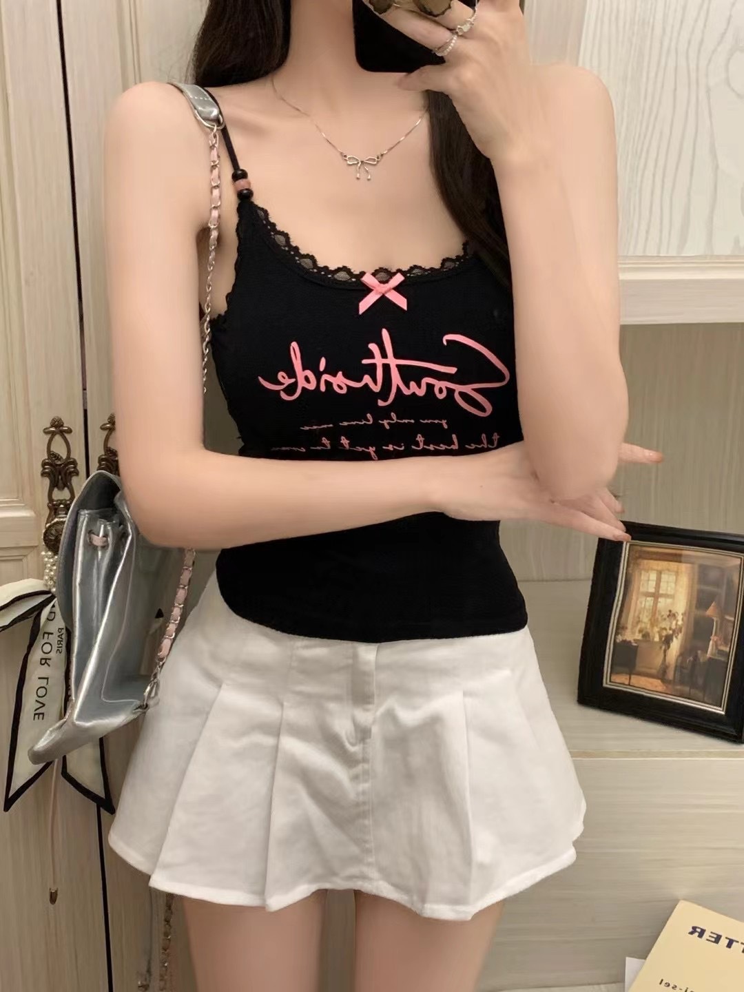 2116 # 달콤한 쿨 스타일 편지 인쇄 슬링 여성의 여름 새로운 스타일 슬림 핏 슬리밍 레이스 조끼 짧은 민소매 아우터웨어