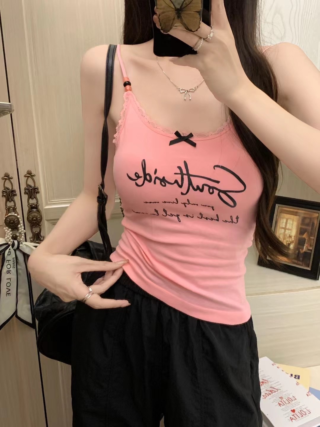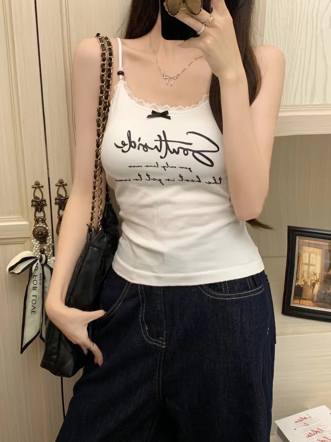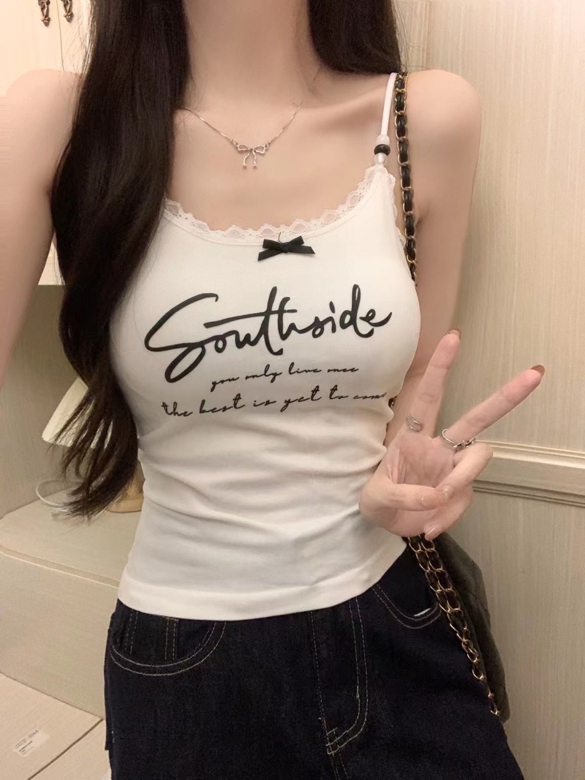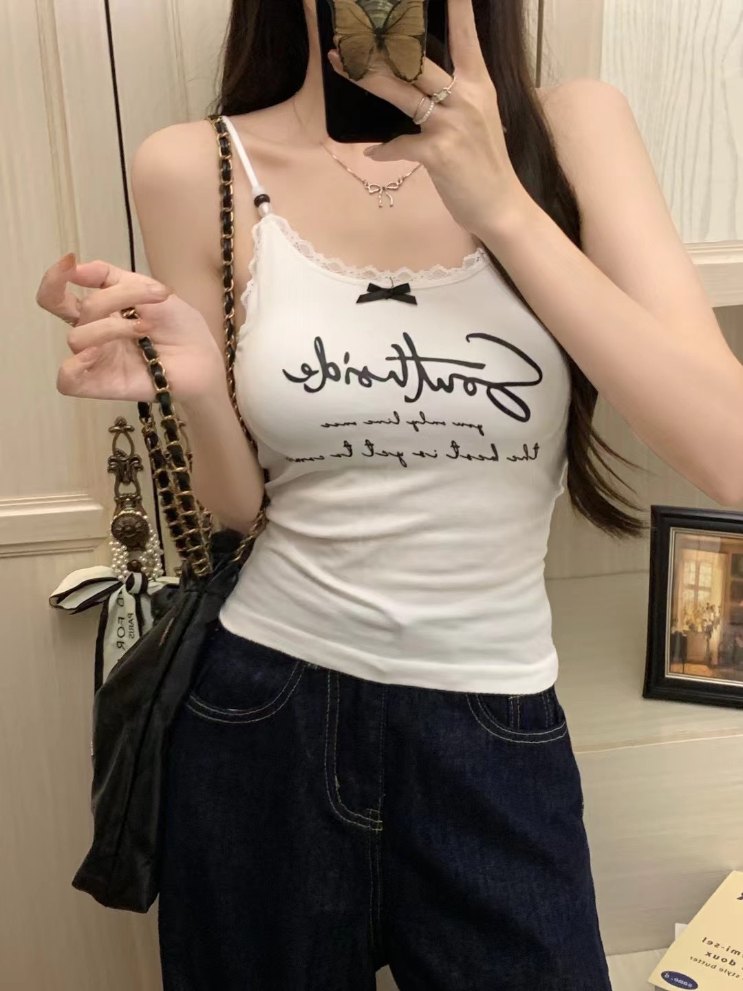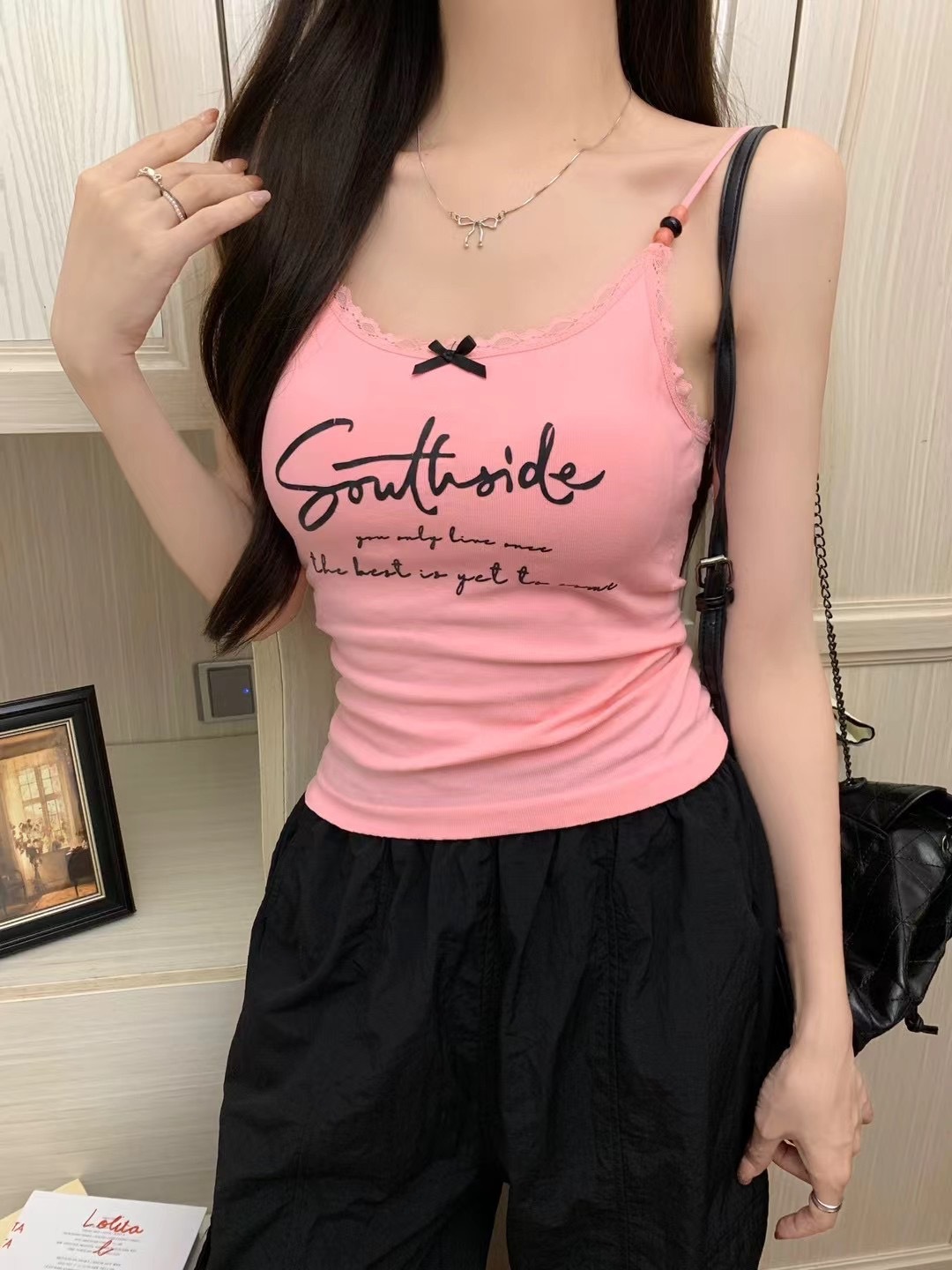 2116 # 달콤한 쿨 스타일 편지 인쇄 슬링 여성의 여름 새로운 스타일 슬림 핏 슬리밍 레이스 조끼 짧은 민소매 아우터웨어스토어 가기