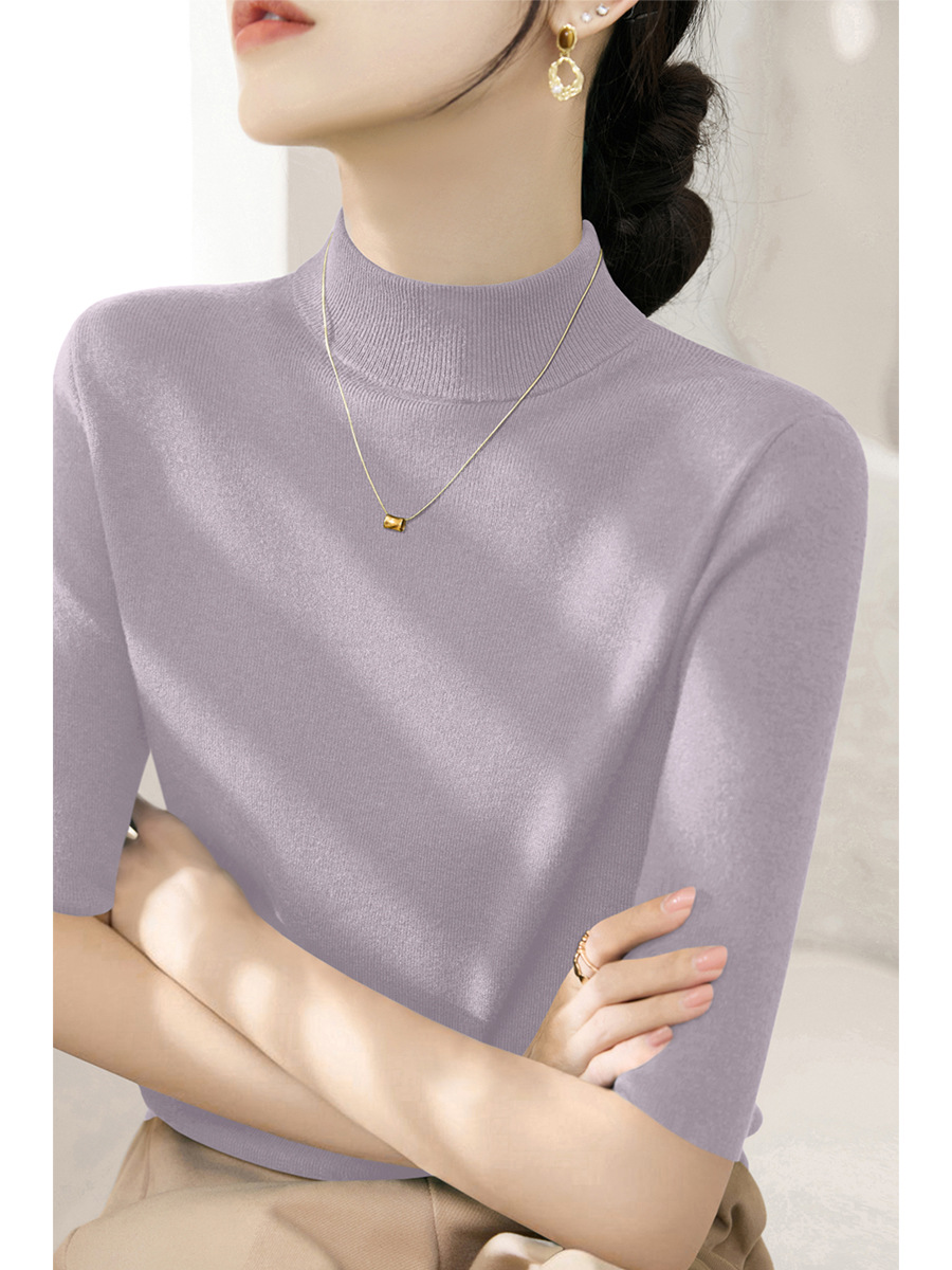 2025년 가을 패션 다용도 니트 여성용 반하이넥 독특한 중간 소매 슬림핏 편안한 베이직 탑
