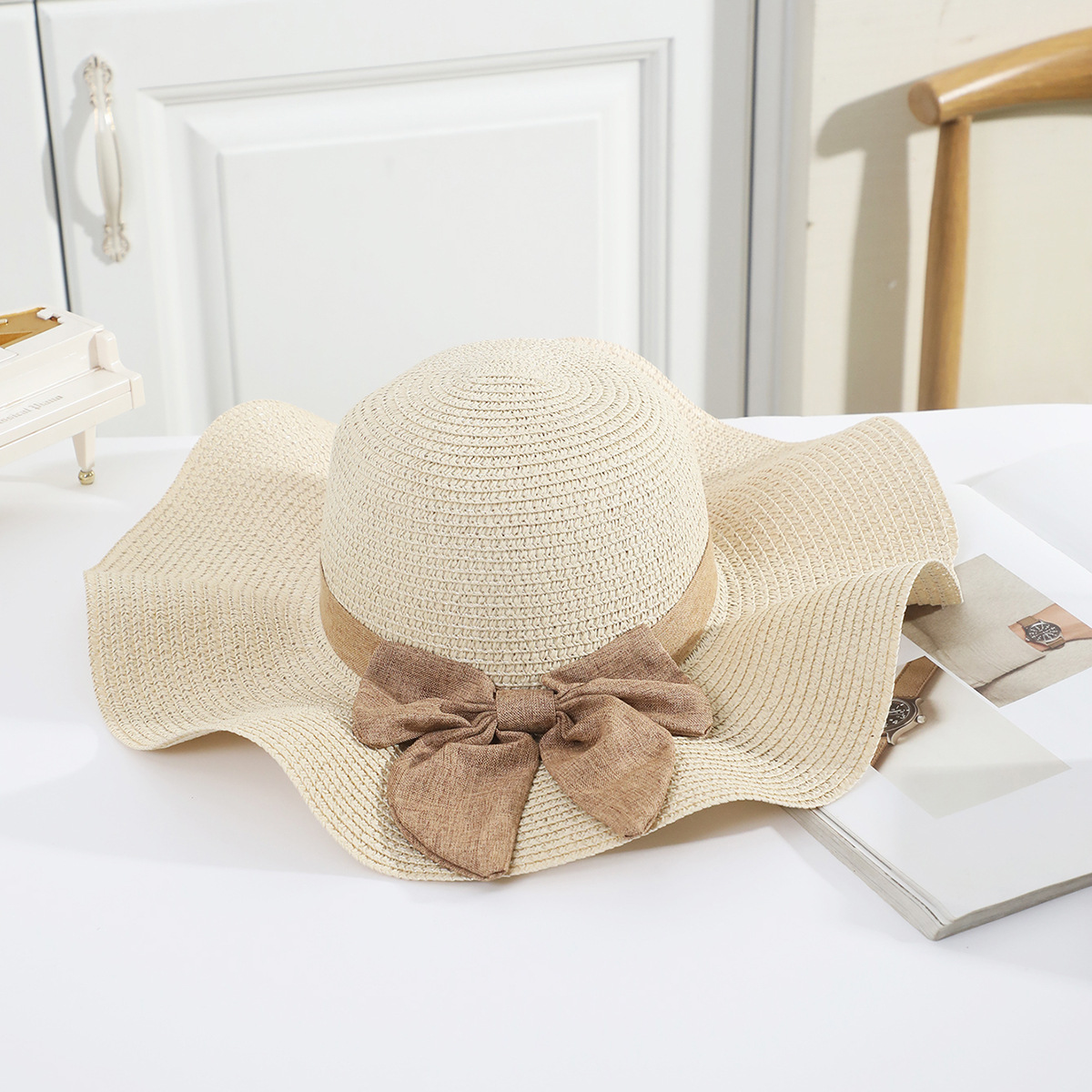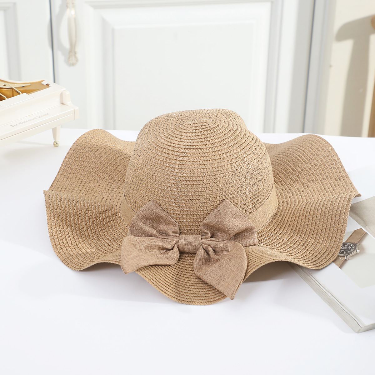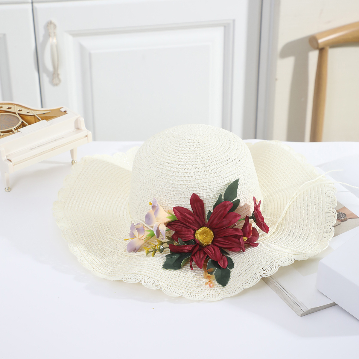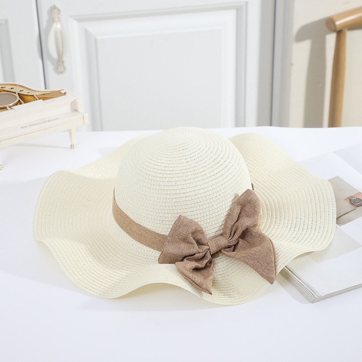 국경 간 여름 여성의 햇빛 밀짚 모자 휴대 전화 세트 우아한 여인의 큰 모자 휴가 밀짚 모자스토어 가기