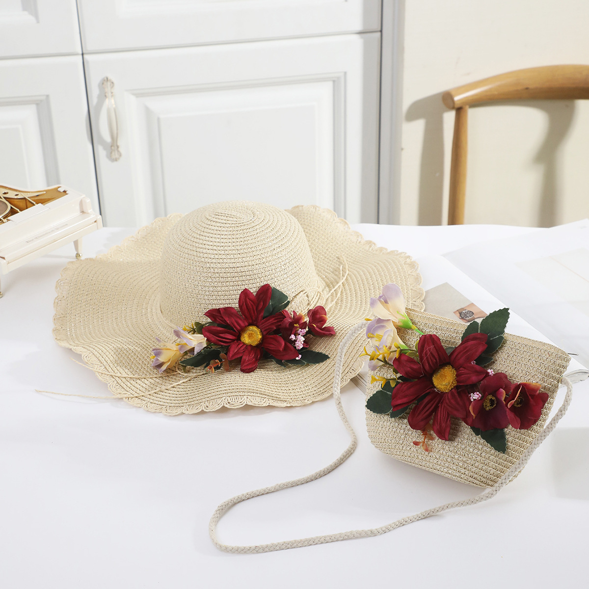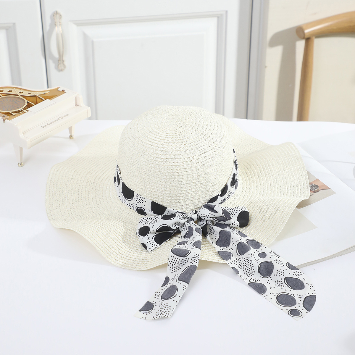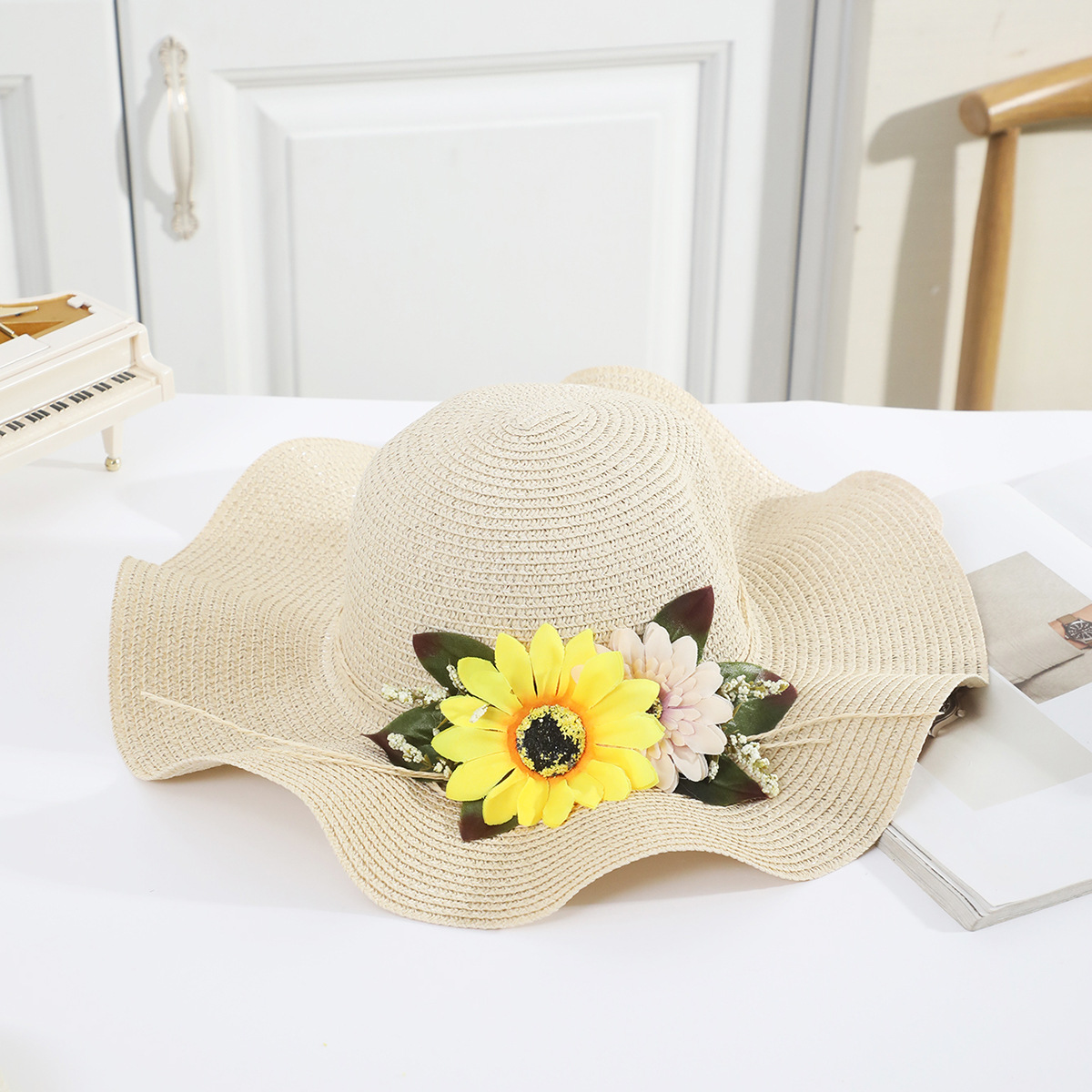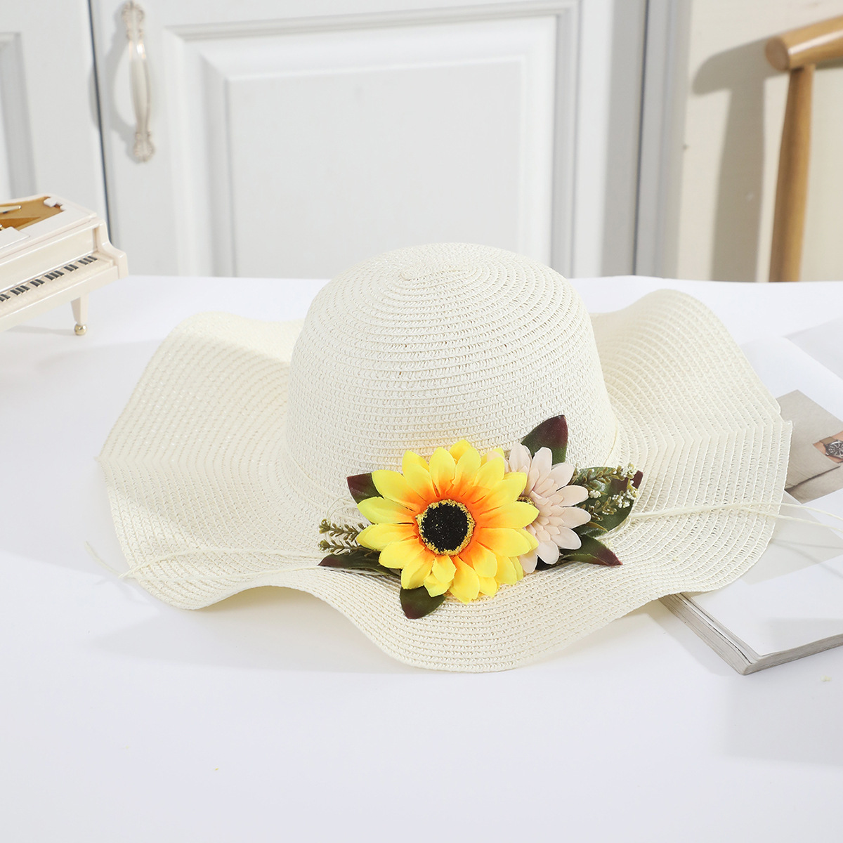 국경 간 여름 여성의 햇빛 밀짚 모자 휴대 전화 세트 우아한 여인의 큰 모자 휴가 밀짚 모자스토어 가기