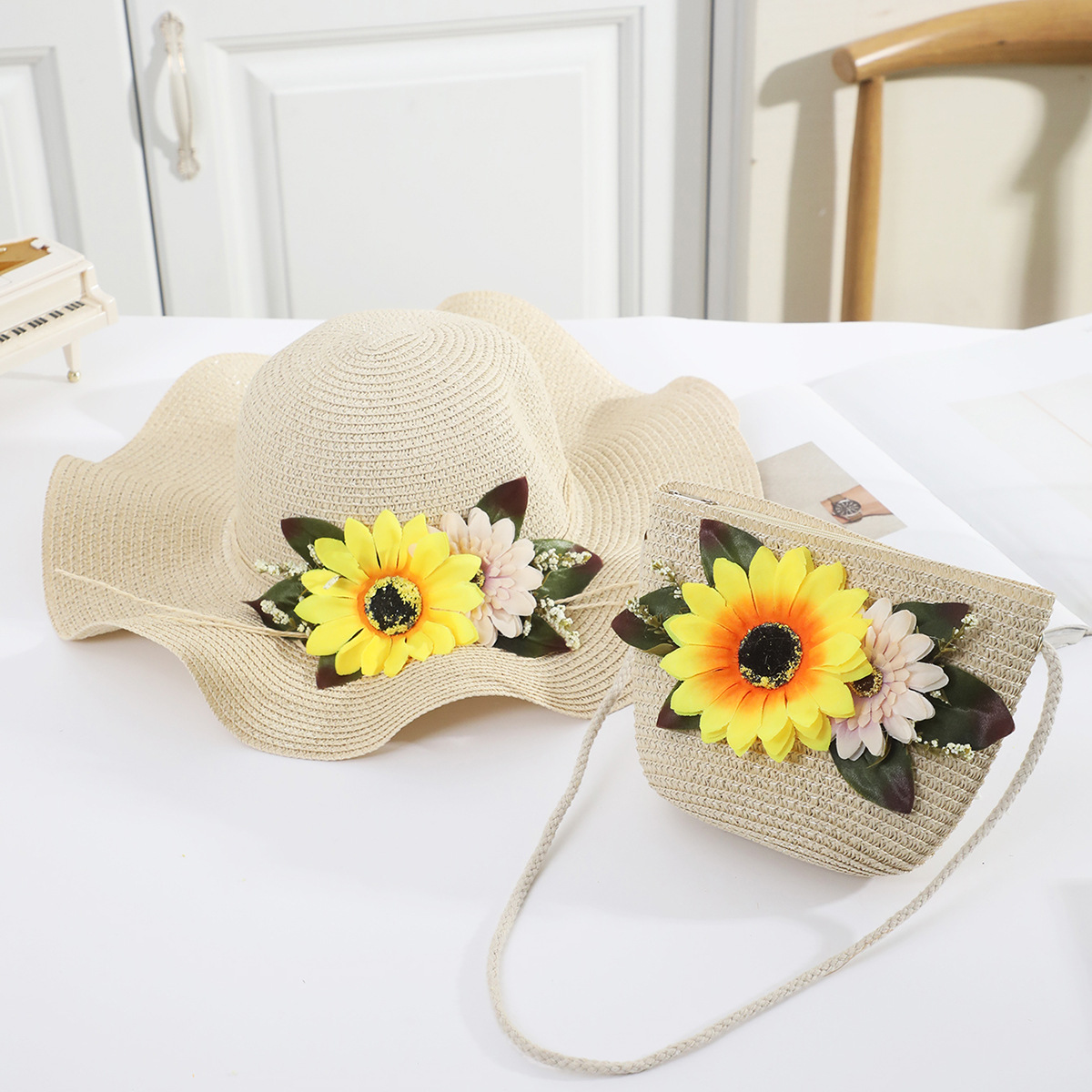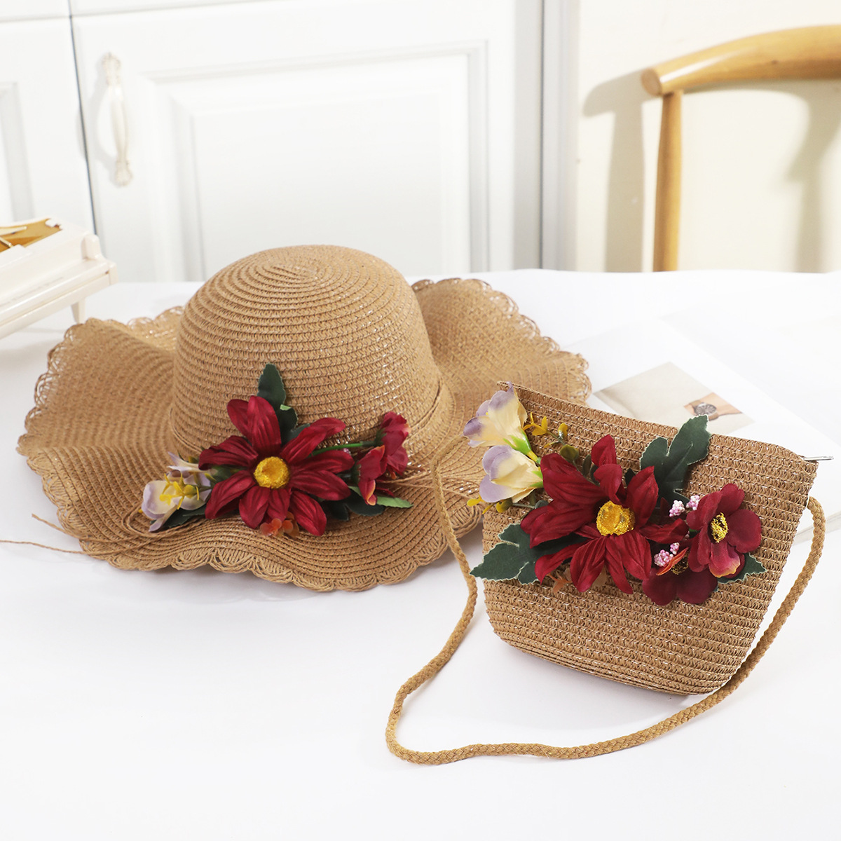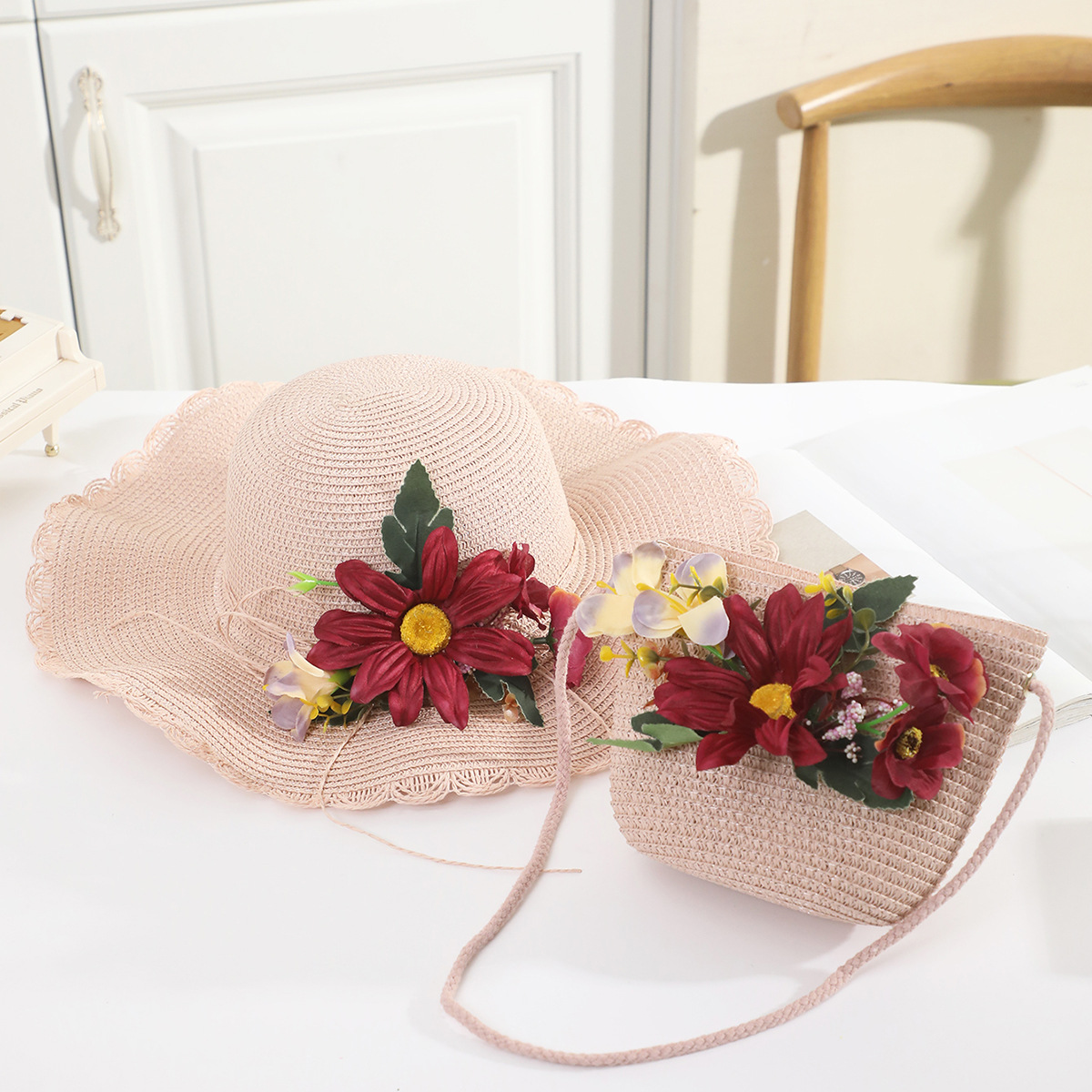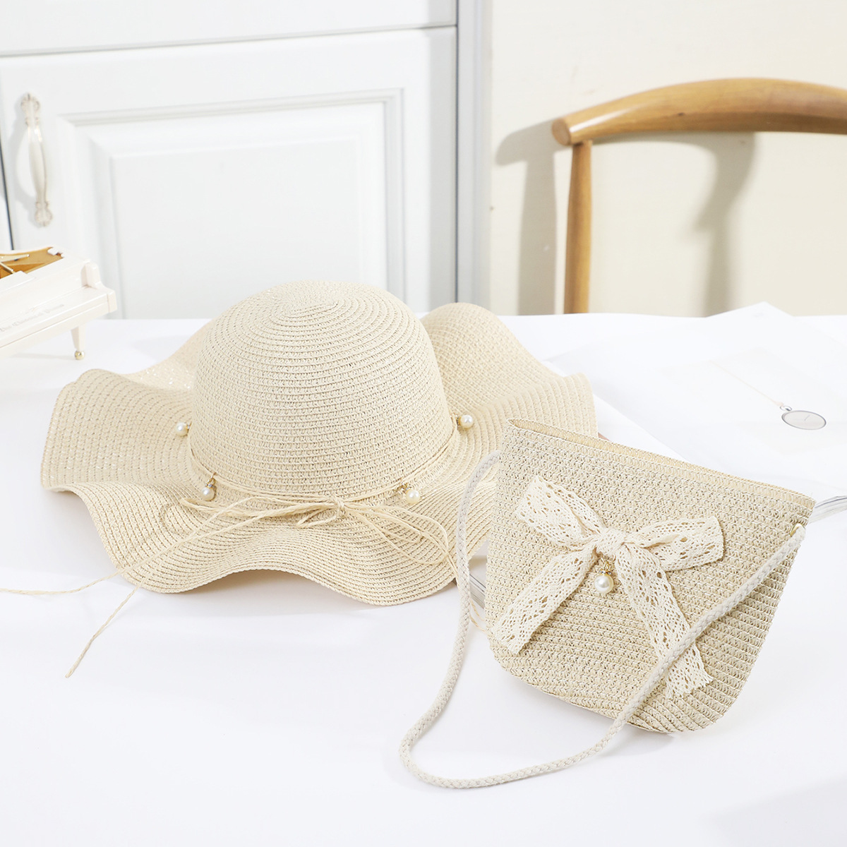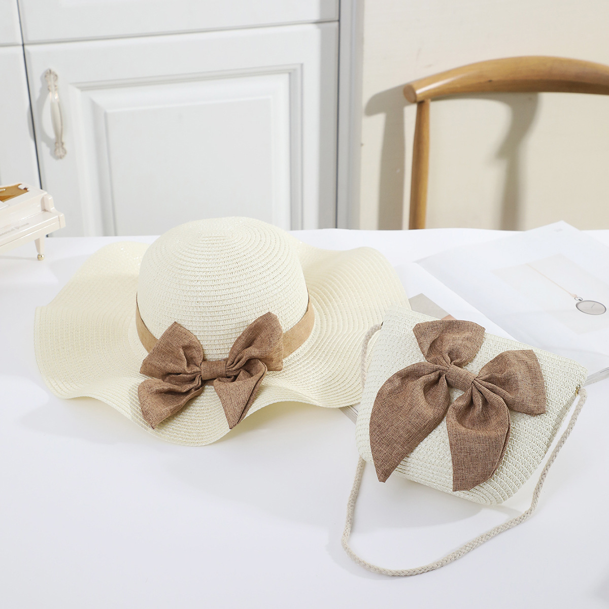 국경 간 여름 여성의 햇빛 밀짚 모자 휴대 전화 세트 우아한 여인의 큰 모자 휴가 밀짚 모자스토어 가기