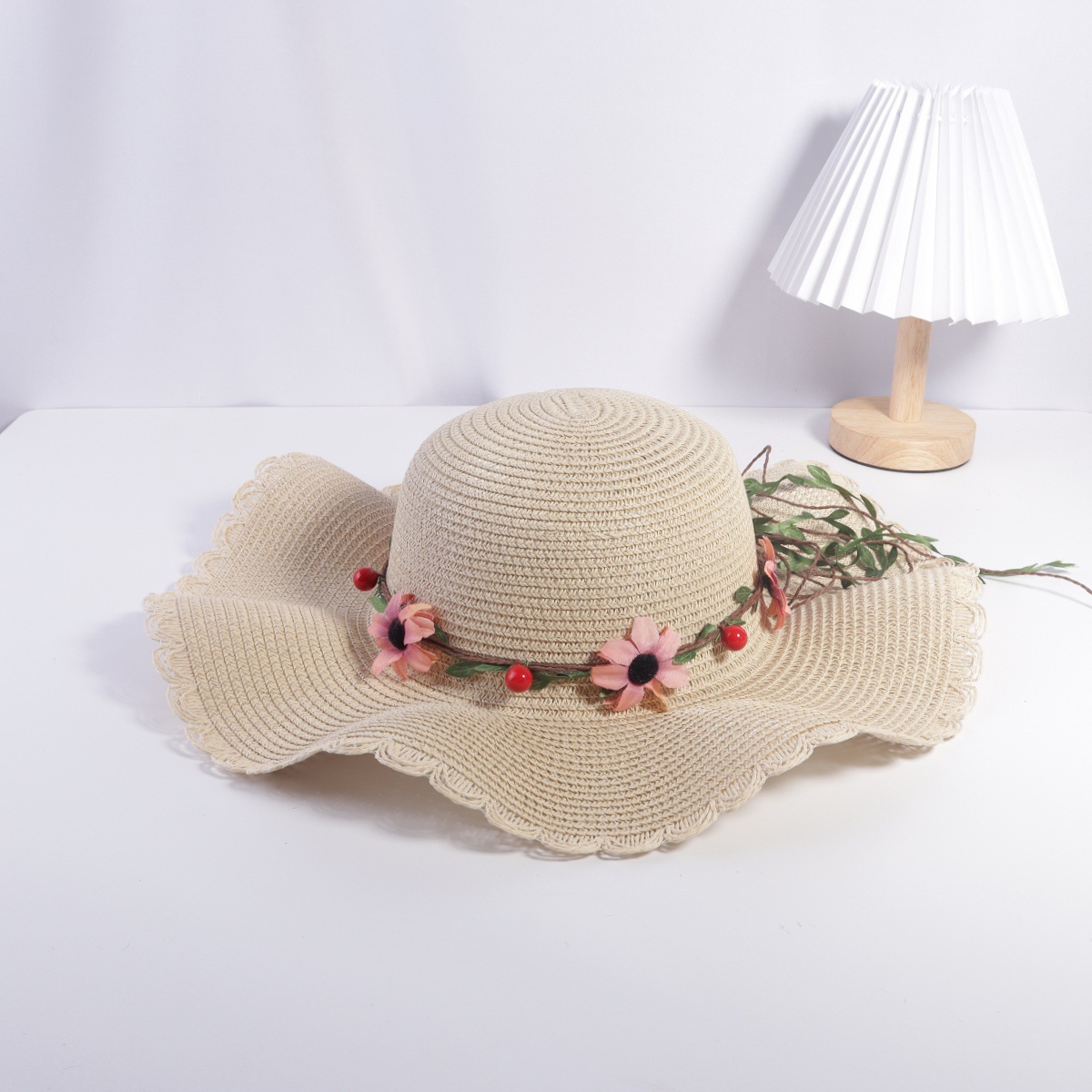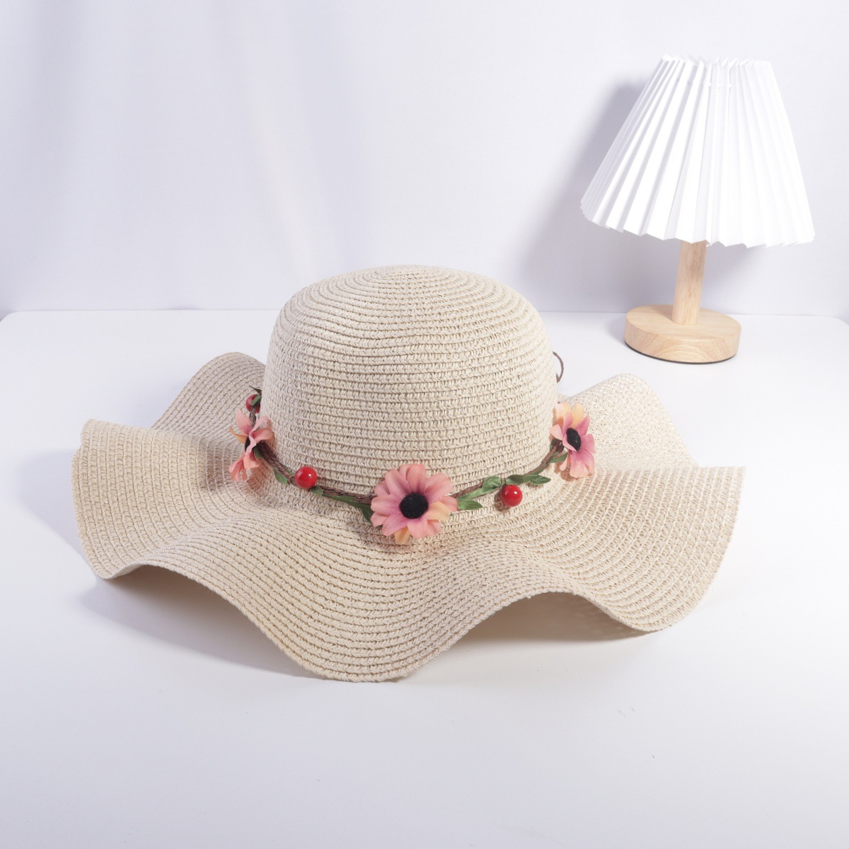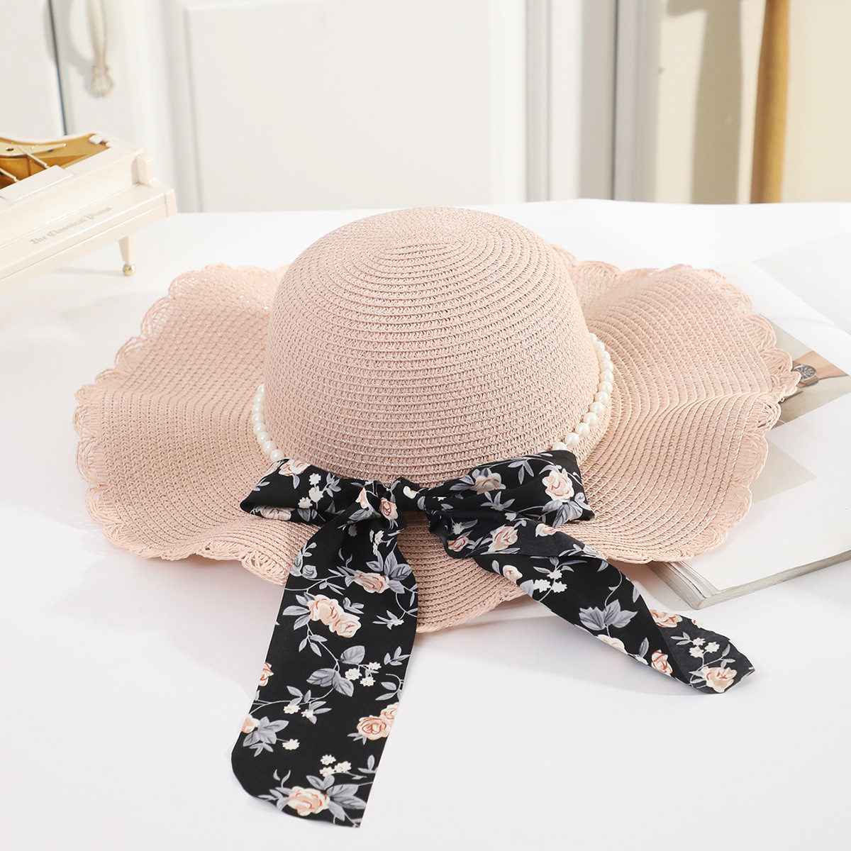 • 성인 진주 꽃무늬 검은 리본 연잎 모자 쌀