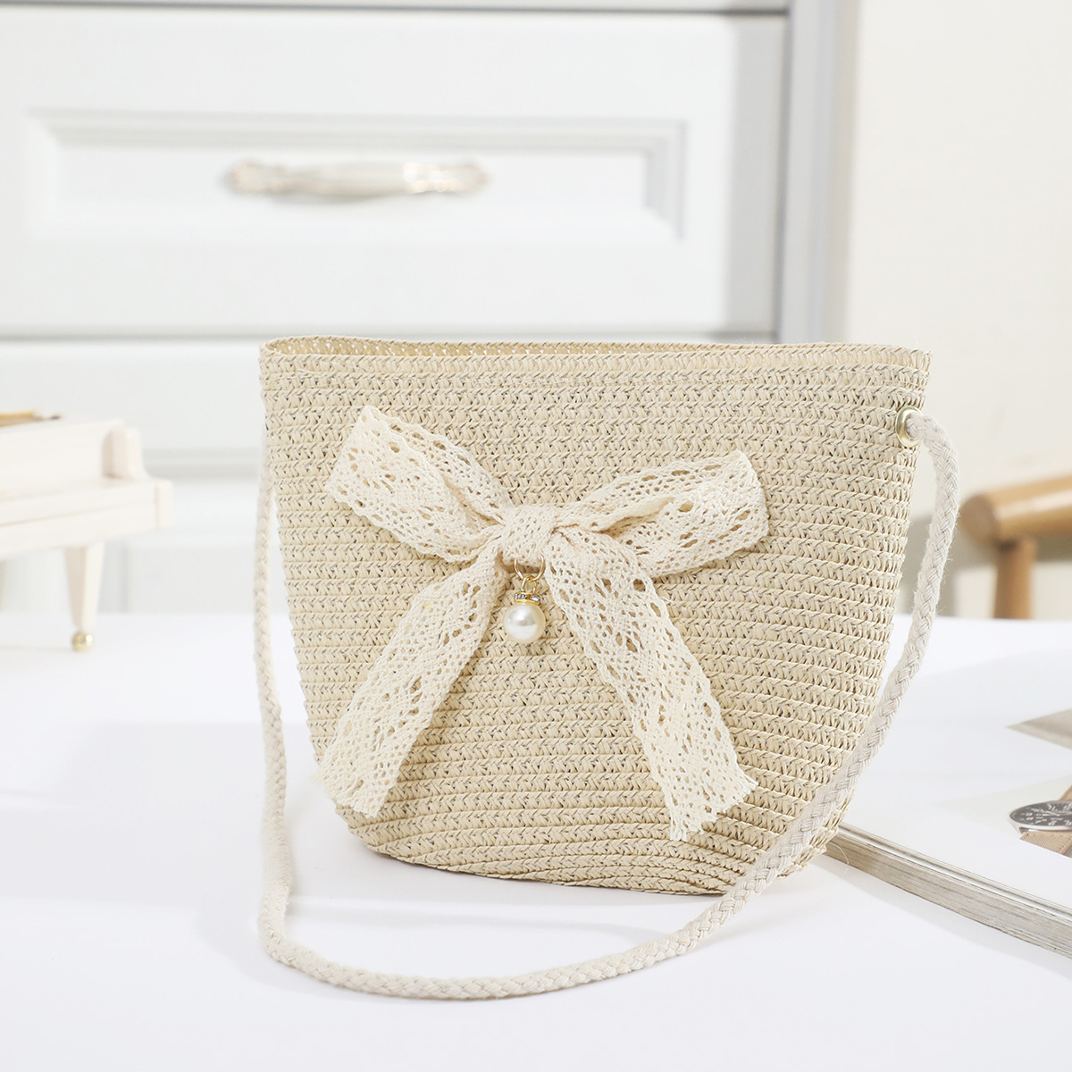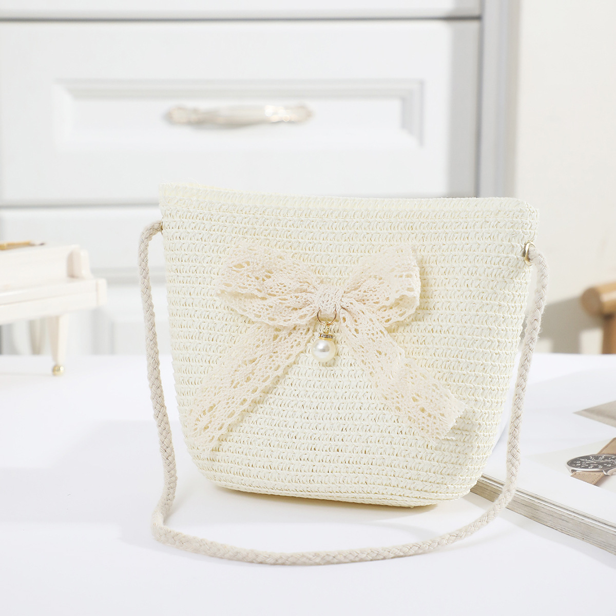 • 화이트 컬러의 진주 레이스 리본 라지 백