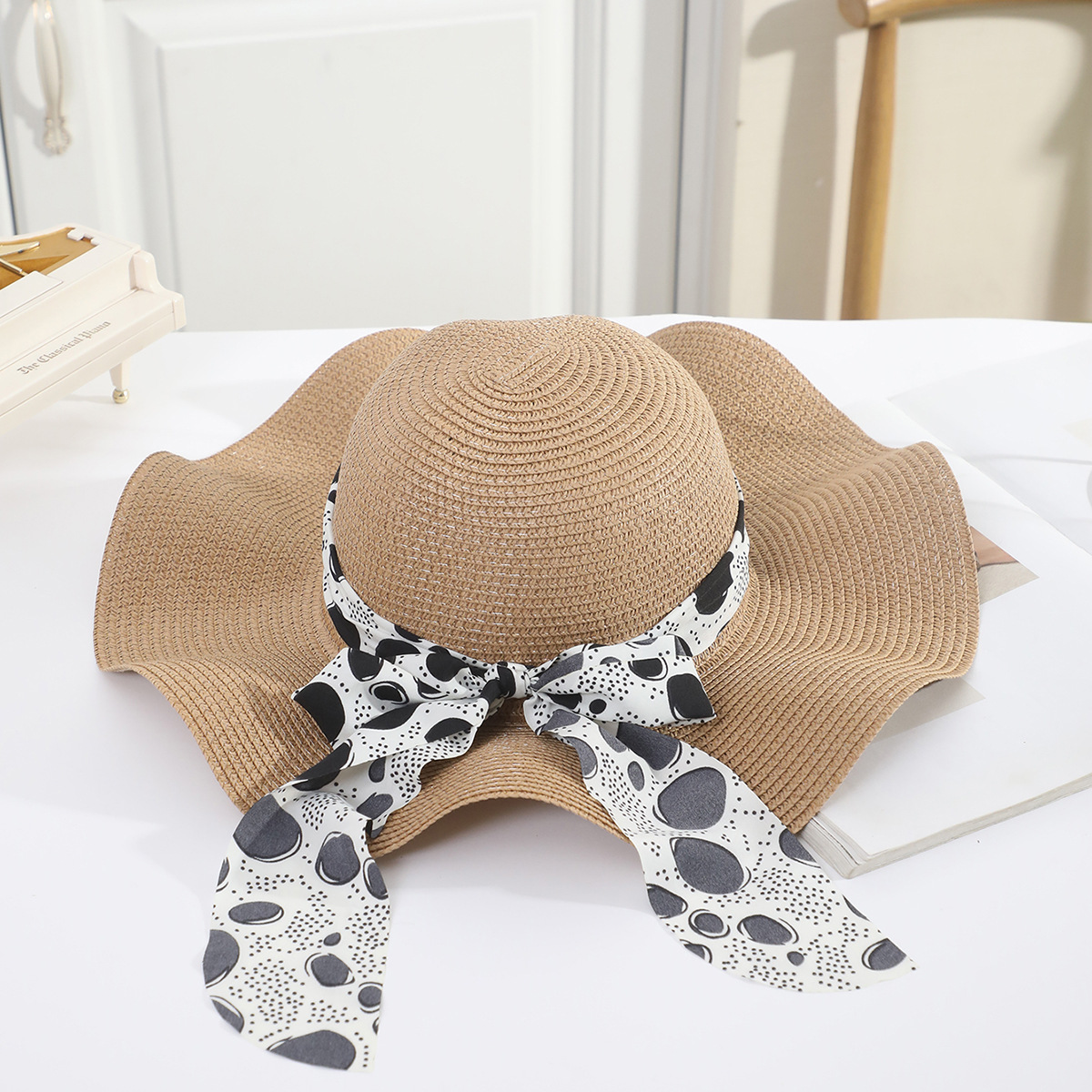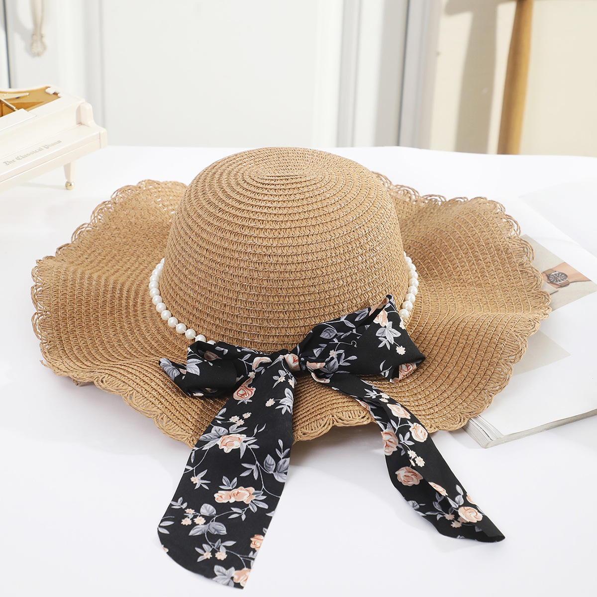 • 성인 진주 꽃무늬 블랙 리본 연잎 모자 커피
