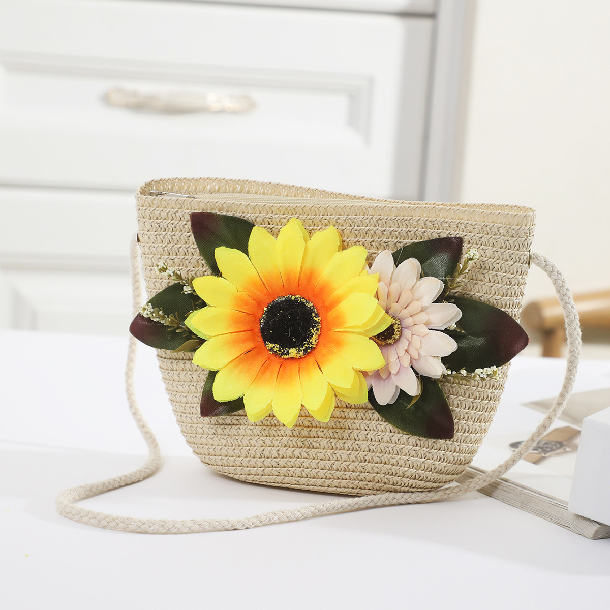 • 노란색 분홍색 해바라기 큰 가방 흰색