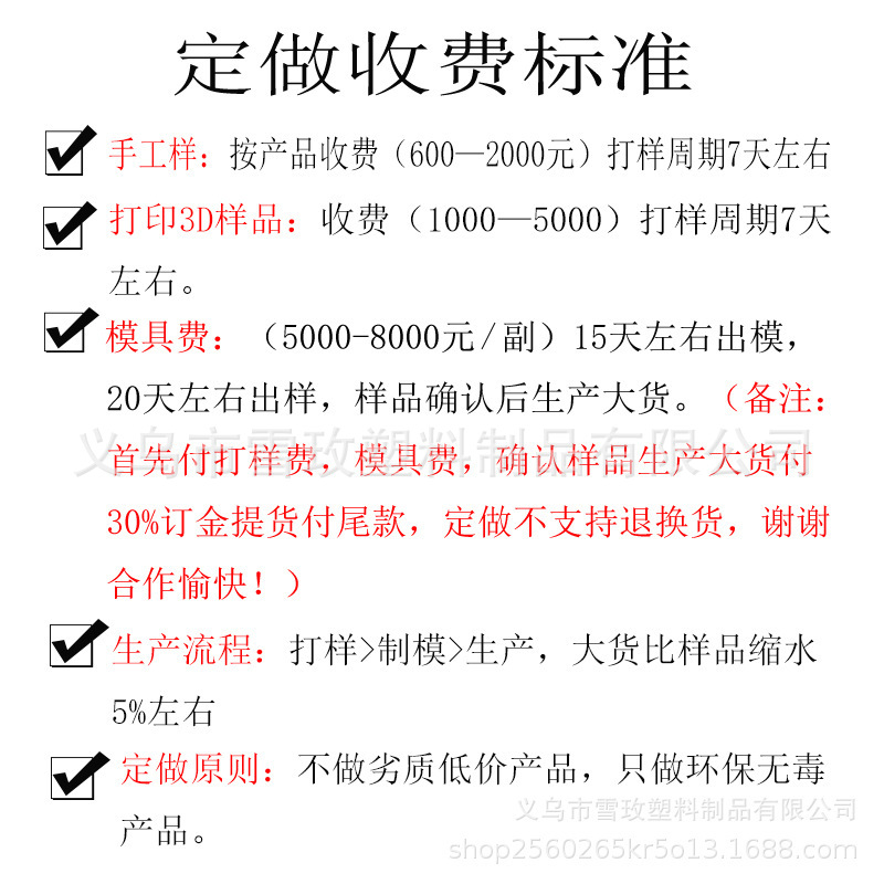 备注:手工测量有误差+-0.02mm,样品和少量下单都是亏本的不支持退换货,人工成本高等等,定制产品没有质量问题不退换.理解万岁!专业生产玩具配件发声器,二十多年承接各种注塑吹塑产品等等阿里线下实力验厂,24小时在线欢迎新老顾客前来验厂详谈,您的满意是我们的追求!