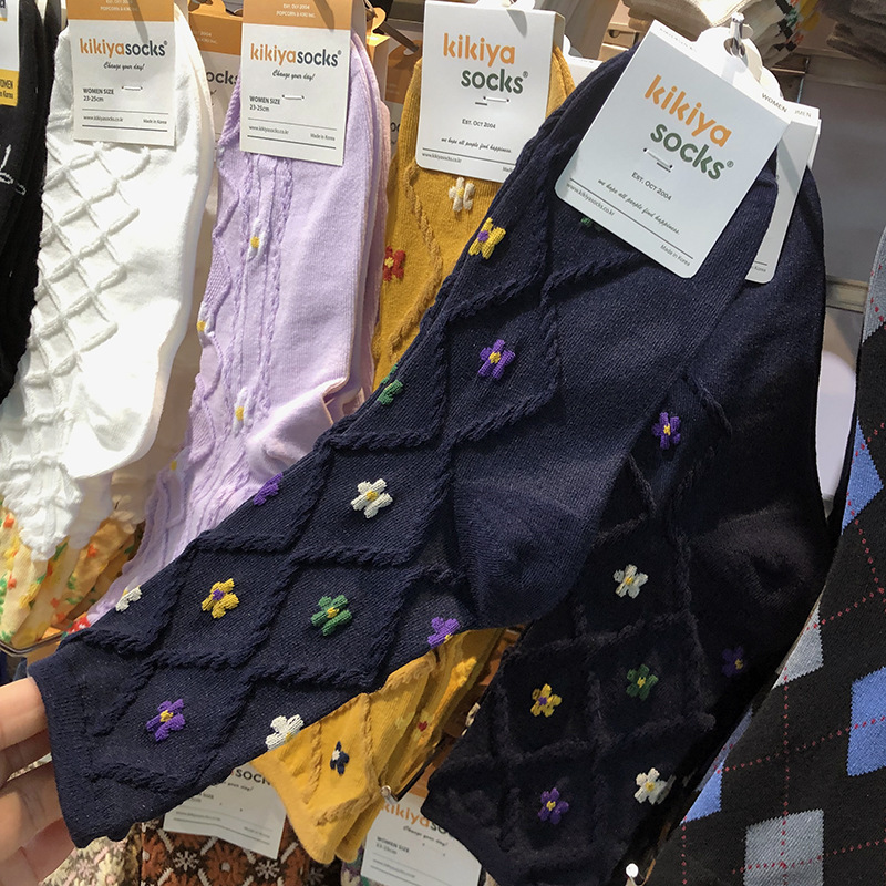 [재고] 한국 양말 여성 문학 구호 작은 꽃면 양말 일본 복고풍 패션 다이아몬드 격자 튜브스토어 가기