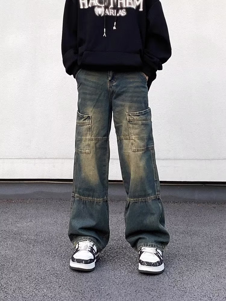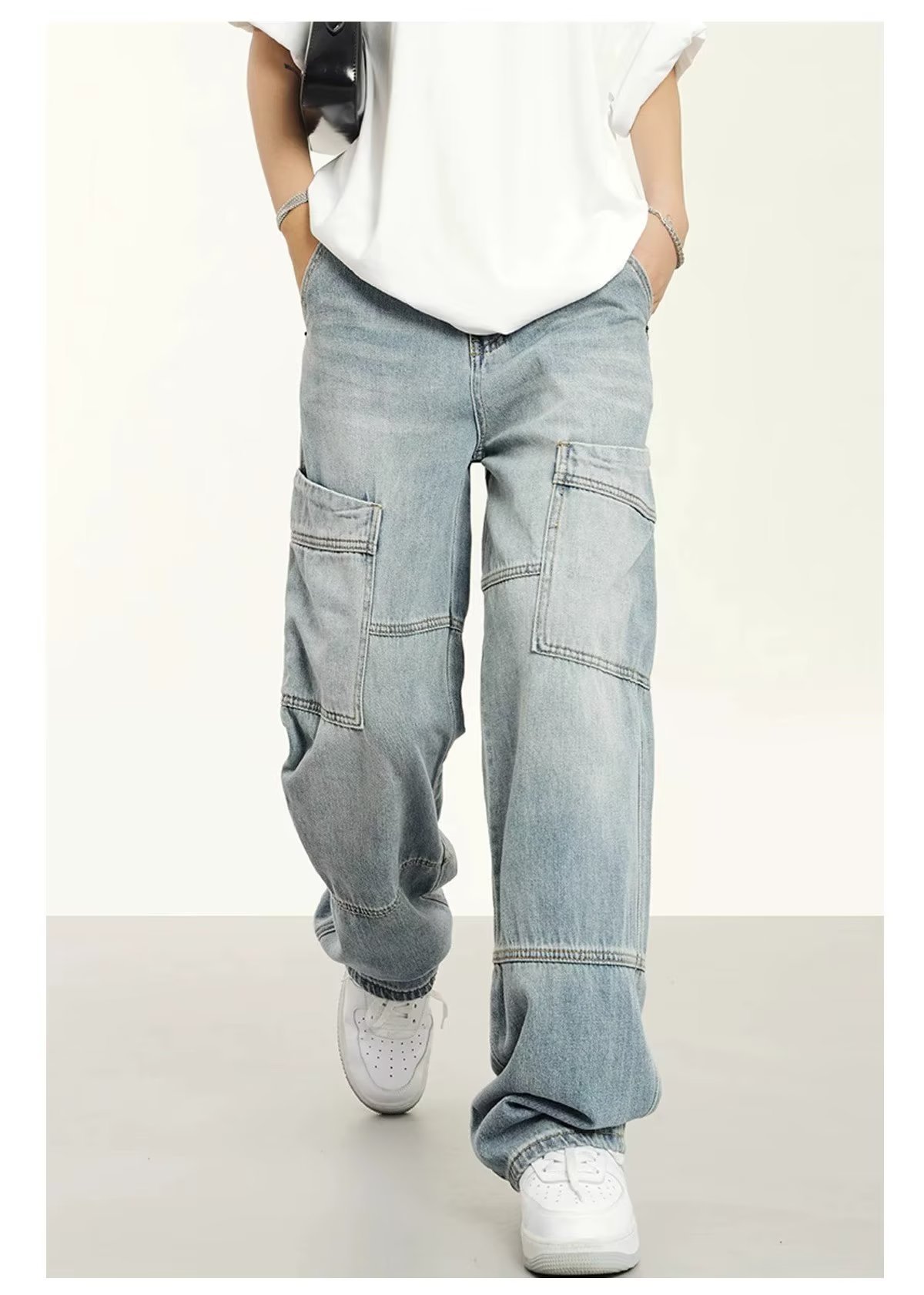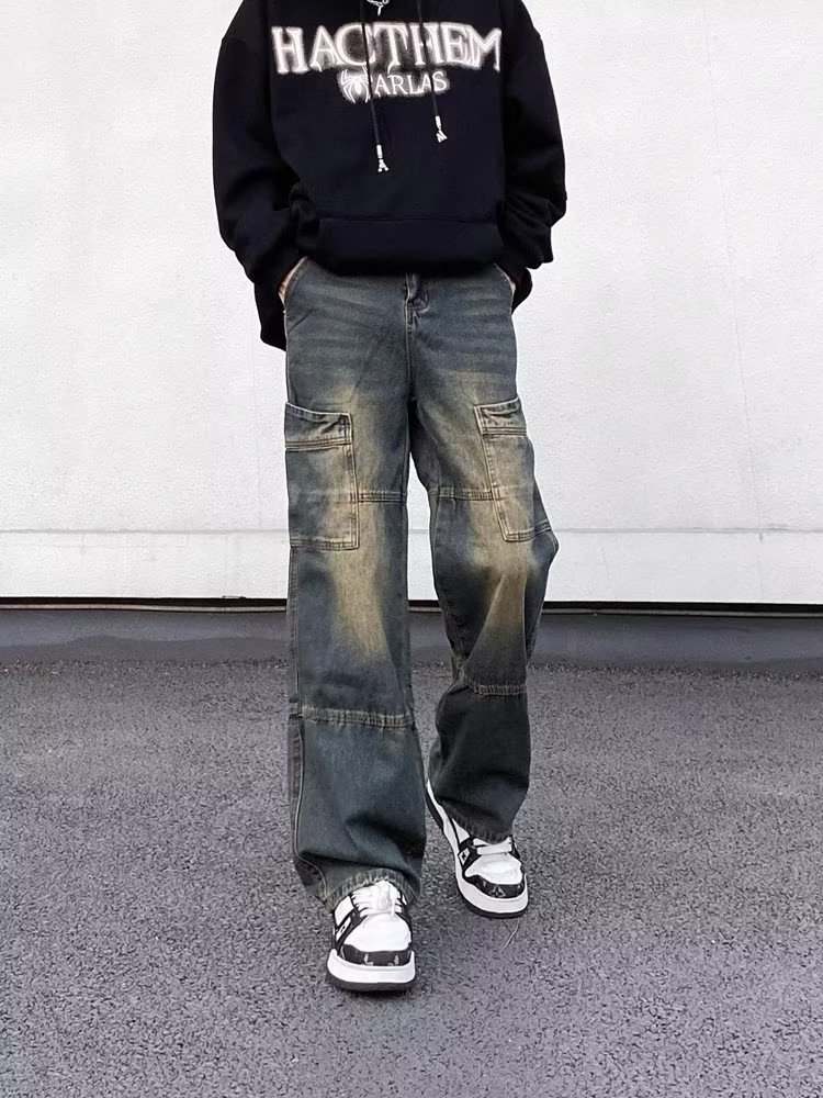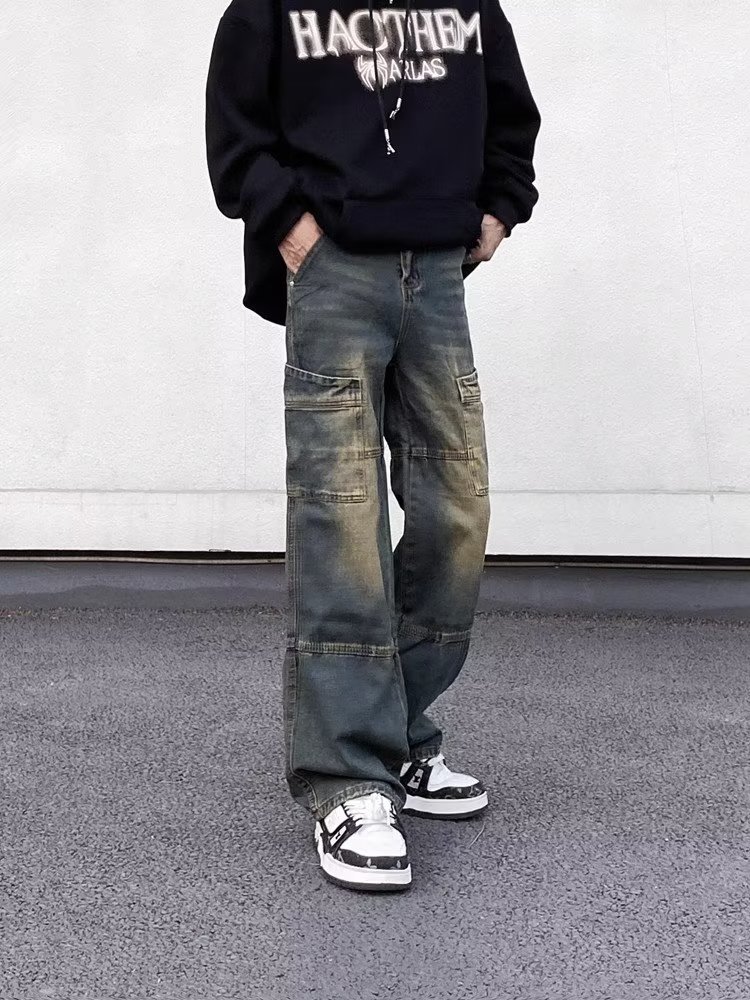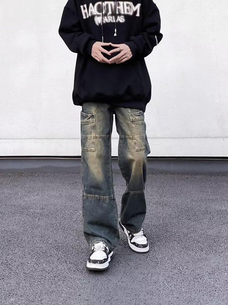 툴링 청바지 남성용 스트레이트-레그 루즈 아메리칸 스타일 하이 스트리트 바이브 팬츠 트렌디 브랜드 러피언 핸섬 포켓 레트로 향수 바지스토어 가기