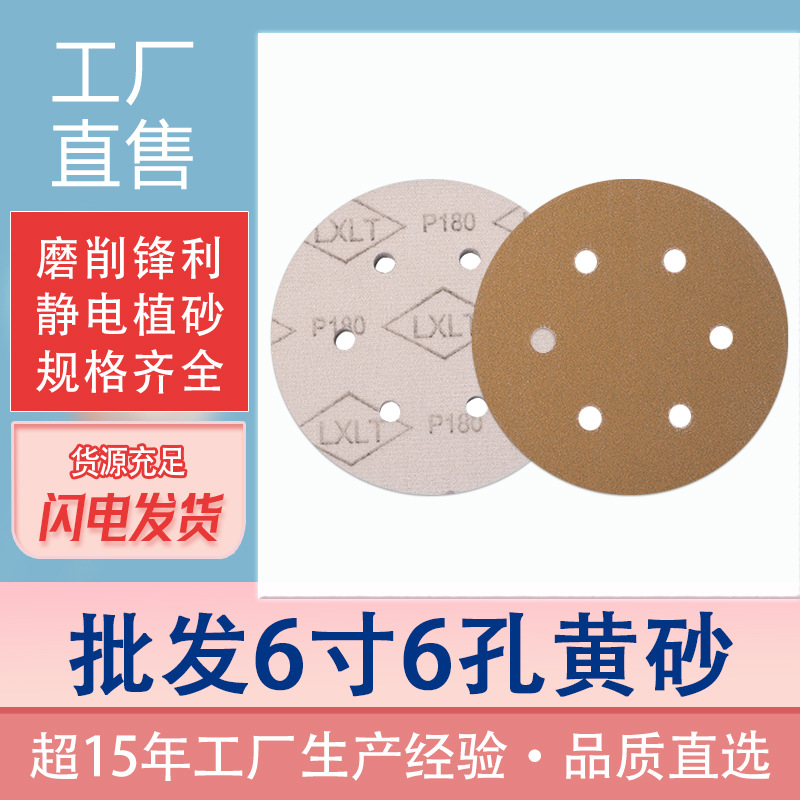 맞춤형 도매 LXLT6 인치 6 홀 골드 사포 자동차 페인트 퍼티 연삭 노란색 모래 플로킹 건식 연마 사포스토어 가기