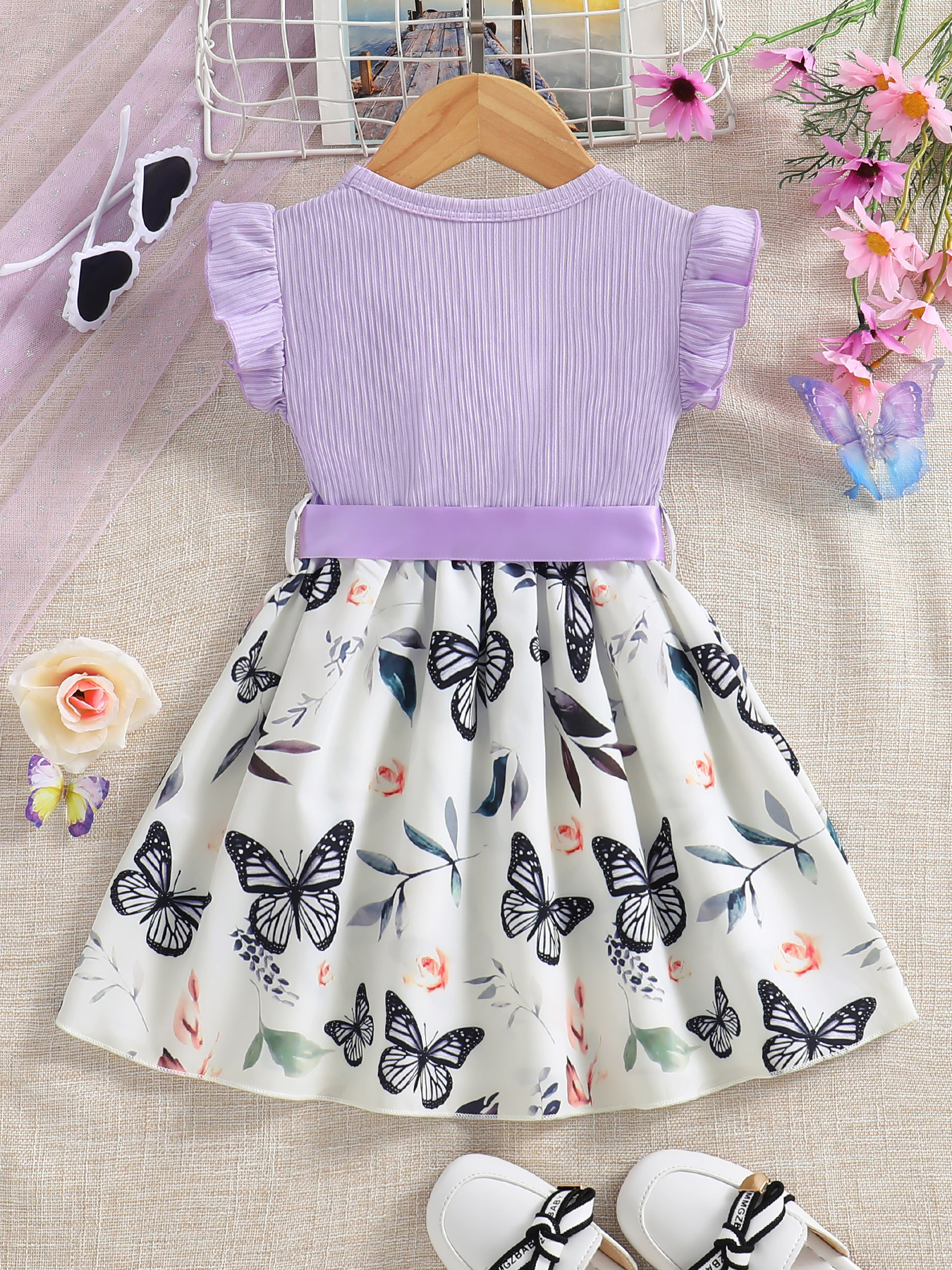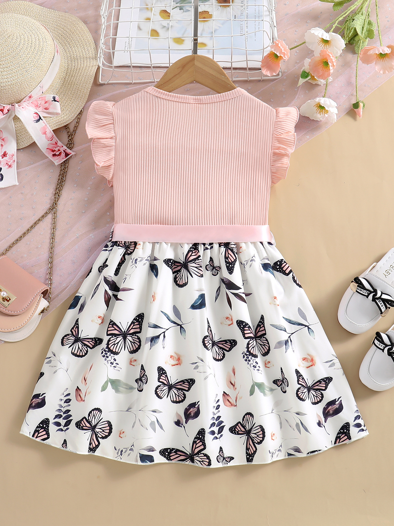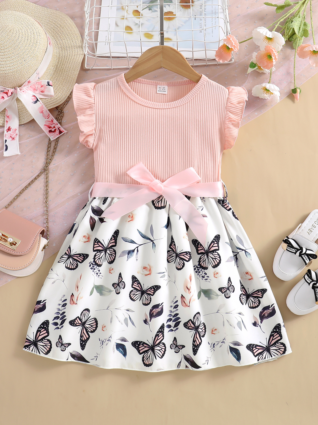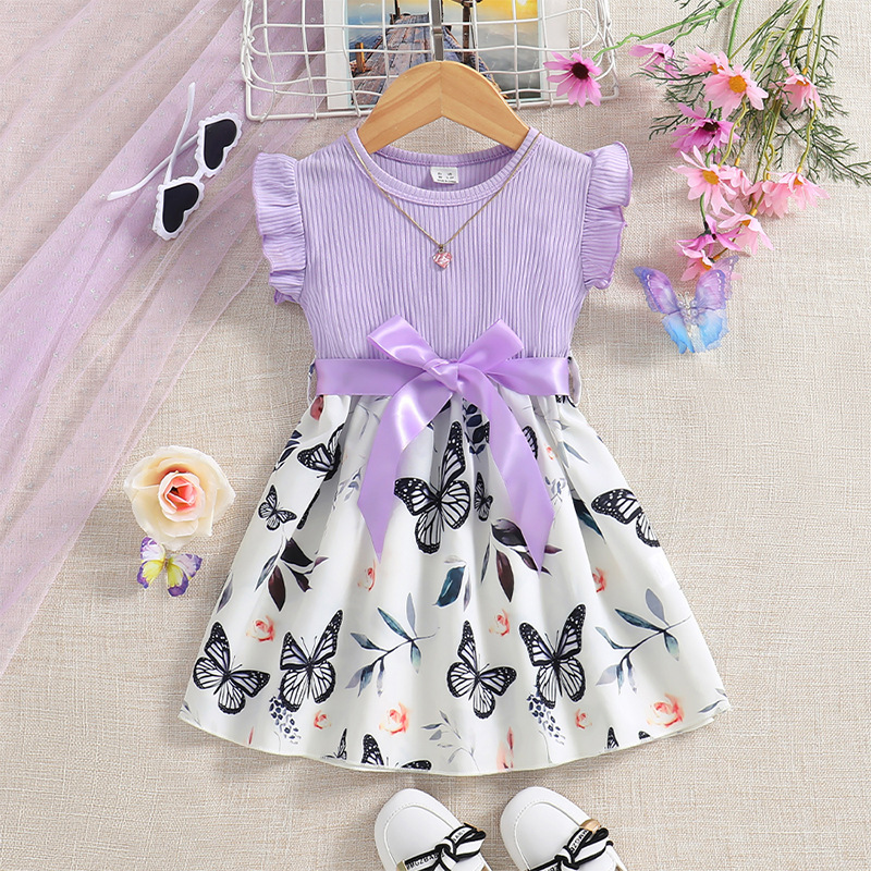 쇼피파이 해외 직구 유럽 및 미국 여아용 라운드넥 플라잉 슬리브 골지 공주 드레스 나비 프린트 원피스+벨트 아동복