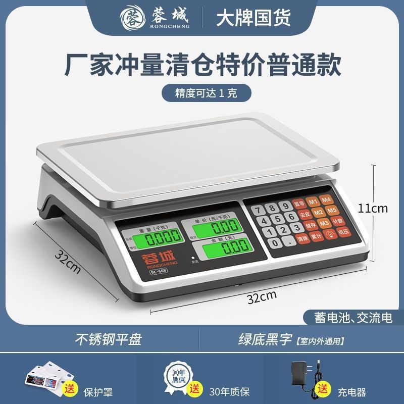 양쪽에서 도매 업체가 야채를 판매하고 휴대용 소형 킬로와 컨버터블 킬로 포장 마차를 설치하는 Rongcheng 전자 저울을 보여줍니다.