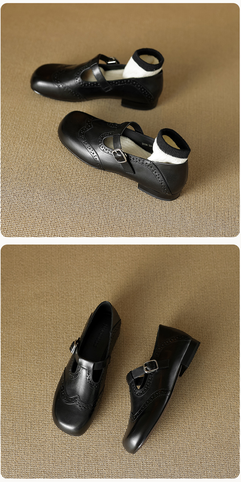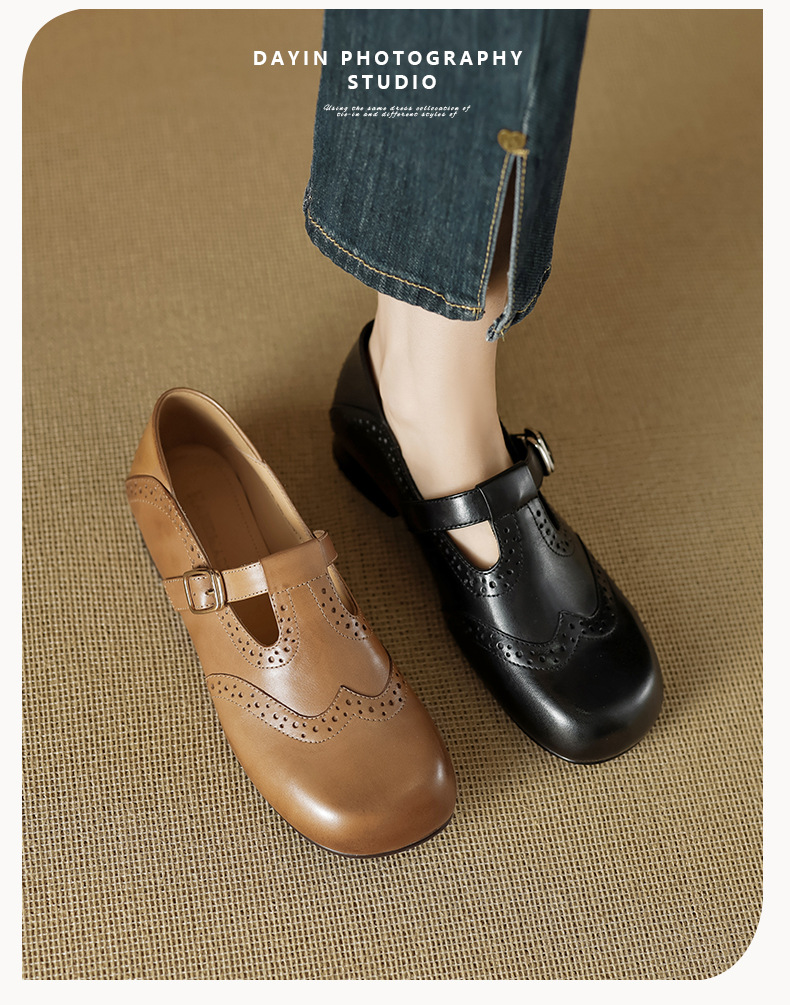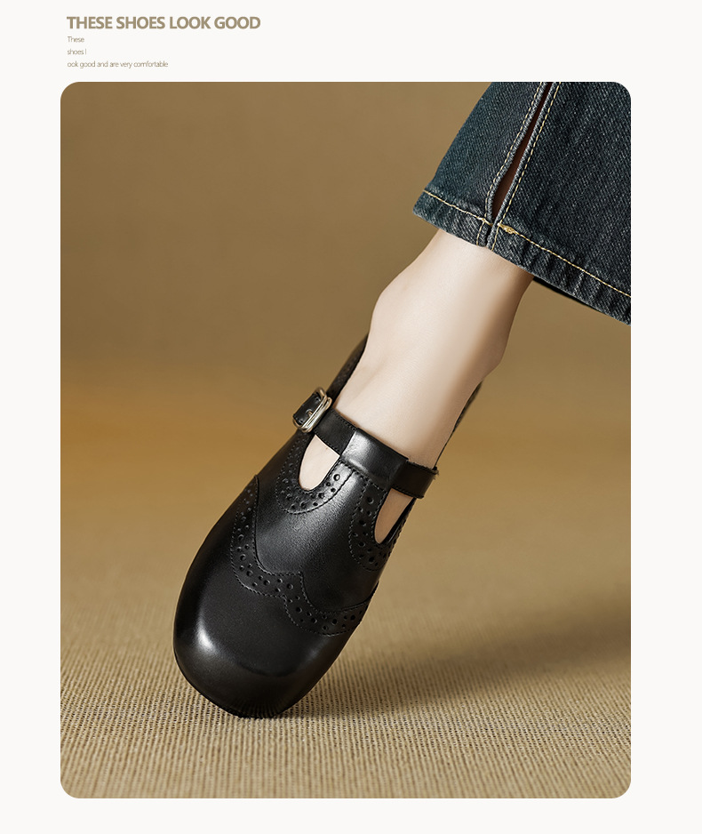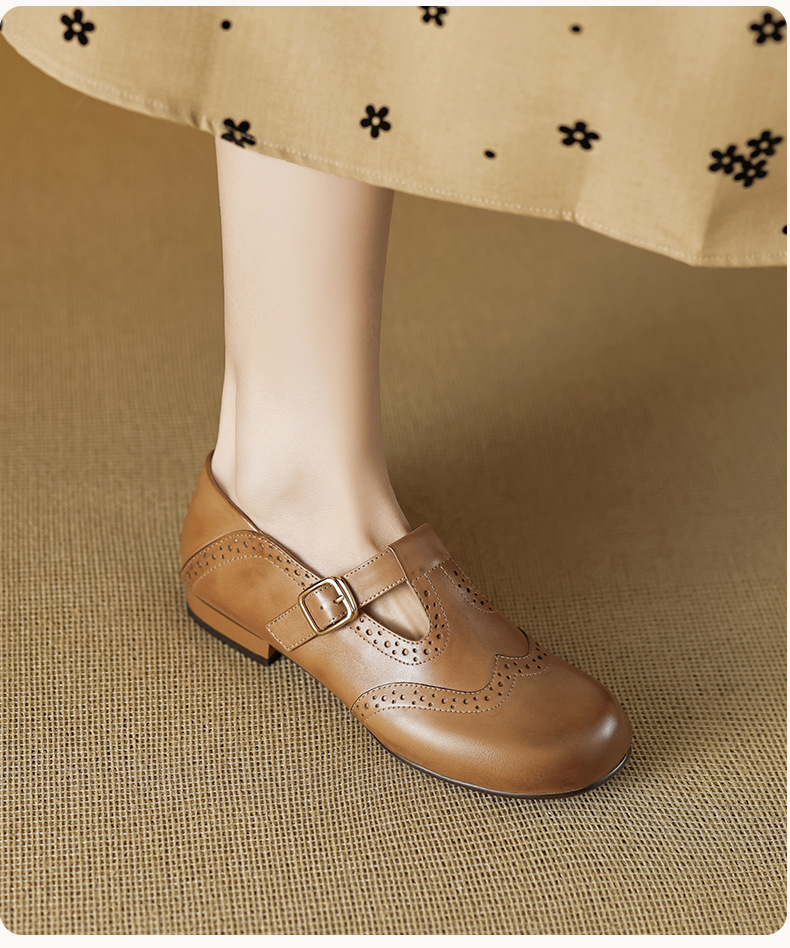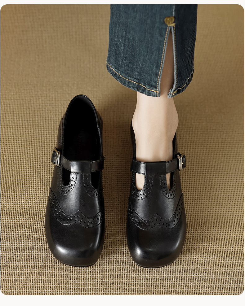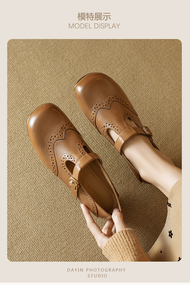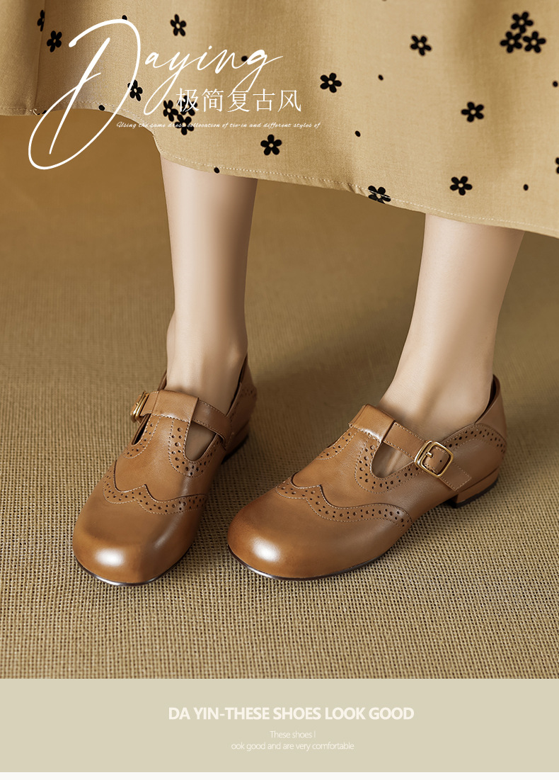 정품 가죽 빈티지 메리 제인과 함께 T 자형 가죽 신발 조각 된 로우 힐 이른 봄 새로운 예술적 라운드 발가락 플랫 싱글 레이어 신발스토어 가기