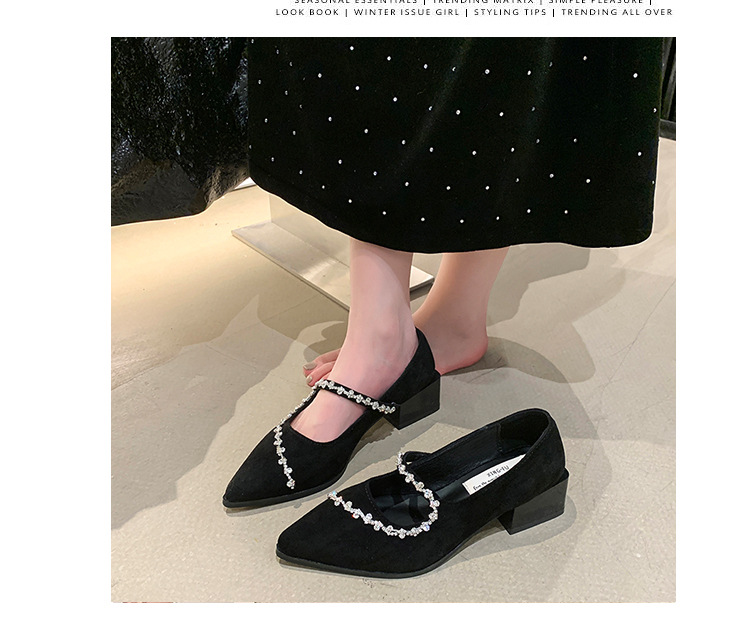 유럽 2025 년 봄과 가을 새로운 한국 스타일 싱글 레이어 신발 여성 로우 힐 얇은 가열 뾰족한 금속 스퀘어 버클 얕은 음소거 미드 힐 펌프스토어 가기