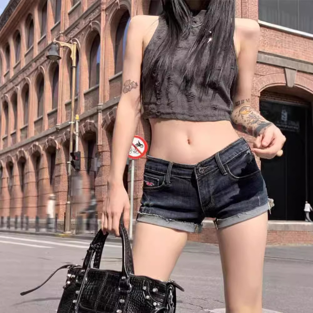 빈티지 달콤한 스파이스 소녀 데님 반바지 여성 여름 낮은 허리 슬리밍 컬 바지 작은 미국 엉덩이 핫 바지