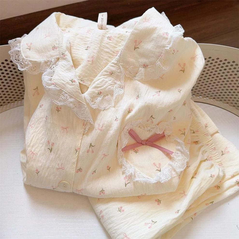소녀 잠옷 봄과 가을 새로운 스타일 간단하고 우아한 작은 꽃 구름 면 얇은 귀여운 레이스 긴 소매 바지 홈 옷
