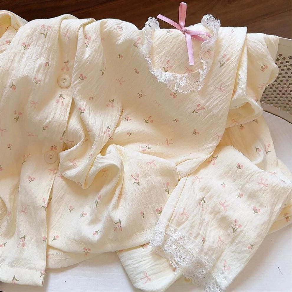 소녀 잠옷 봄과 가을 새로운 스타일 간단하고 우아한 작은 꽃 구름 면 얇은 귀여운 레이스 긴 소매 바지 홈 옷스토어 가기