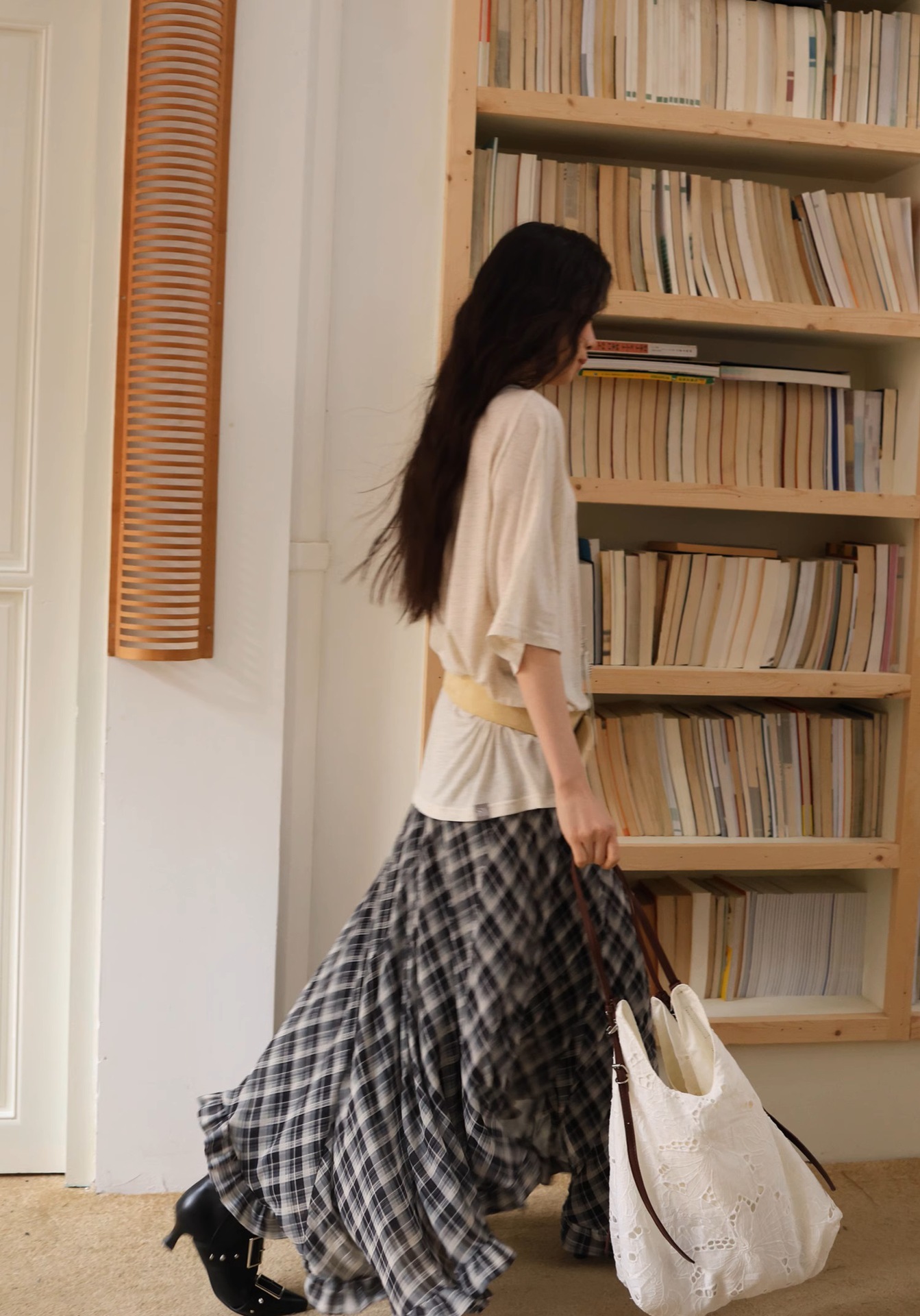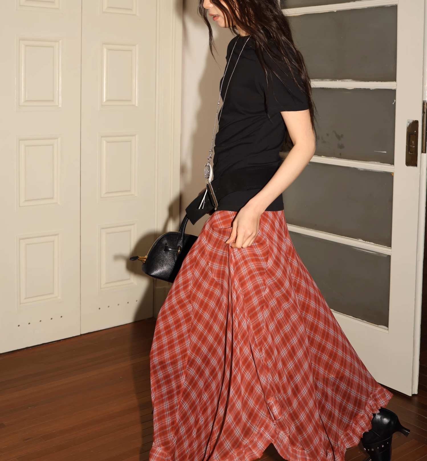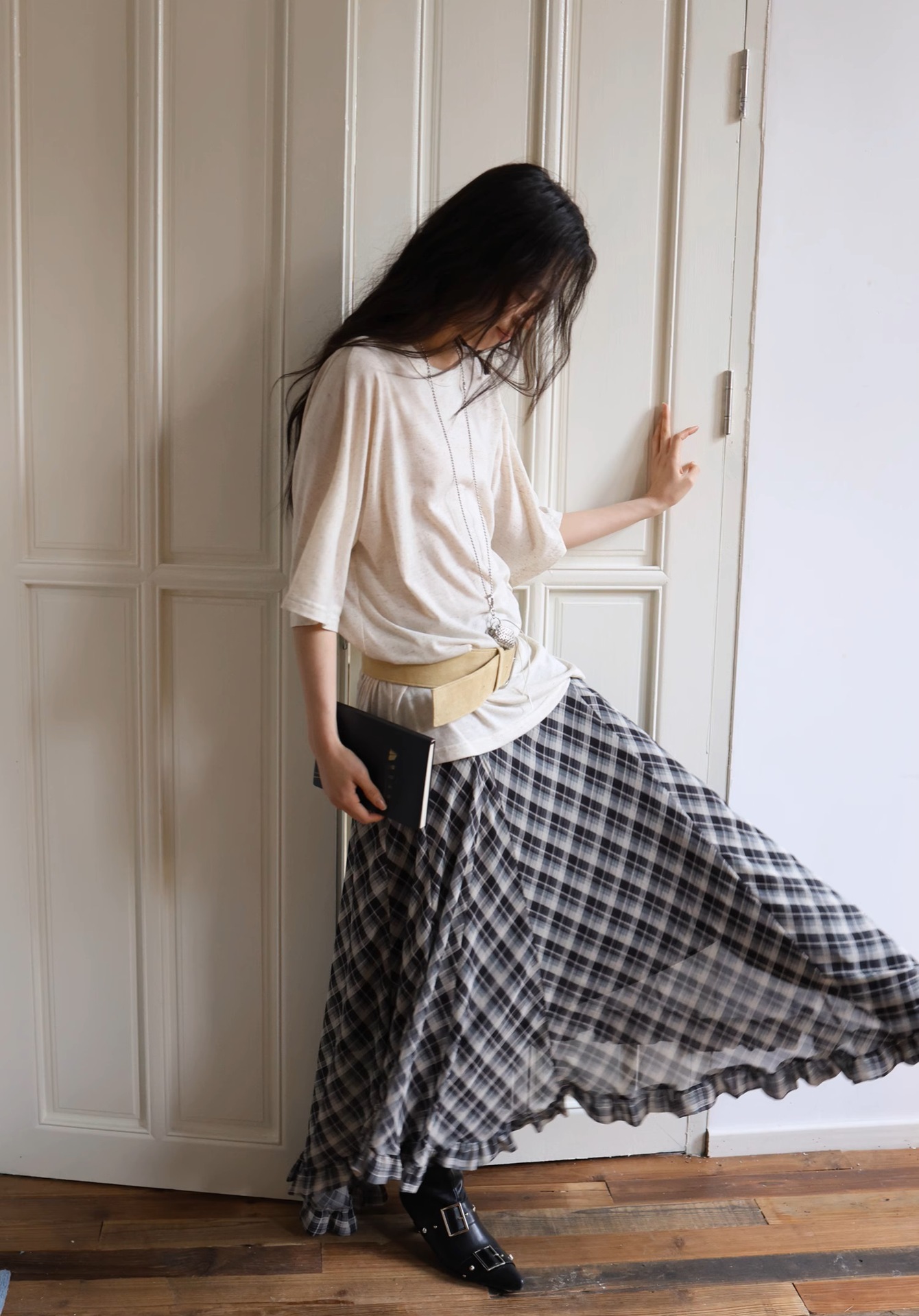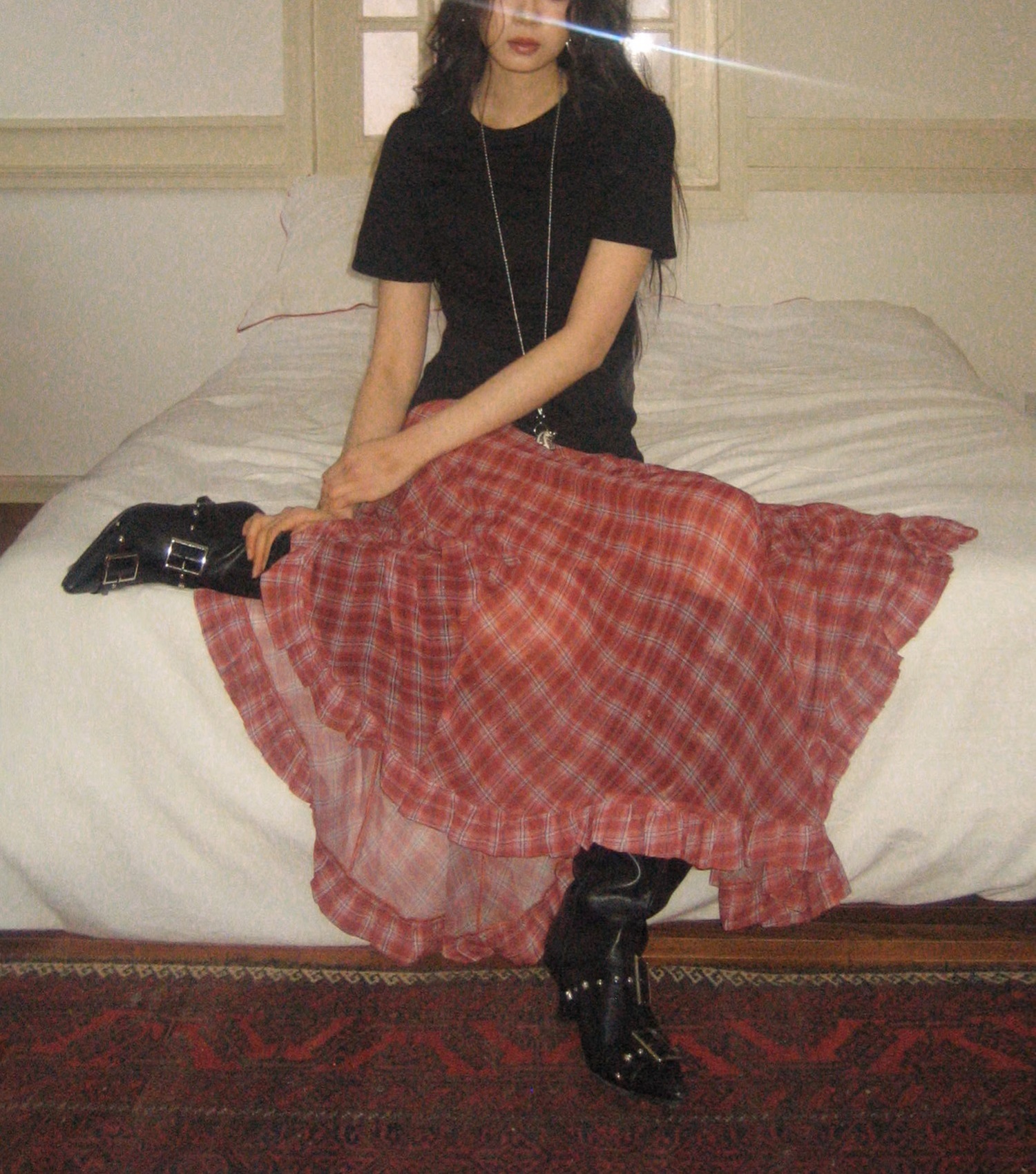 SUPERSCAPE Subo 이른 봄 레트로 2 색 격자 무늬 중간 허리 불규칙한 귀 머리 중간 길이 쉬폰