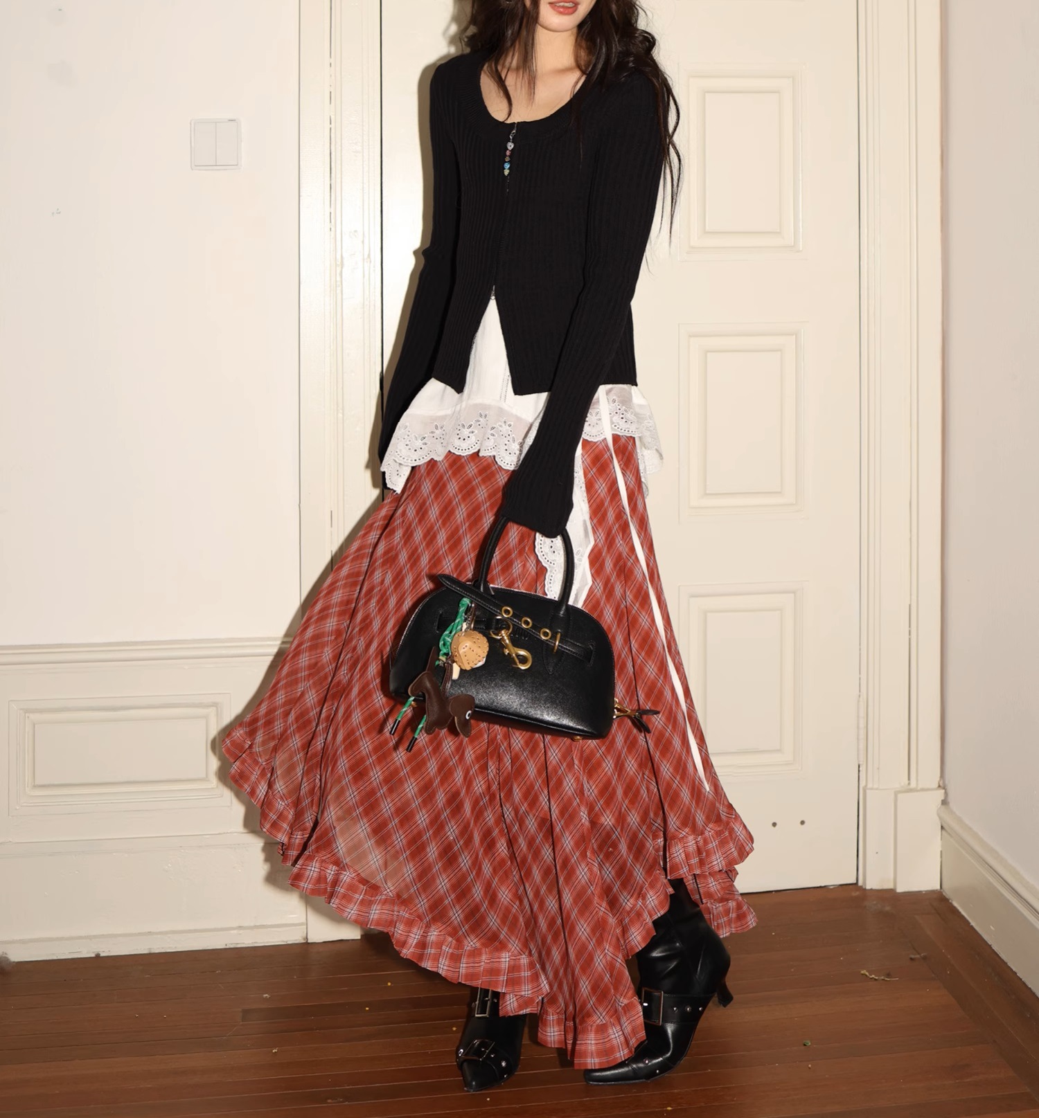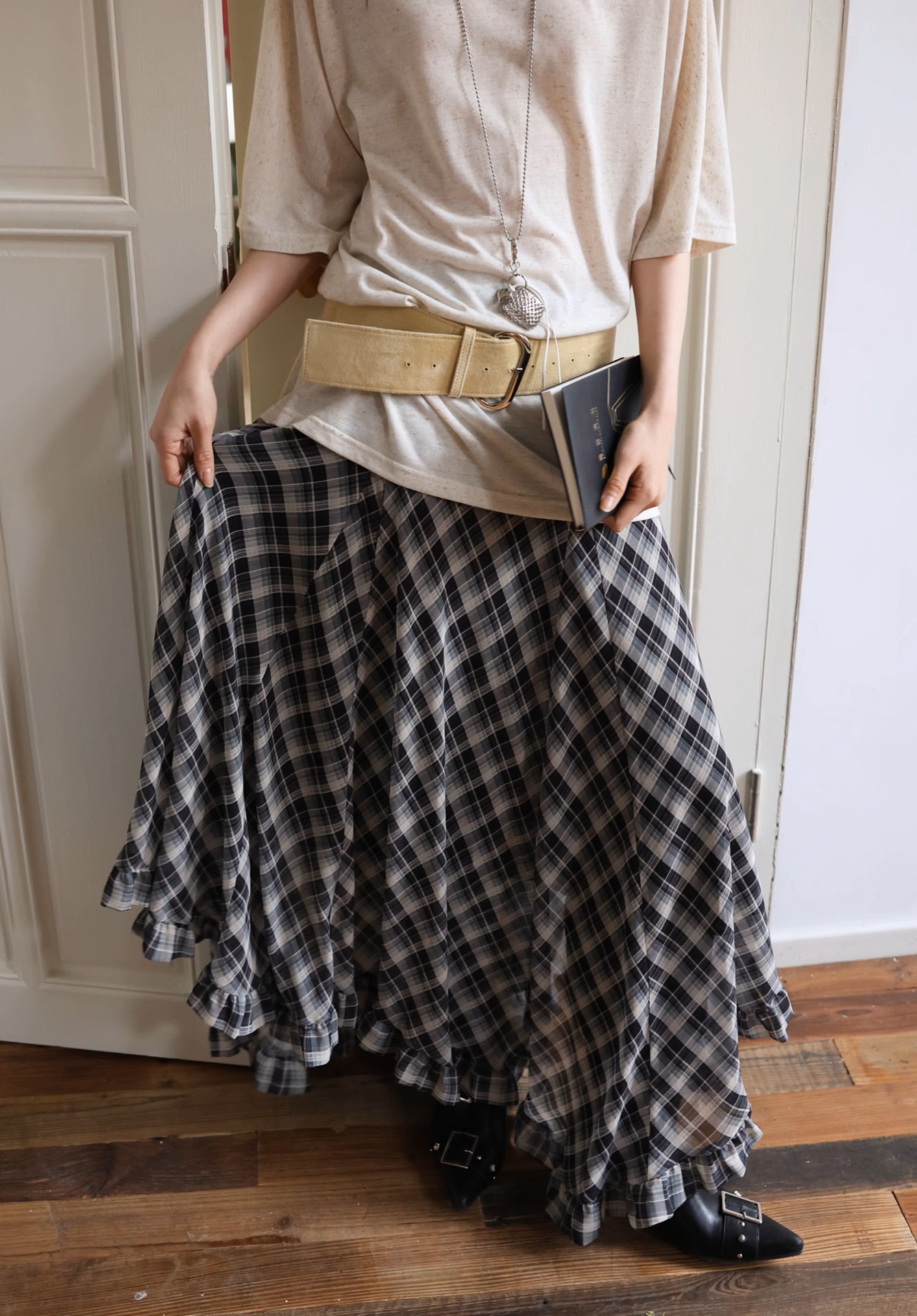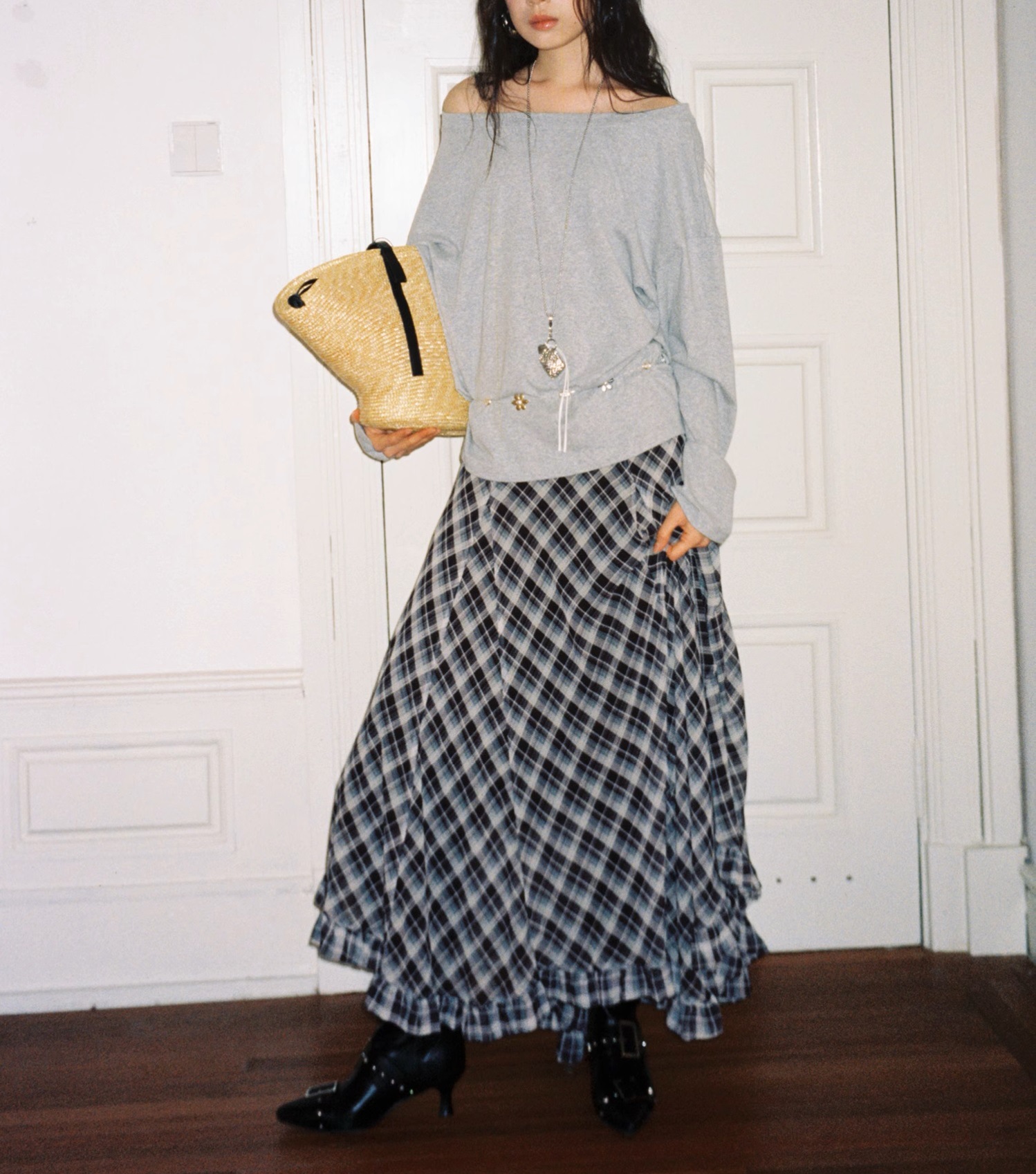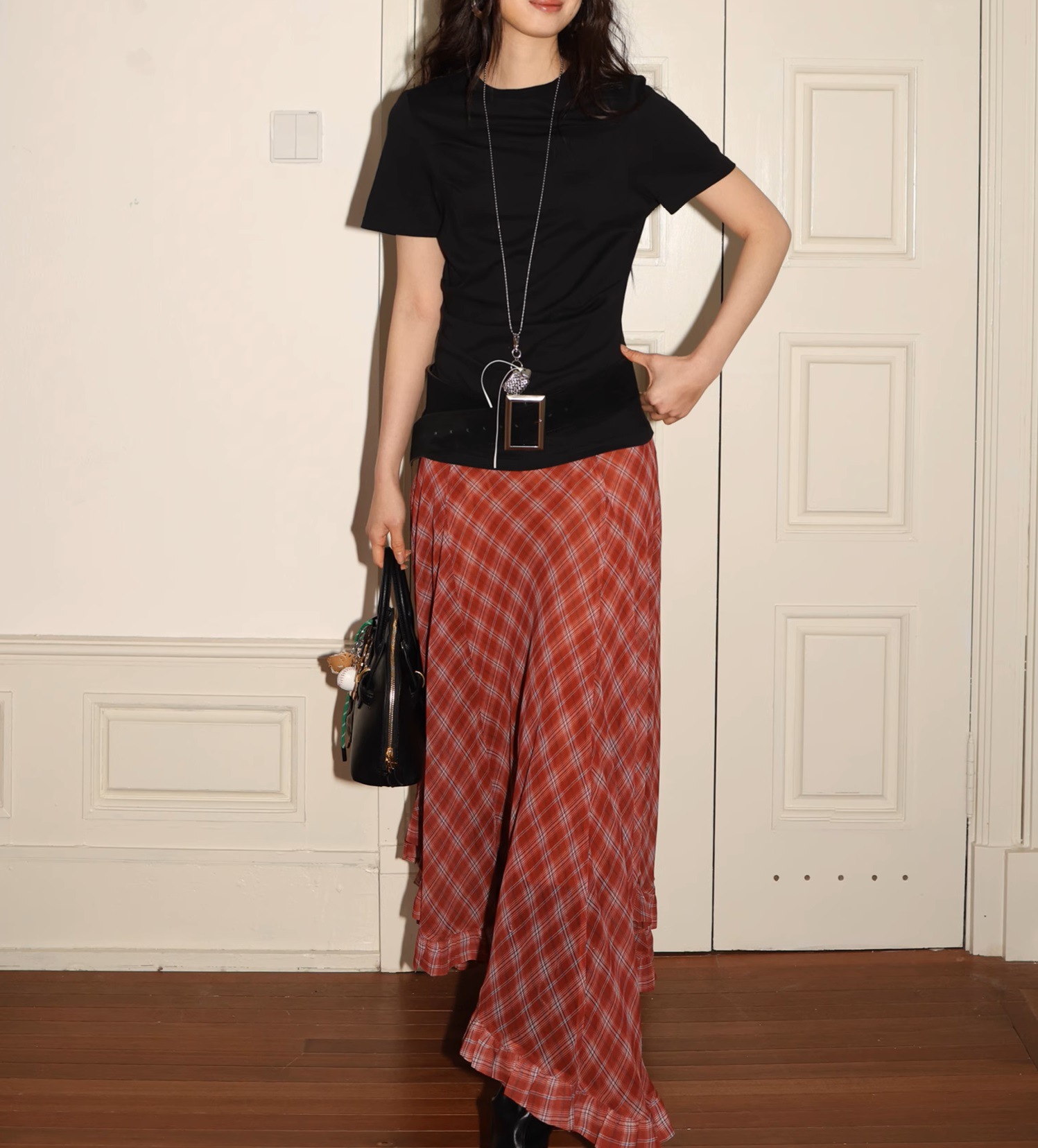 SUPERSCAPE Subo 이른 봄 레트로 2 색 격자 무늬 중간 허리 불규칙한 귀 머리 중간 길이 쉬폰