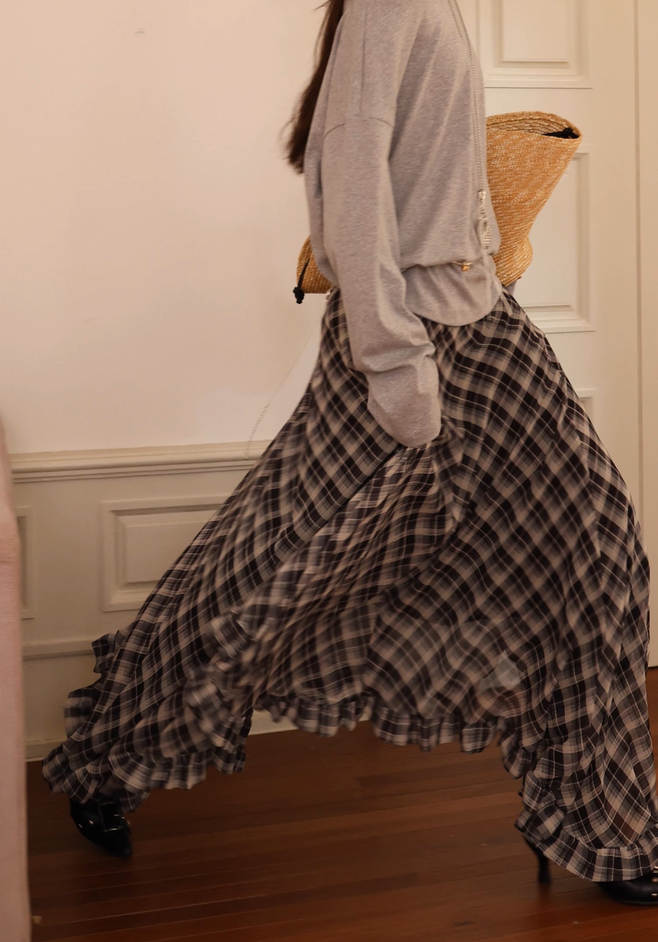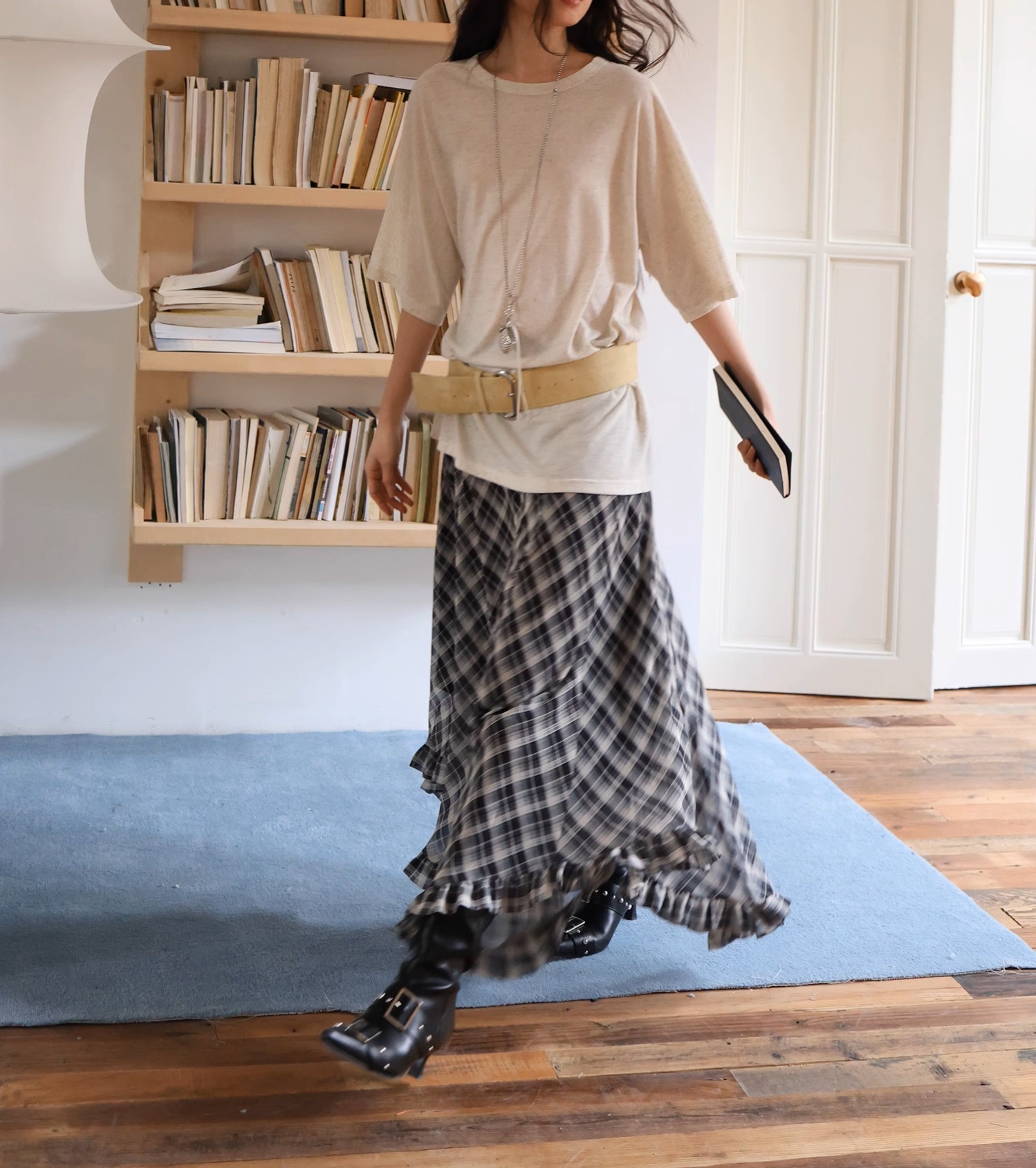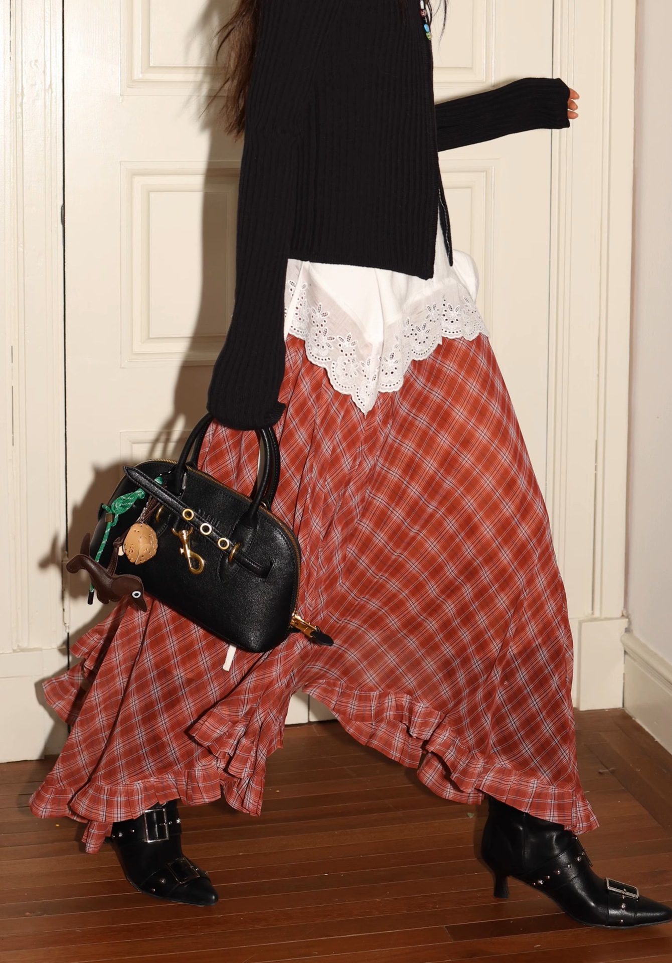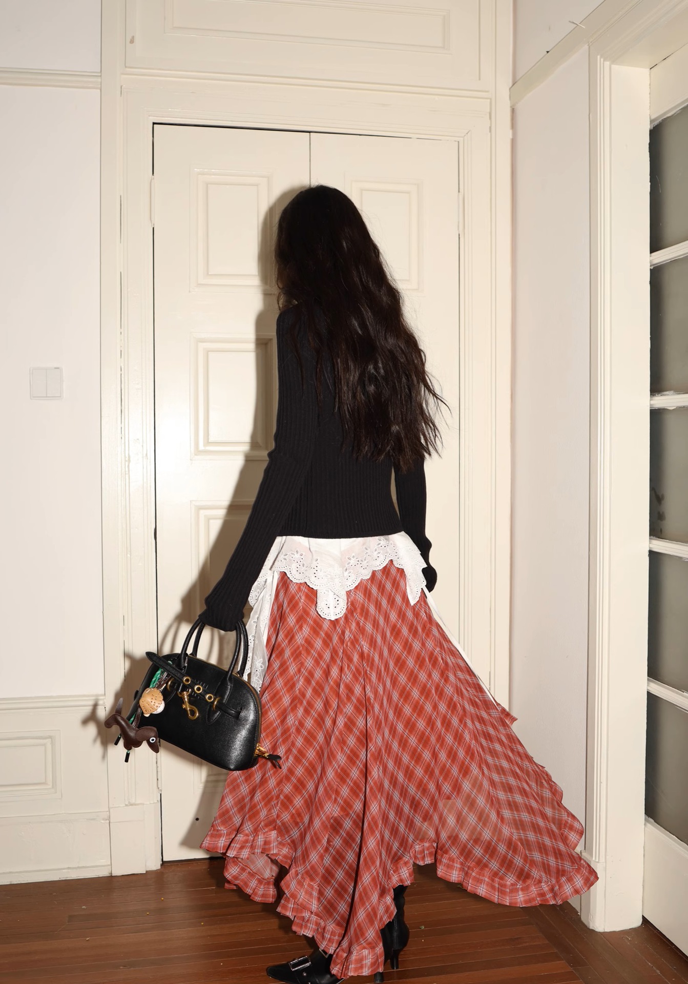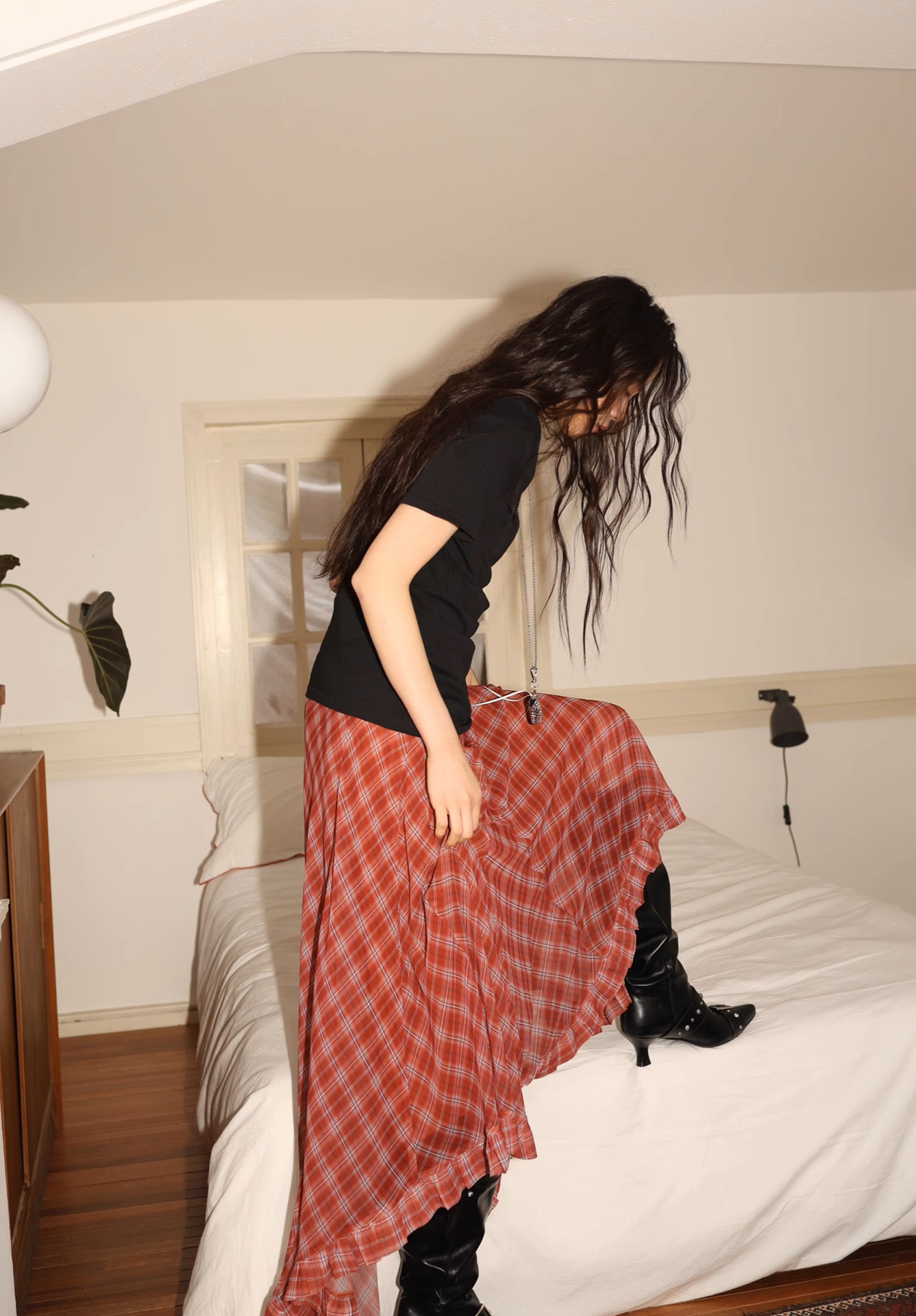 SUPERSCAPE Subo 이른 봄 레트로 2 색 격자 무늬 중간 허리 불규칙한 귀 머리 중간 길이 쉬폰