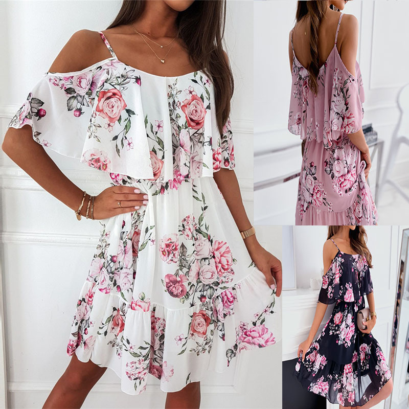 국경 간 대외 무역 유럽과 미국 여성 의류 아마존 2025 여름 패션 쉬폰 인쇄 오프 숄더 섹시한 슬링 원피스스토어 가기