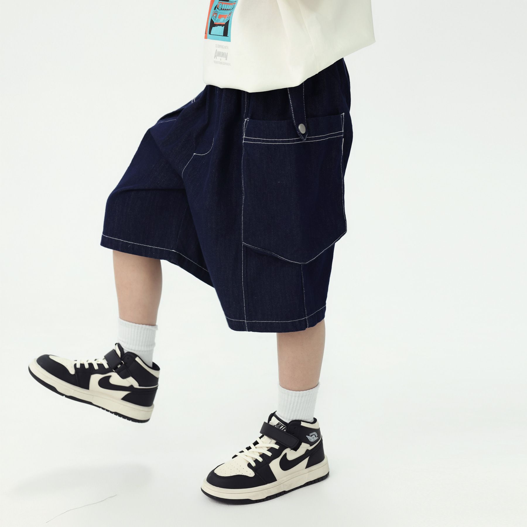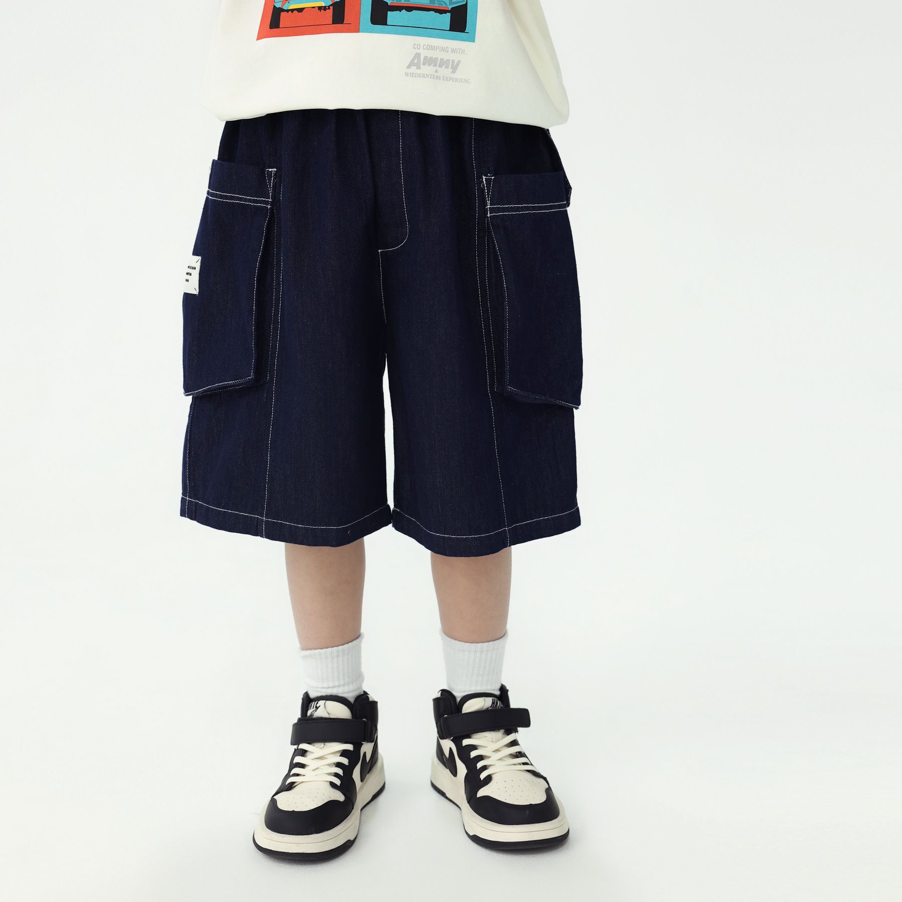 봄과 여름 2025 새로운 스타일 중대형 어린이 작업복 스타일 5 점 바지 소년의 느슨한 서양식 바지 데님 반바지스토어 가기