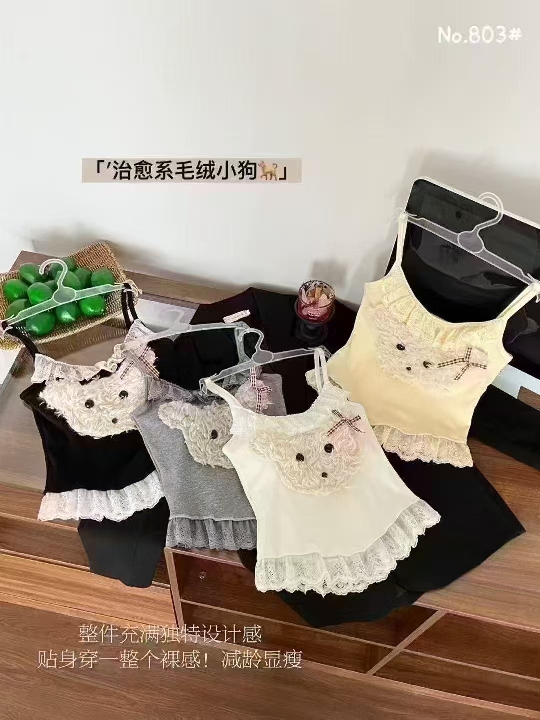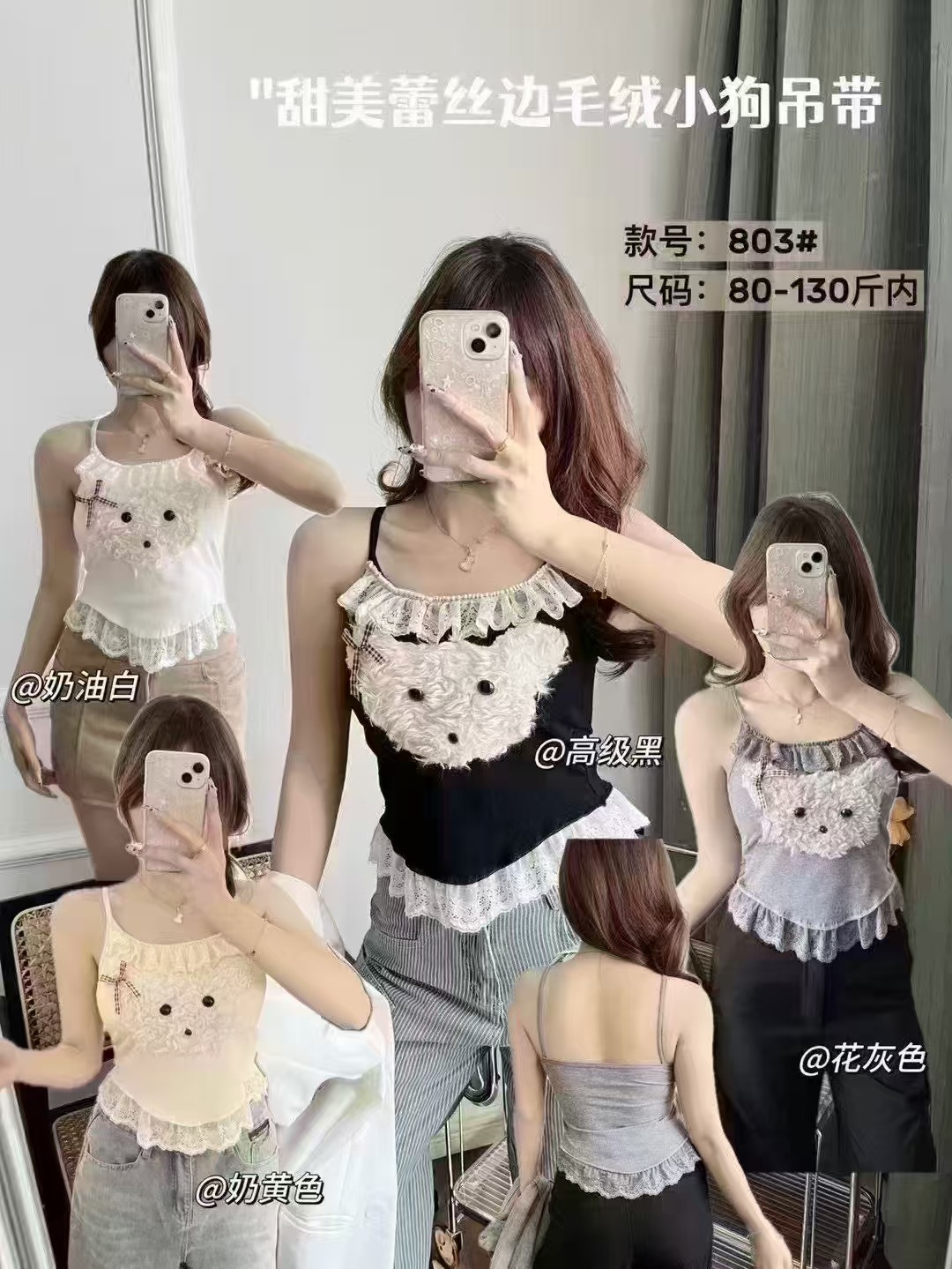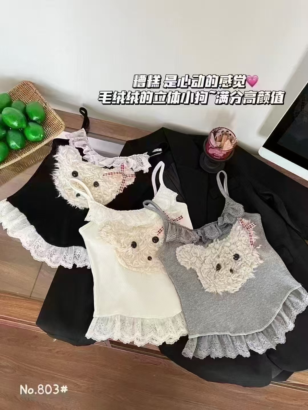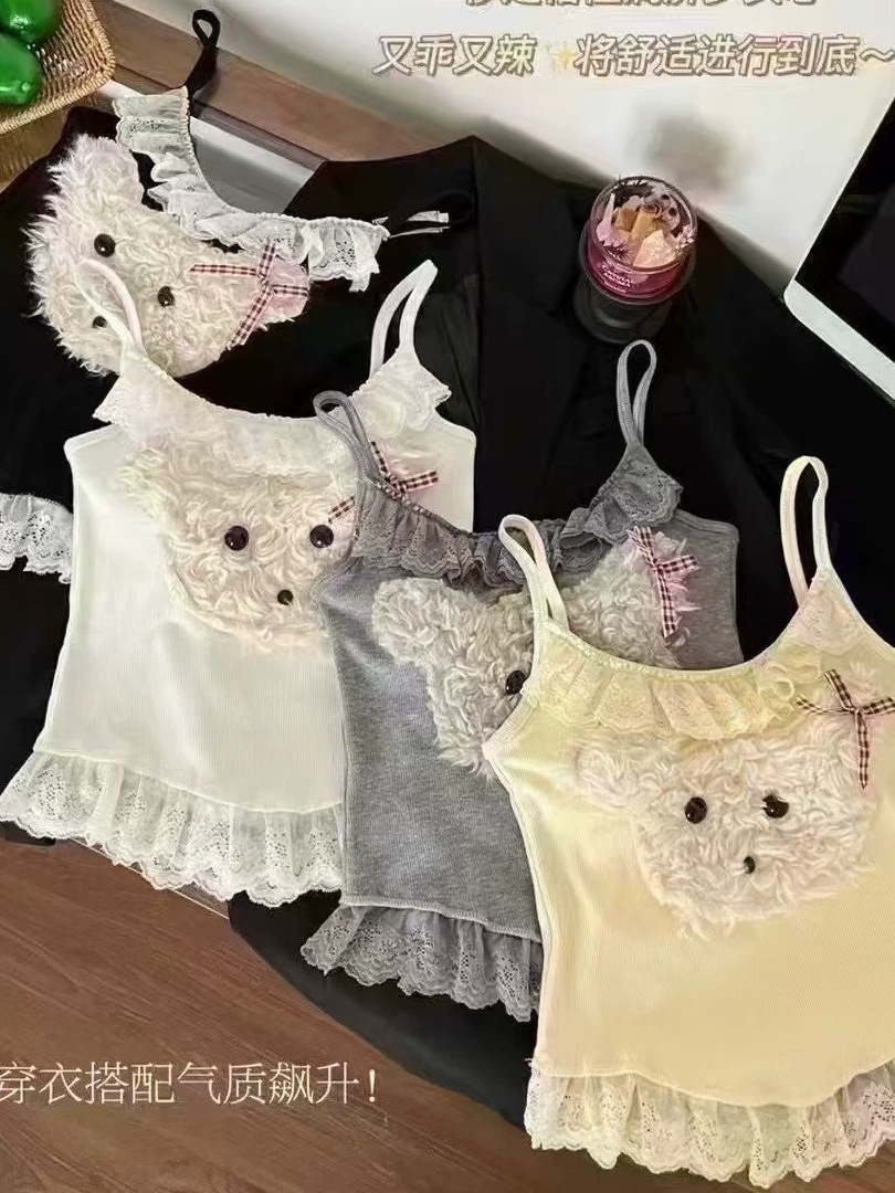 18803 # 봄과 여름에 입기 좋은 달콤한 레이스 장식의 플러시 강아지 캐미솔 여성용 가슴 패드 내장, 이너웨어 또는 아우터웨어로 착용 가능, 핫걸 스타일