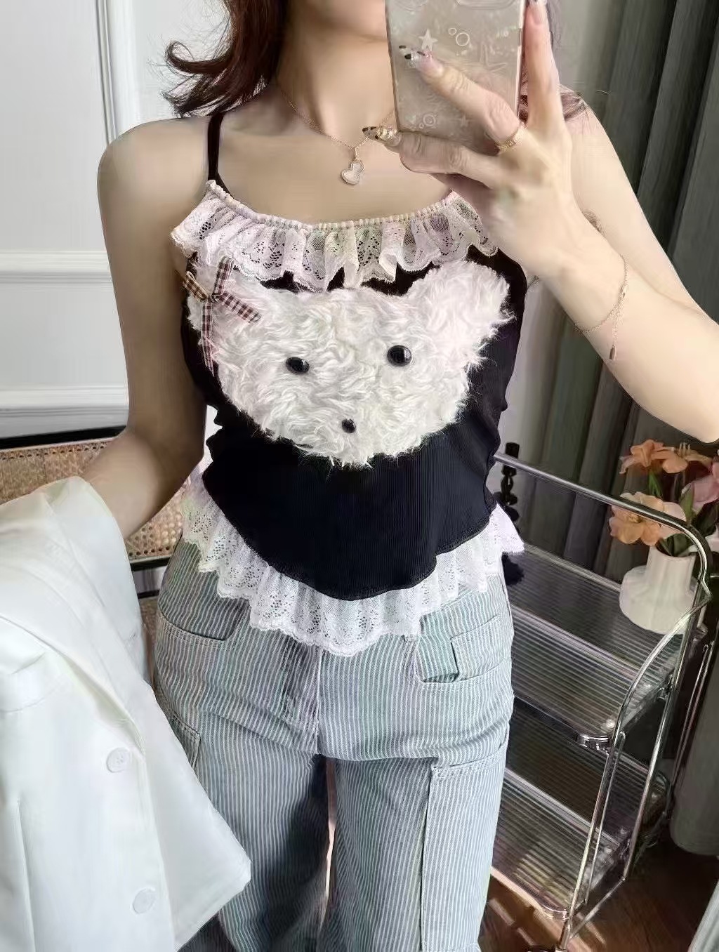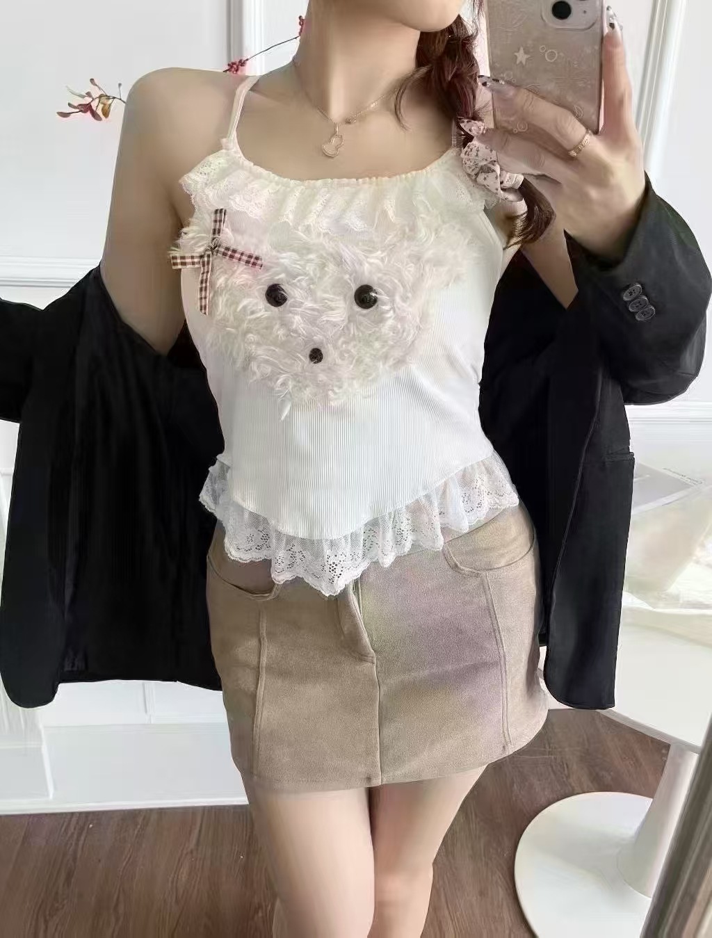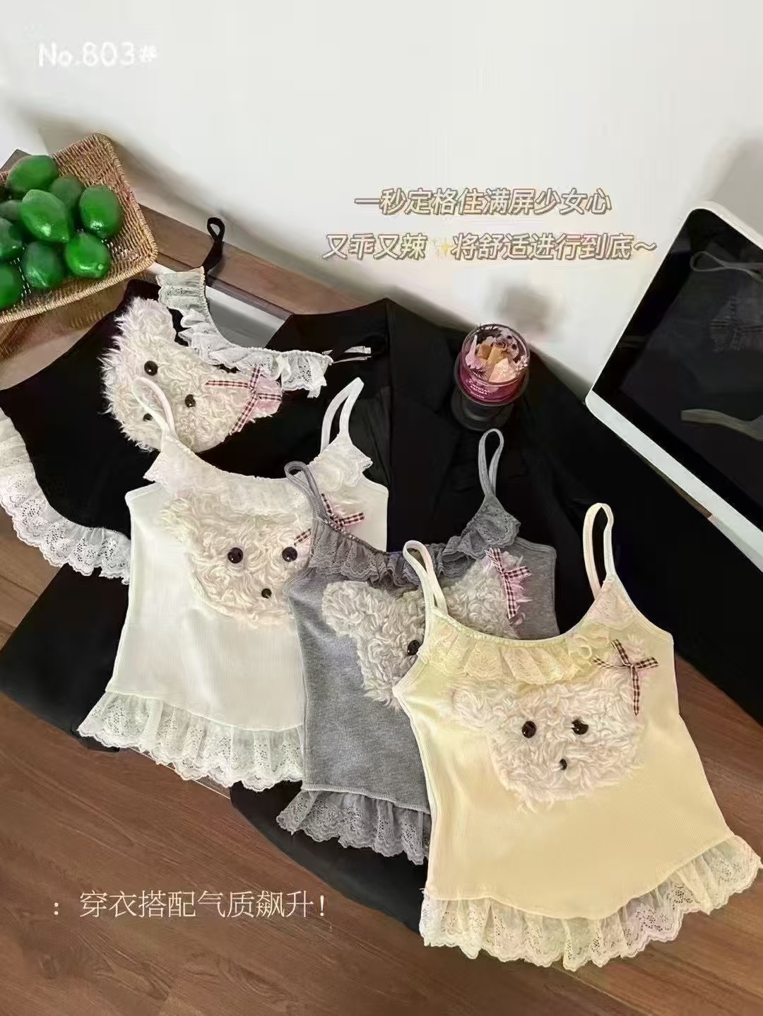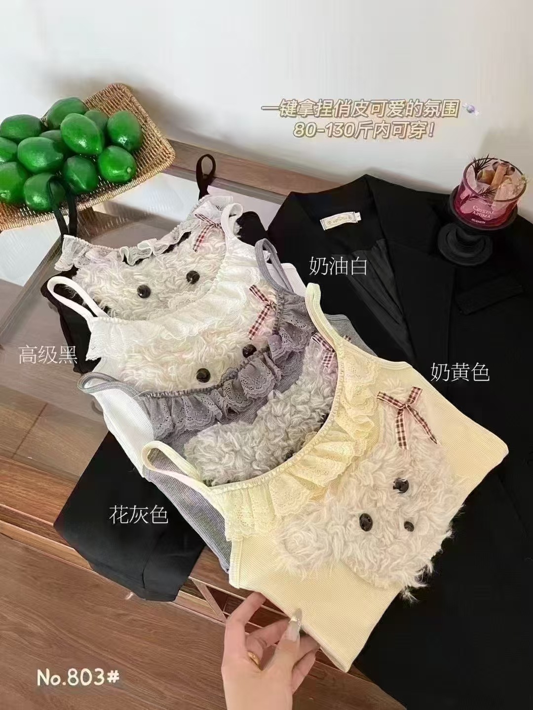 18803 # 봄과 여름에 입기 좋은 달콤한 레이스 장식의 플러시 강아지 캐미솔 여성용 가슴 패드 내장, 이너웨어 또는 아우터웨어로 착용 가능, 핫걸 스타일