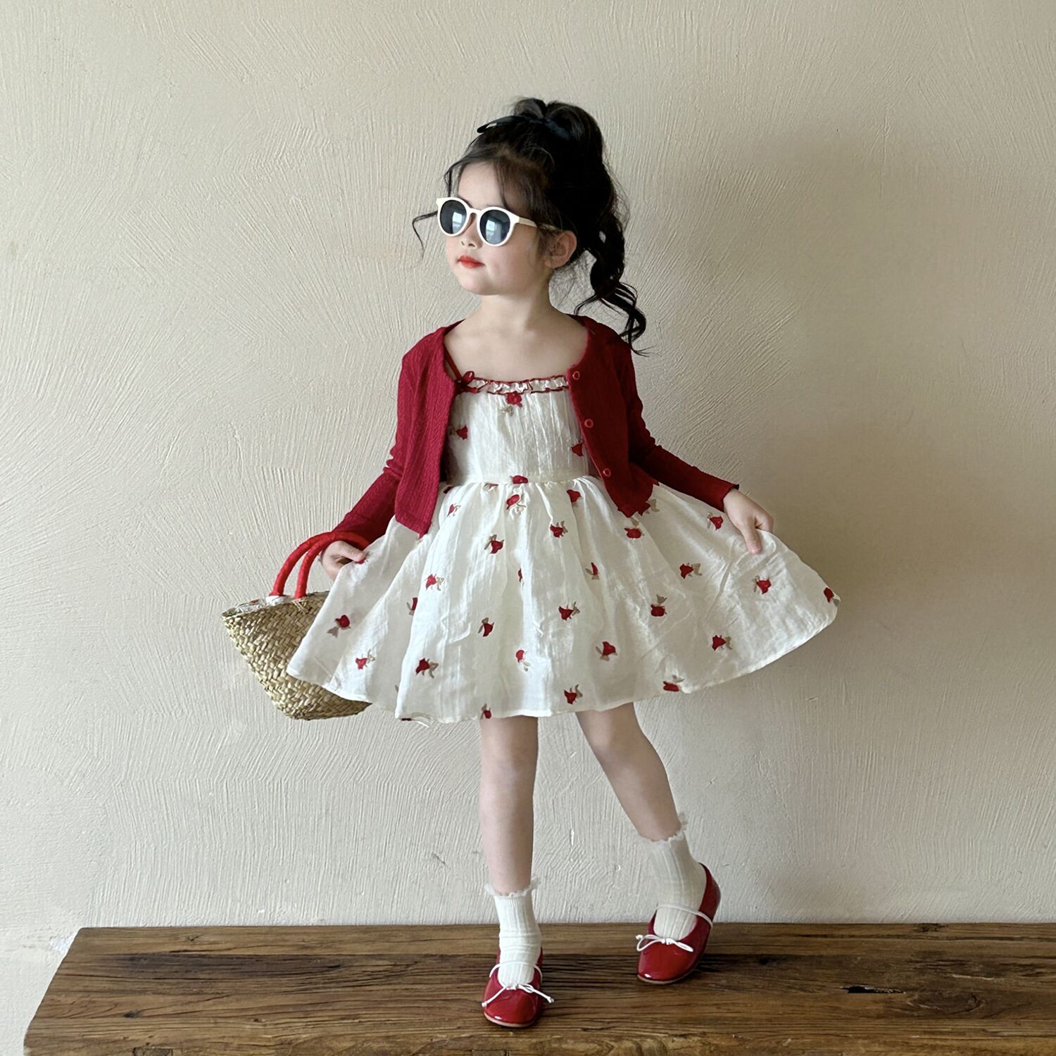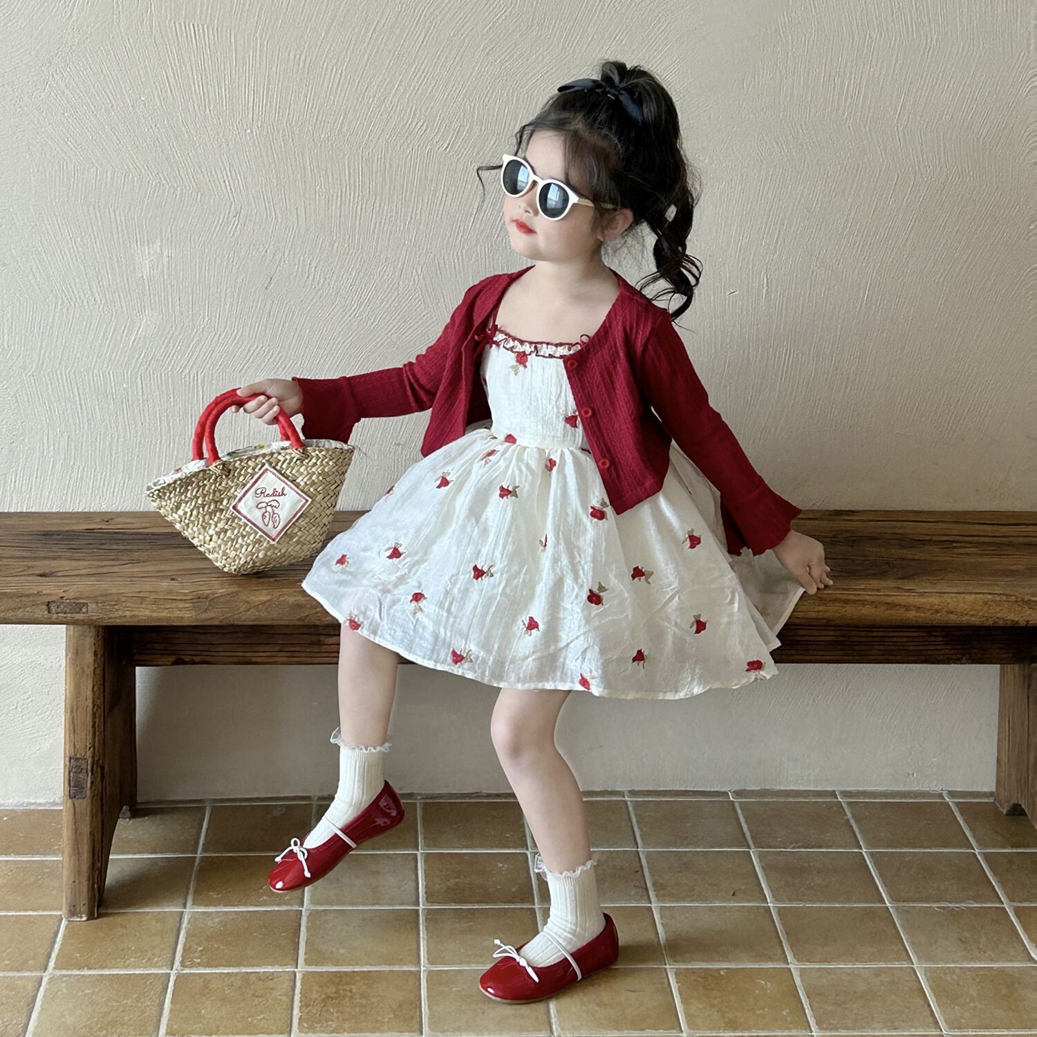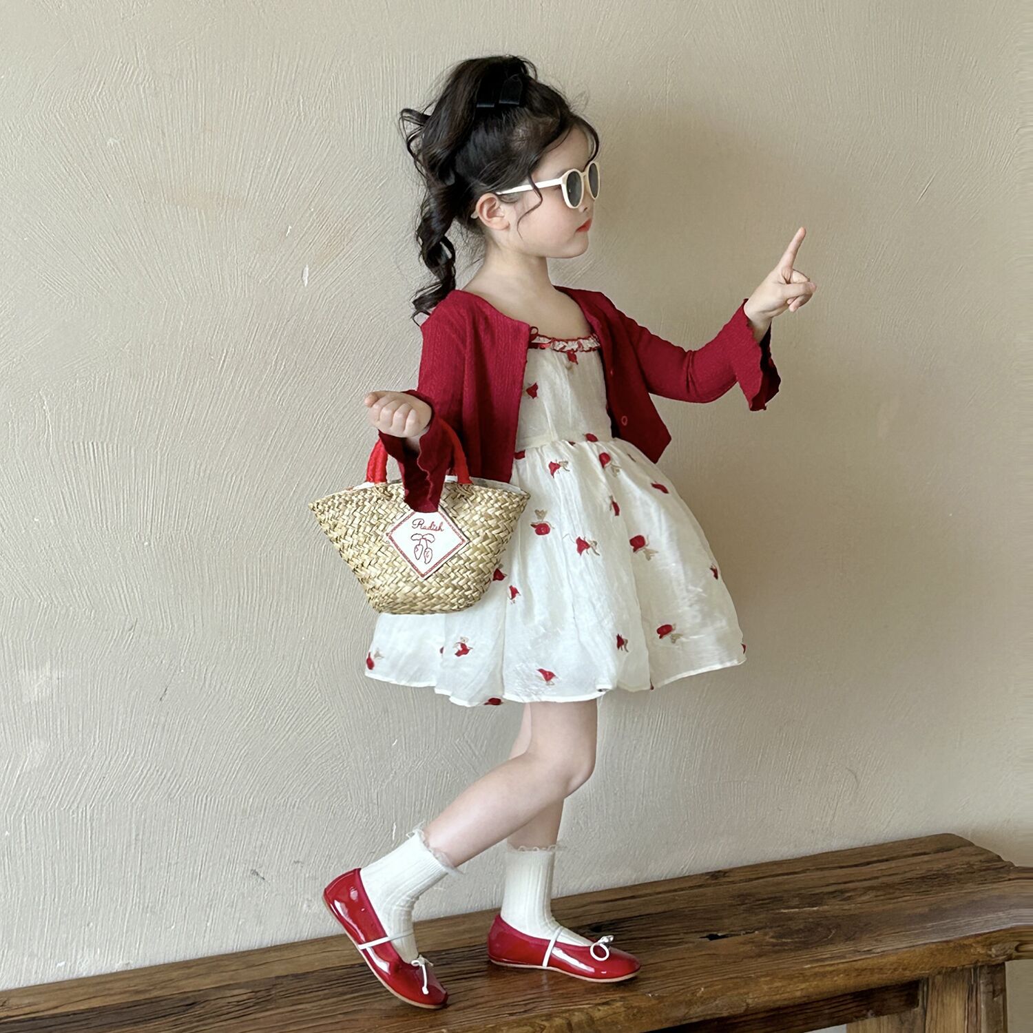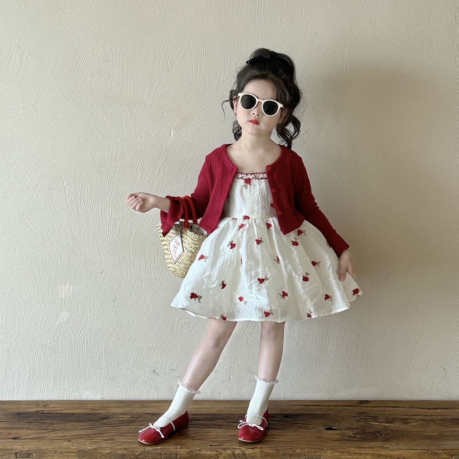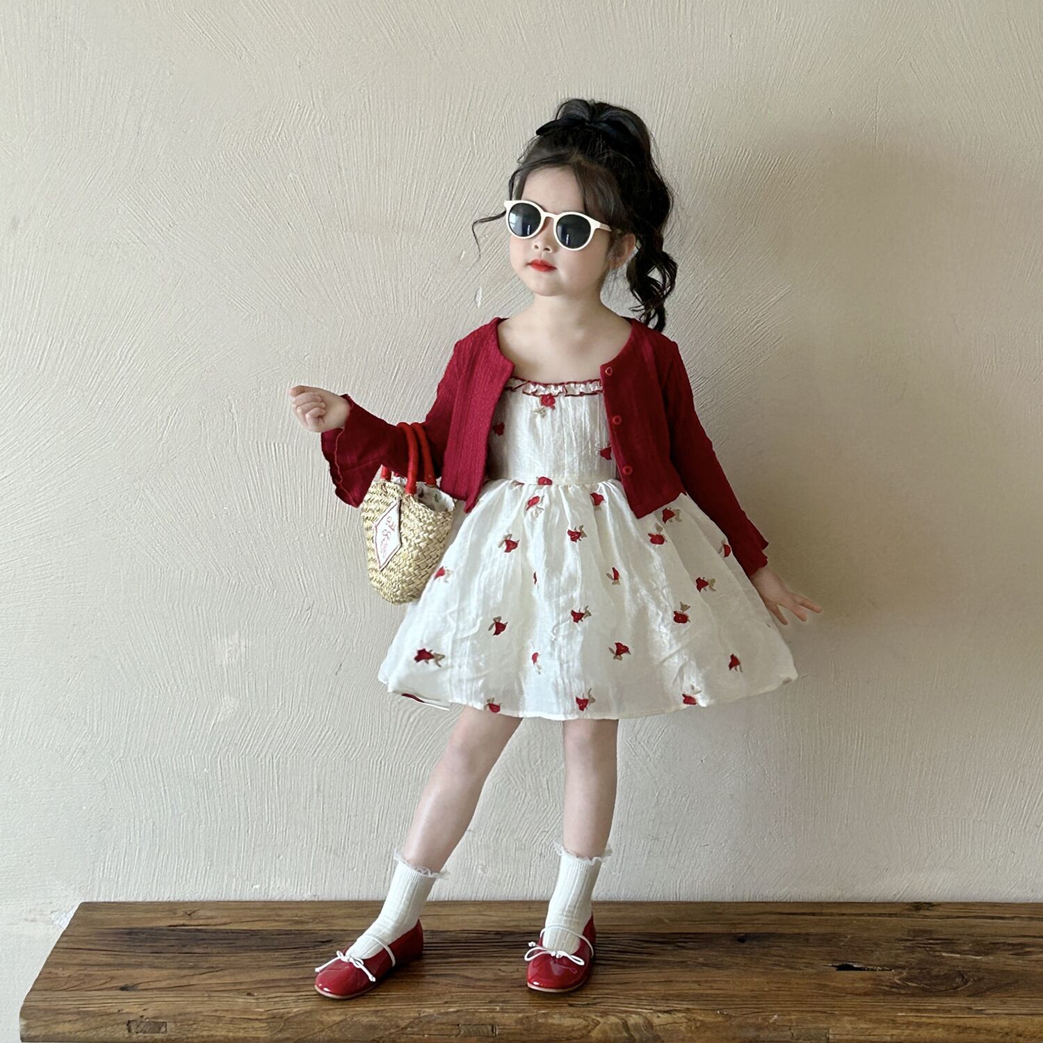 소녀의 붉은 꽃 원피스 2025 봄과 여름 새로운 아기 소녀의 슬립 스커트 니트 스웨터 카디건 코트 세트스토어 가기