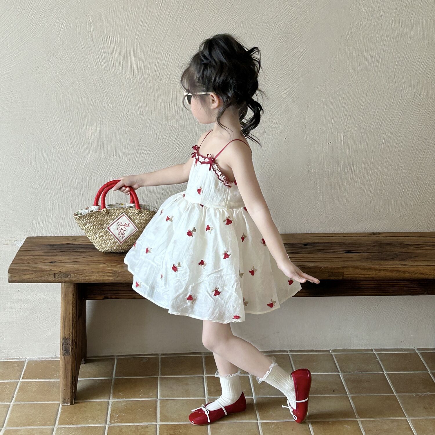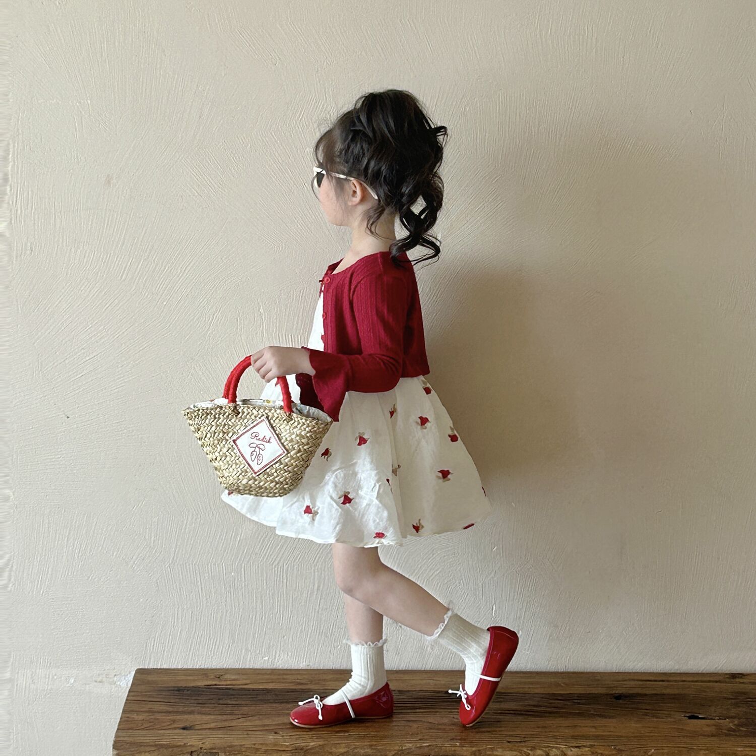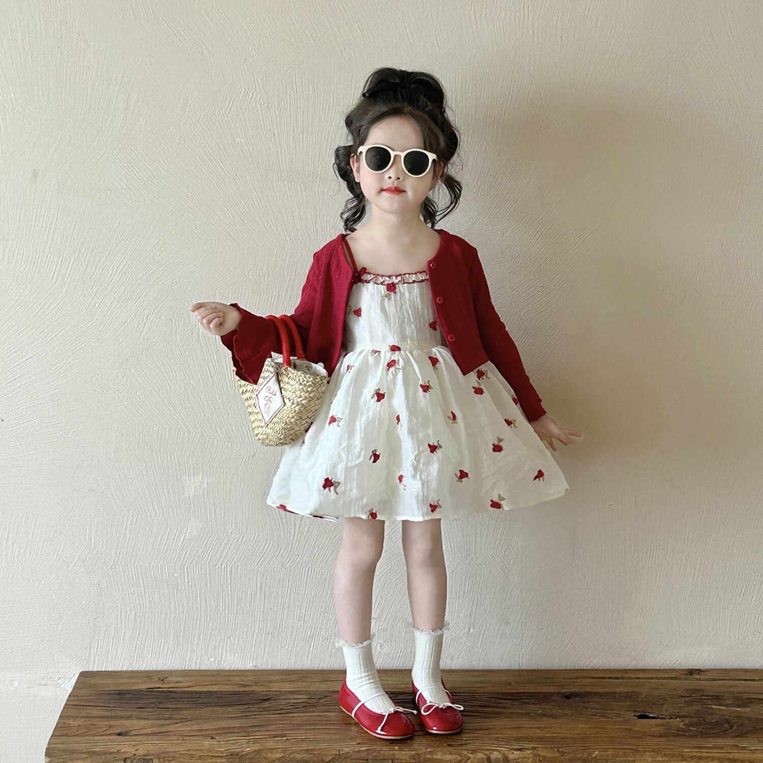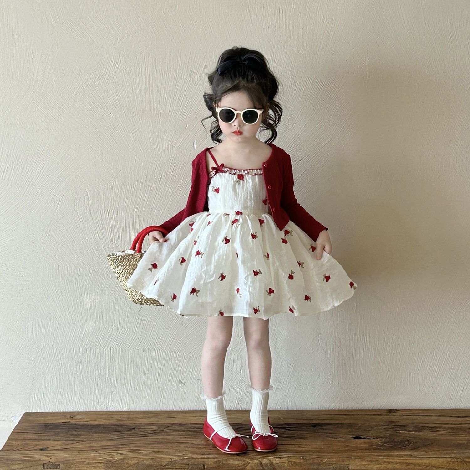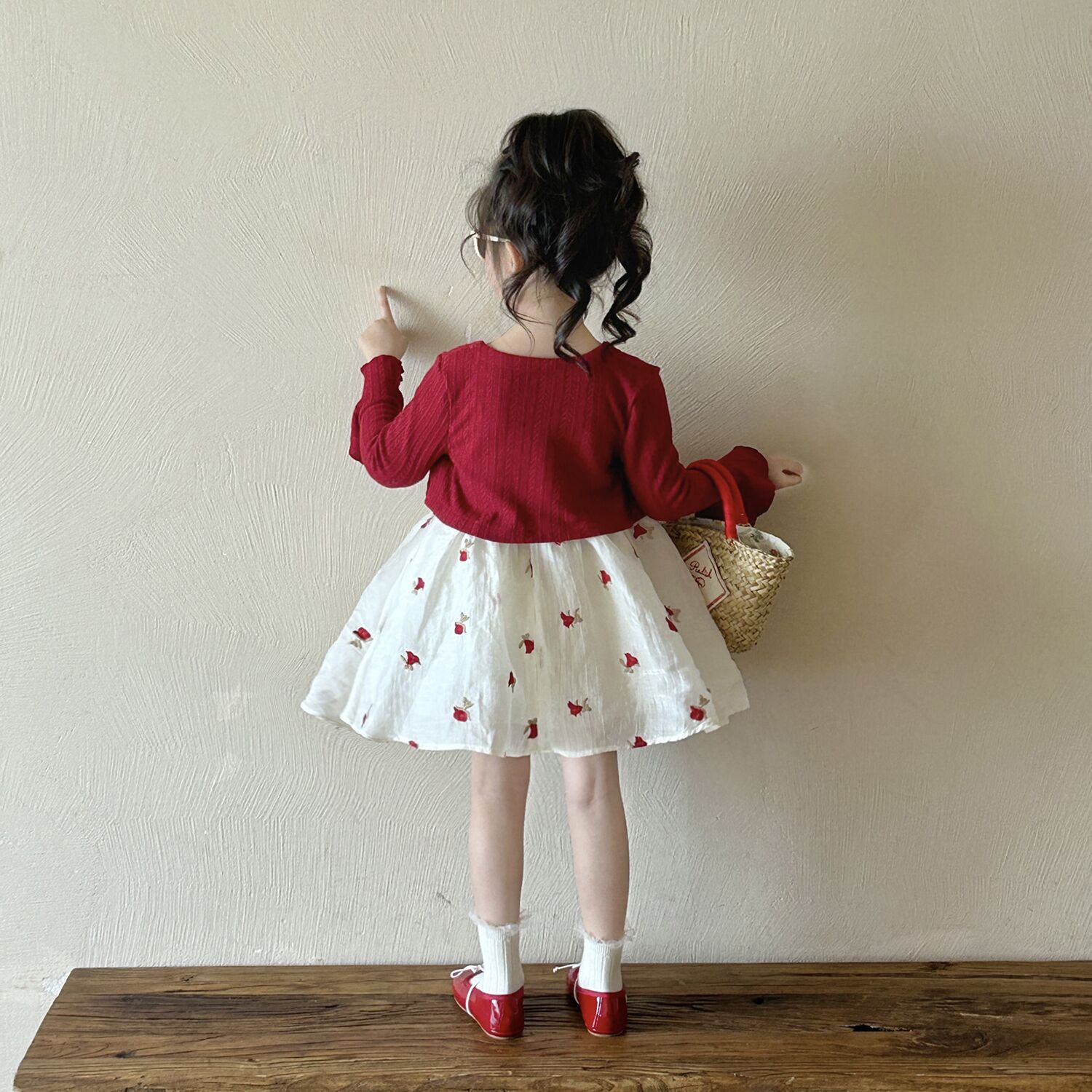 소녀의 붉은 꽃 원피스 2025 봄과 여름 새로운 아기 소녀의 슬립 스커트 니트 스웨터 카디건 코트 세트스토어 가기