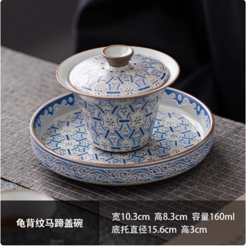 파란색과 흰색 달 화이트 루 가마 선택 실크와 실버 호버링 Sancai Bowl 회전 가능한 고급 쿵푸 티 세트 티 보울 티 아트 시가스토어 가기
