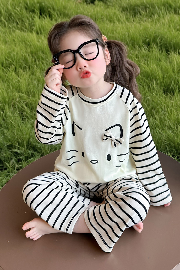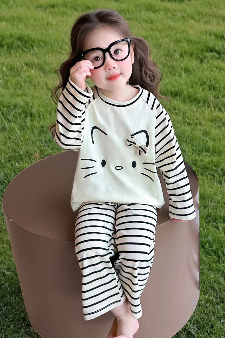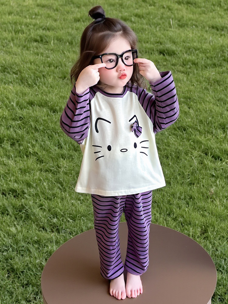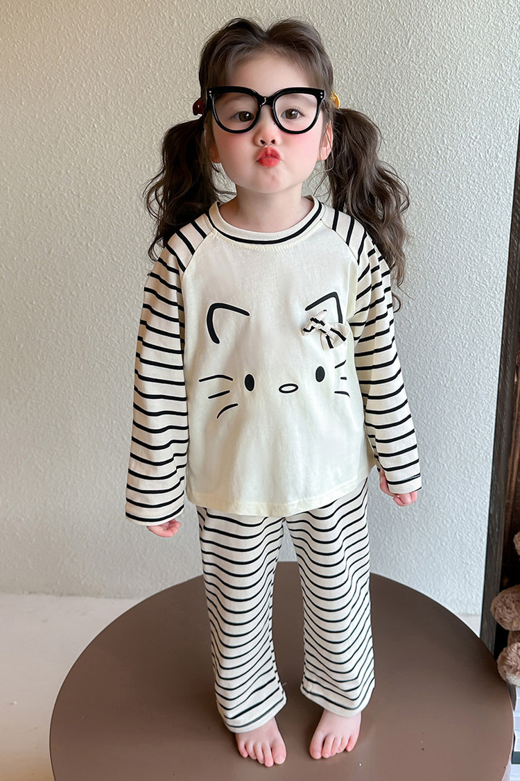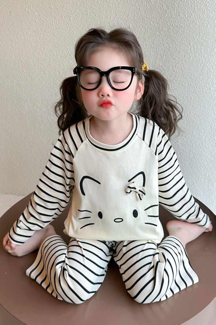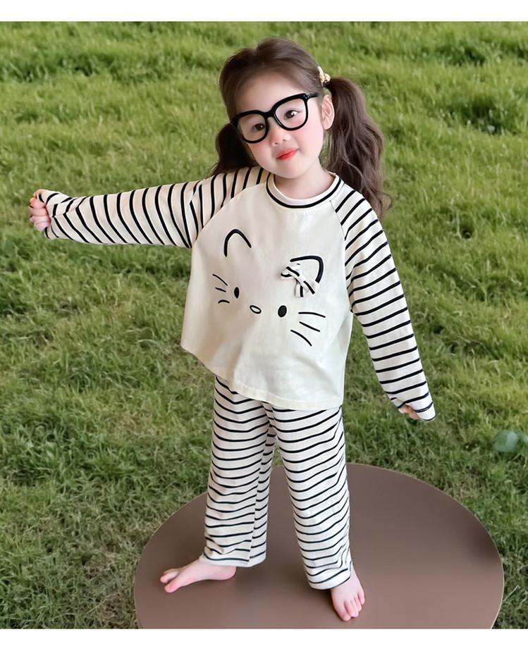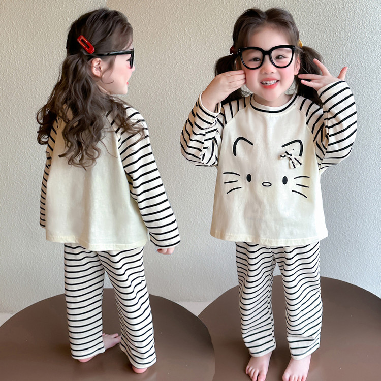 2025 여아 봄 가을 신상 잠옷 여자 아기 고양이 홈웨어 투피스 세트 어린이 스트라이프 세트