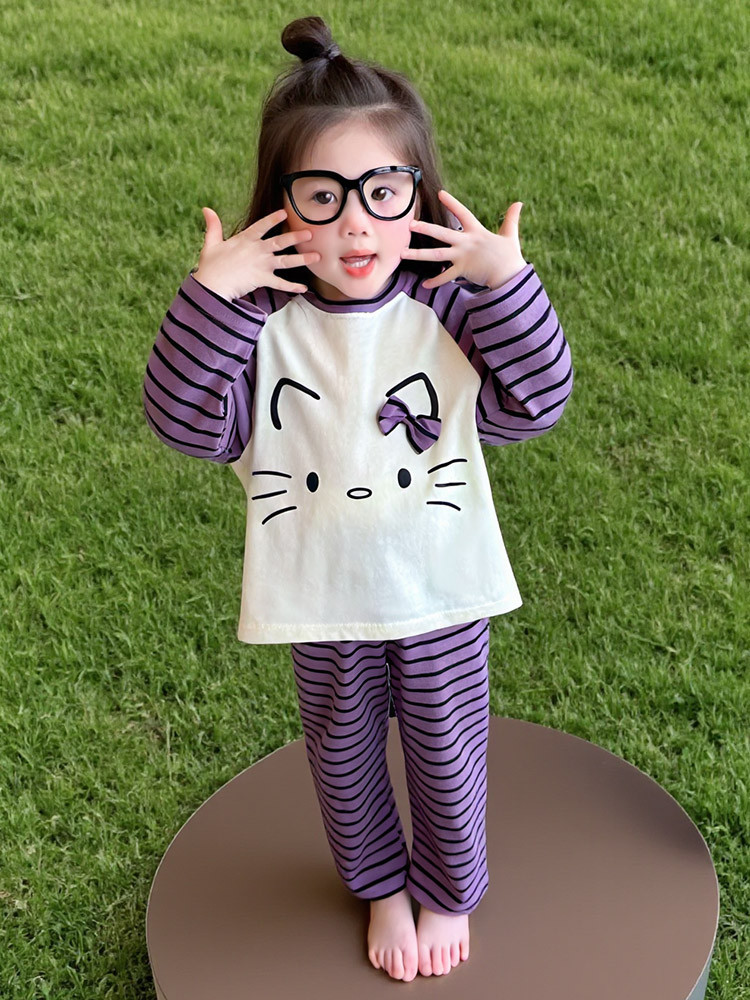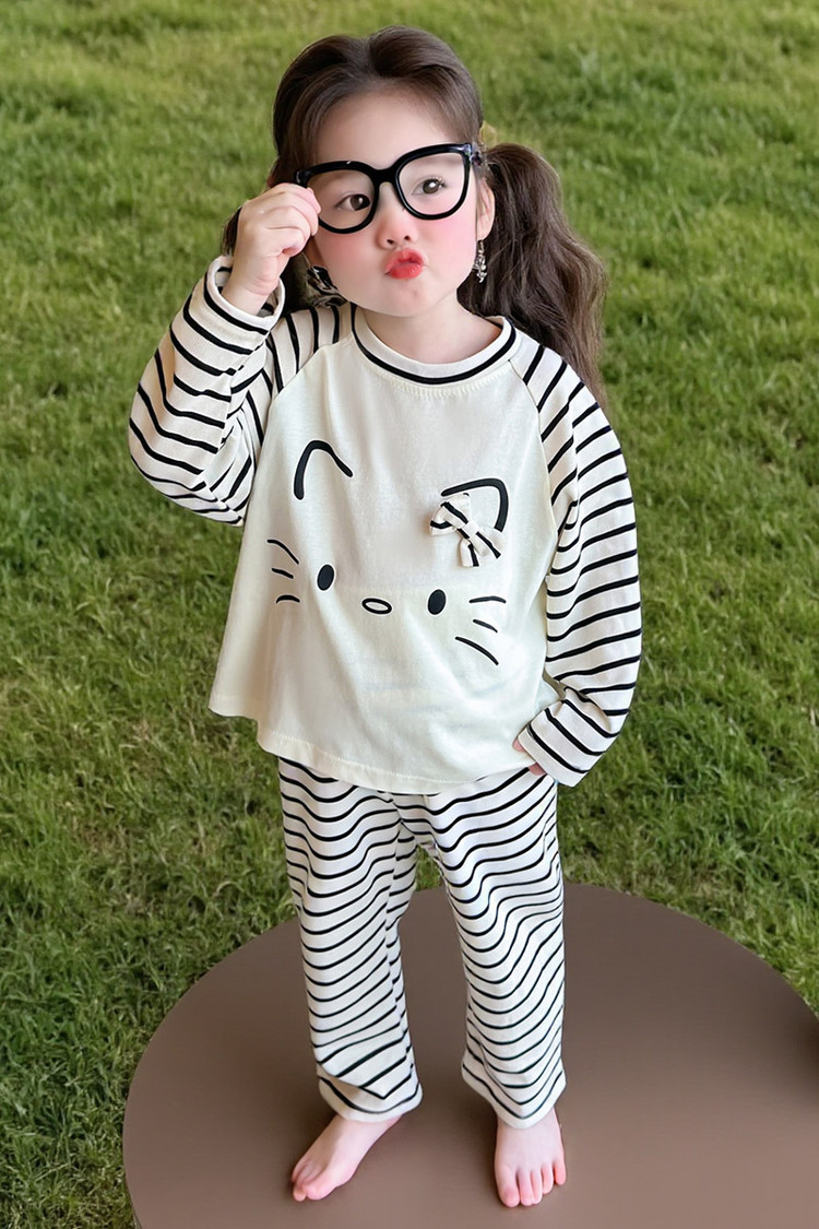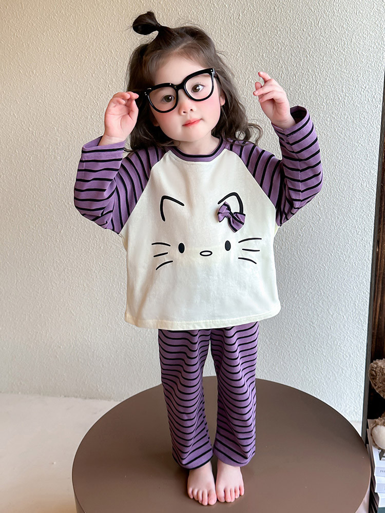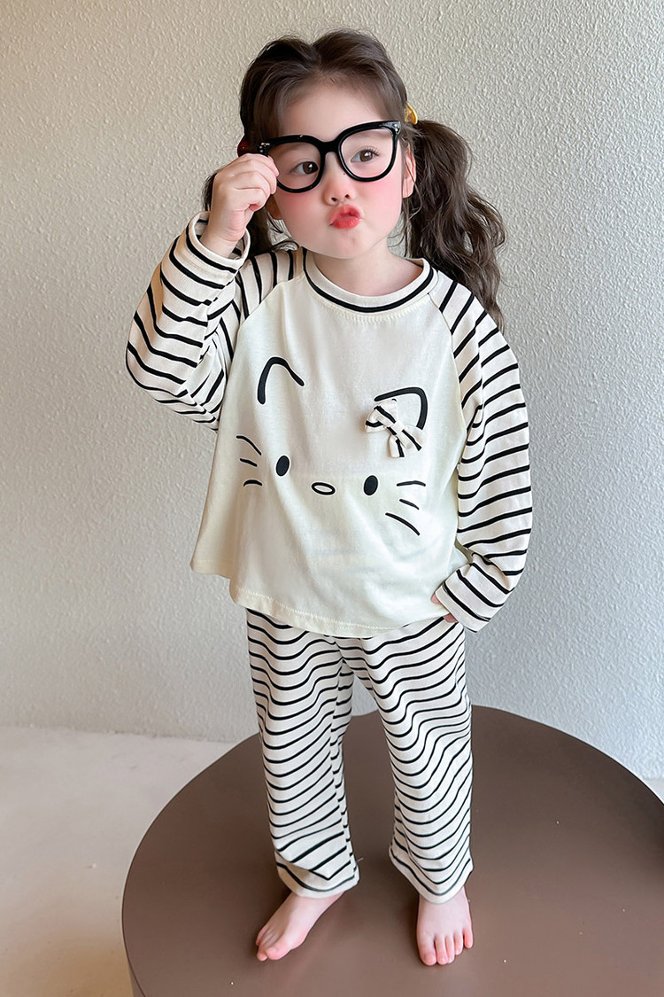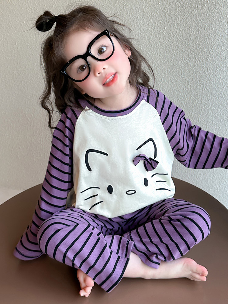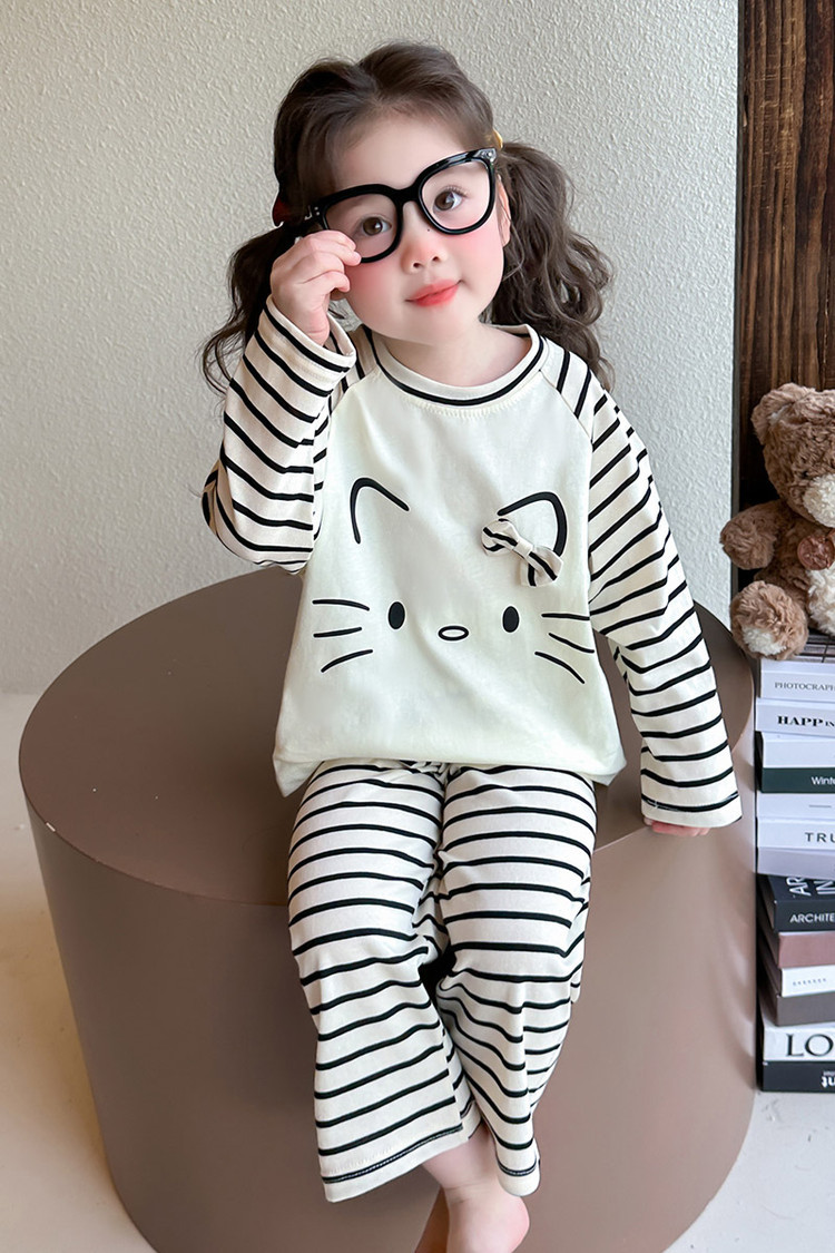 2025 여아 봄 가을 신상 잠옷 여자 아기 고양이 홈웨어 투피스 세트 어린이 스트라이프 세트
