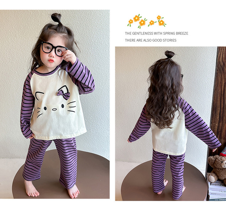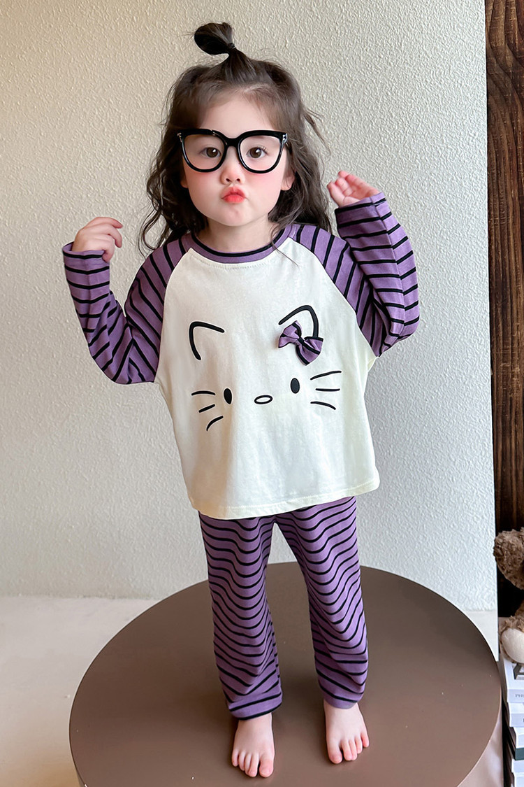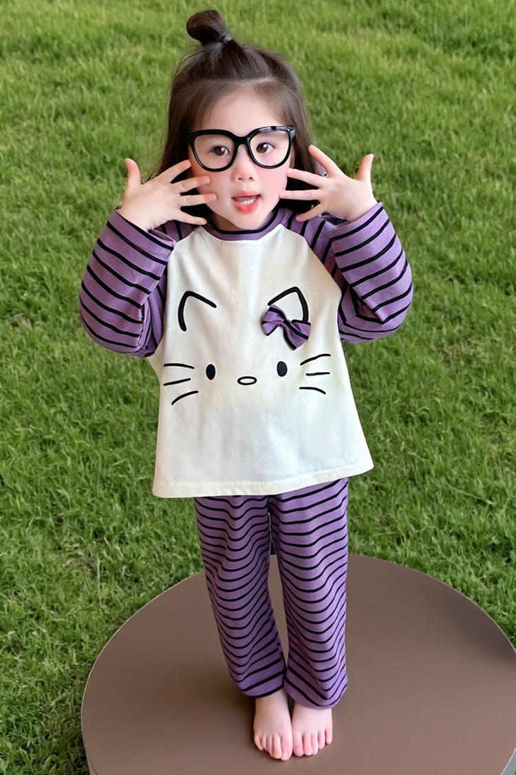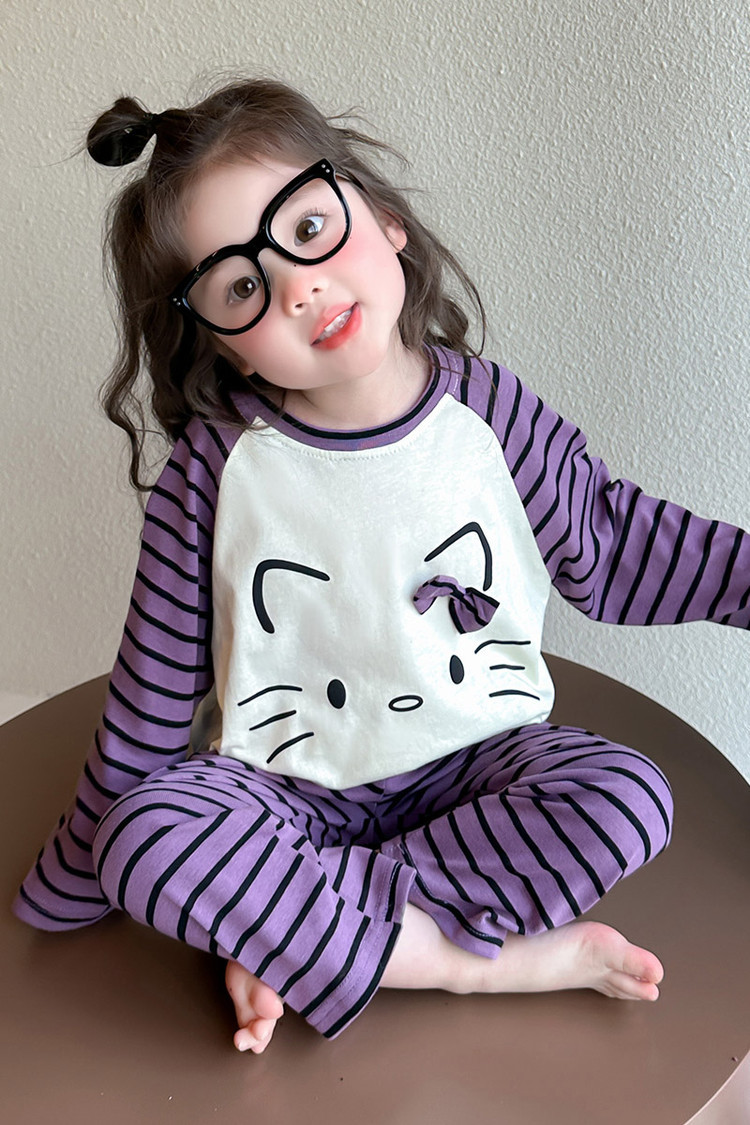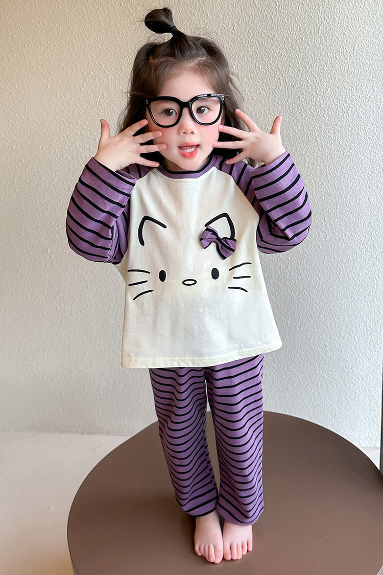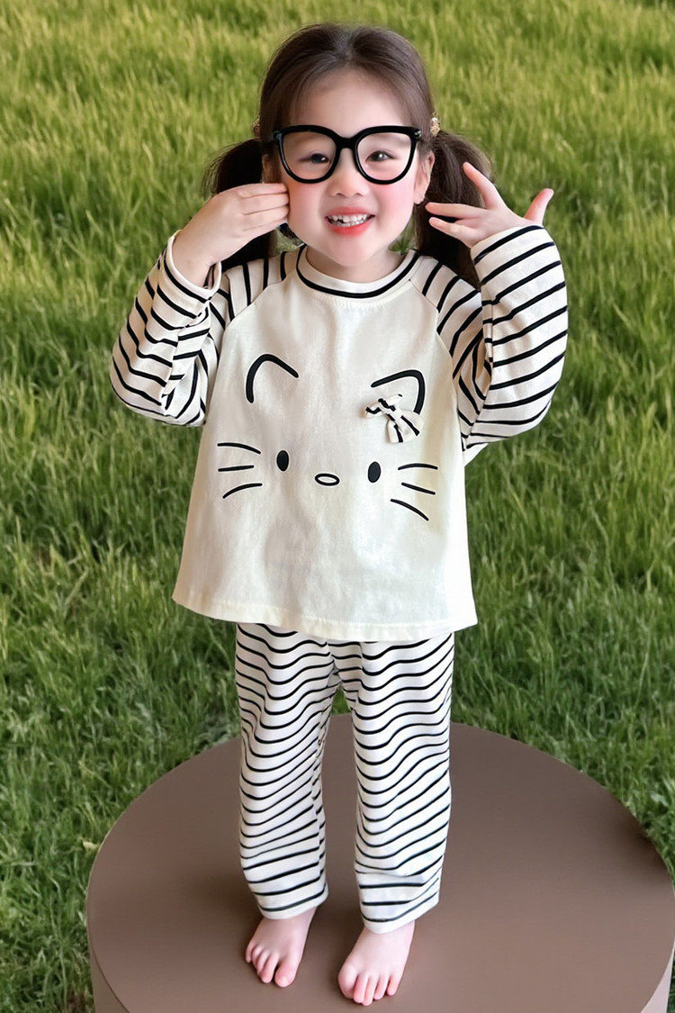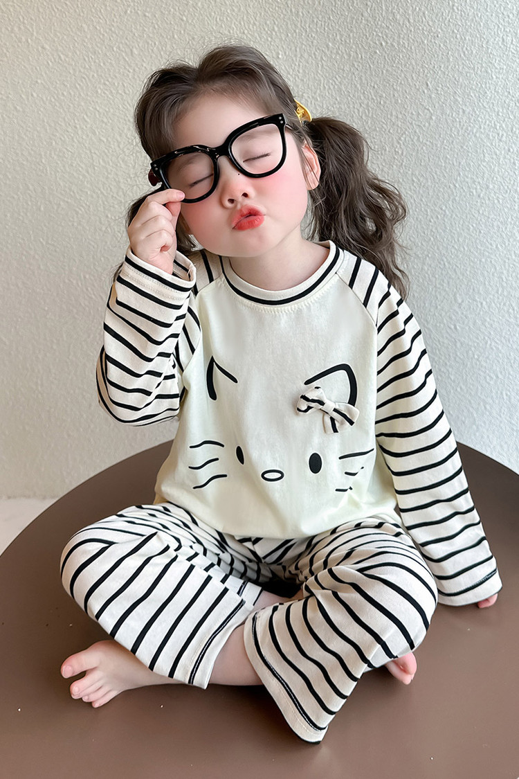 2025 여아 봄 가을 신상 잠옷 여자 아기 고양이 홈웨어 투피스 세트 어린이 스트라이프 세트