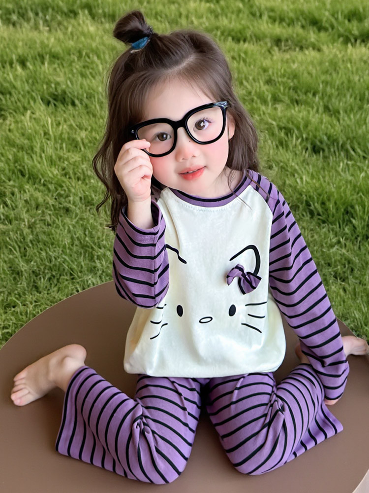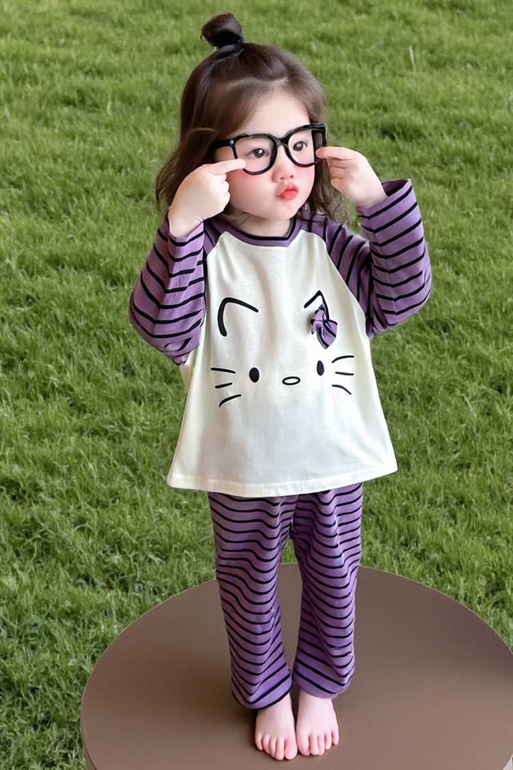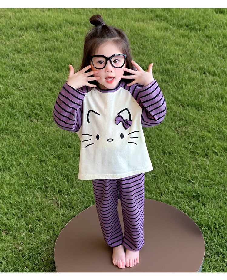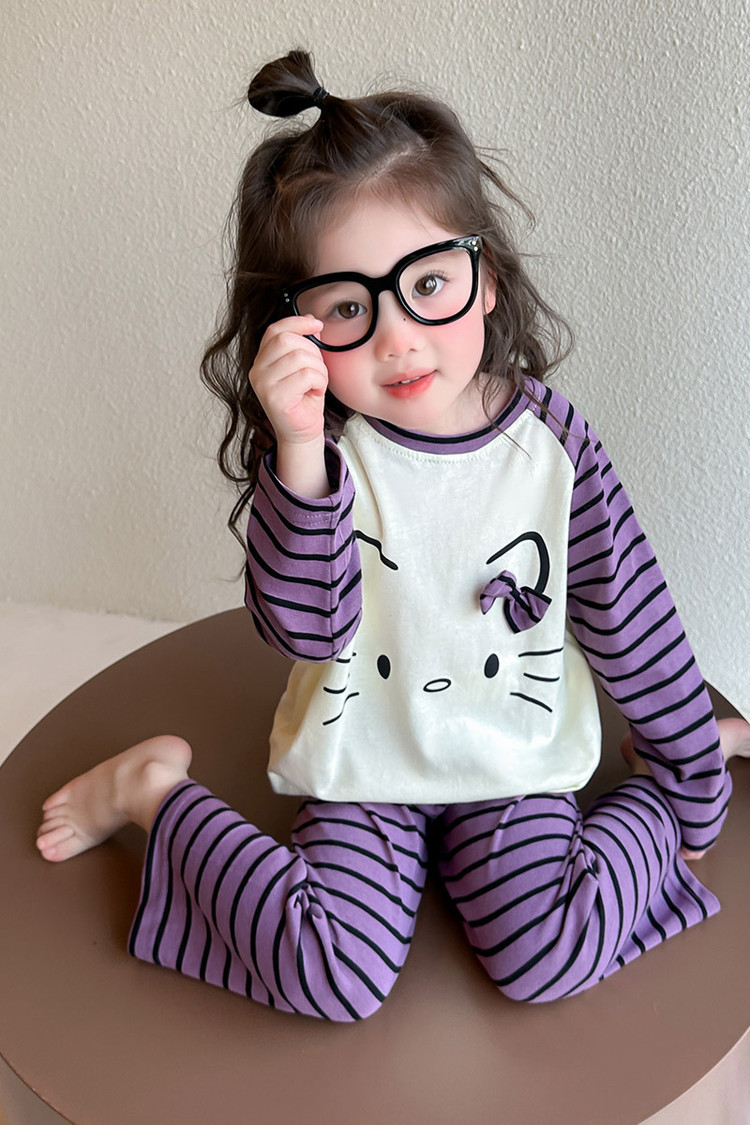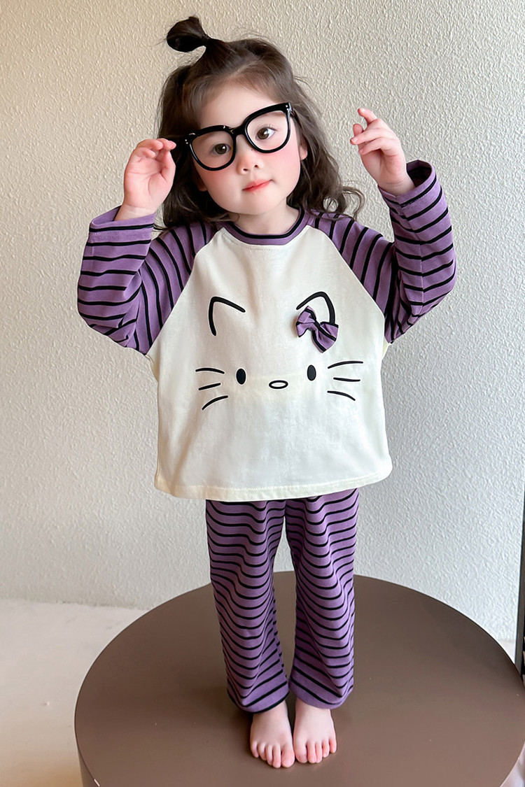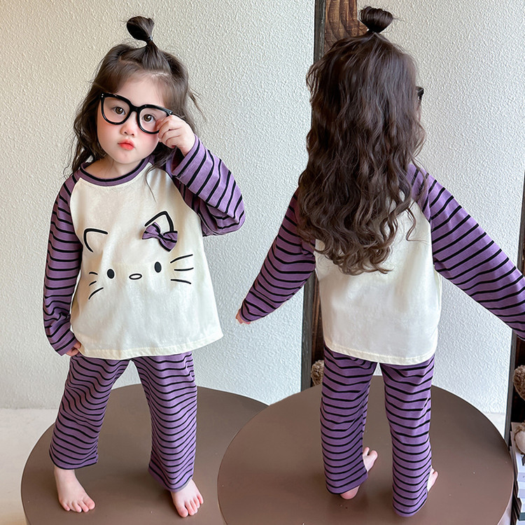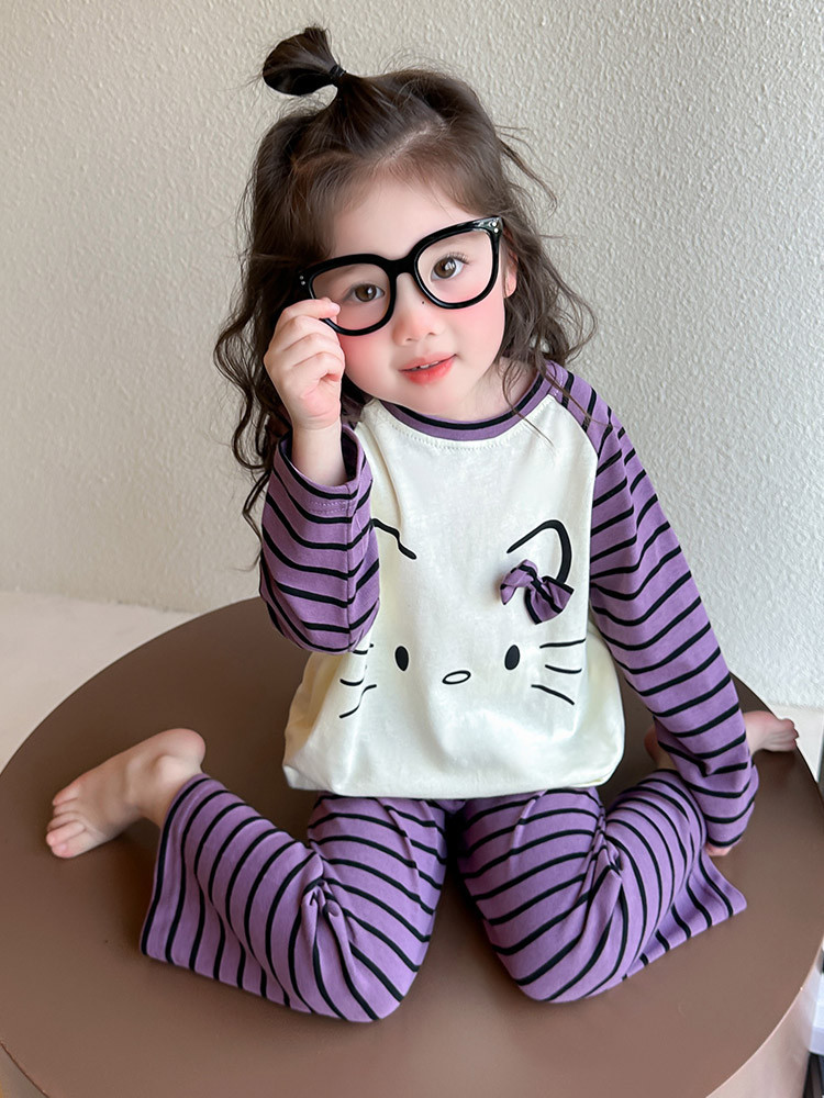 2025 여아 봄 가을 신상 잠옷 여자 아기 고양이 홈웨어 투피스 세트 어린이 스트라이프 세트
