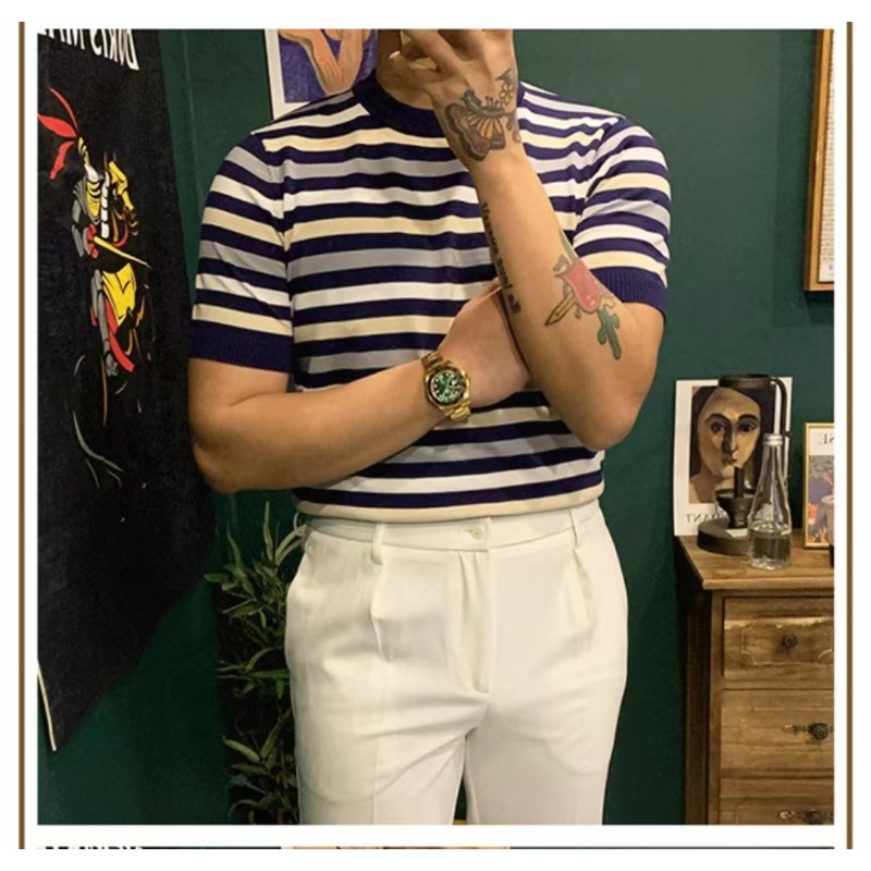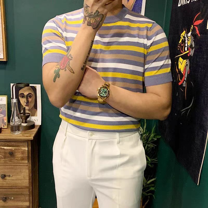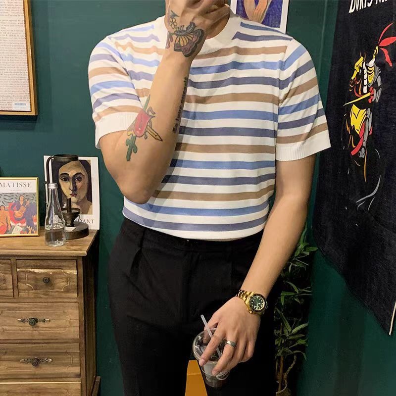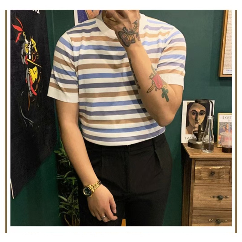 한국 간단한 여름 경량 통기성 니트 셔츠 남성용 아이스 실크 대비 컬러 스트라이프 슬림 핏 반팔 티셔츠