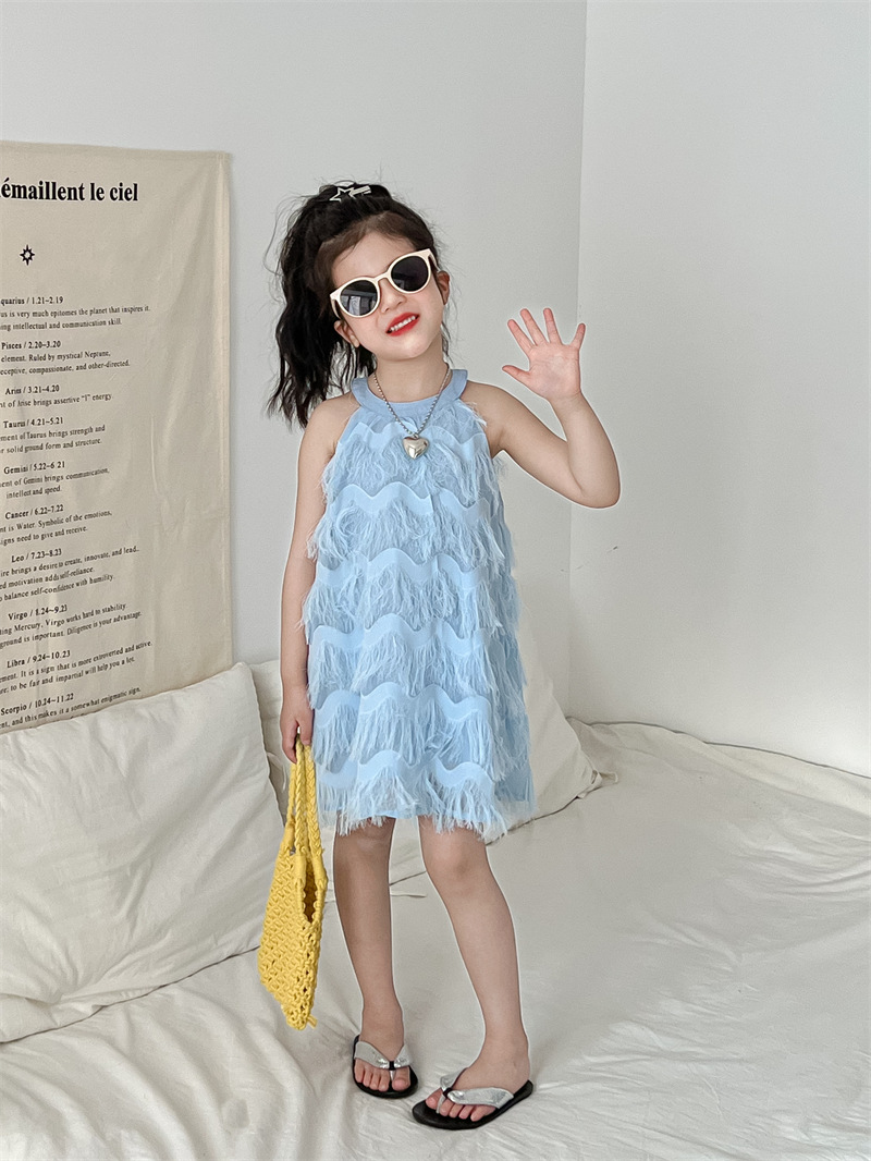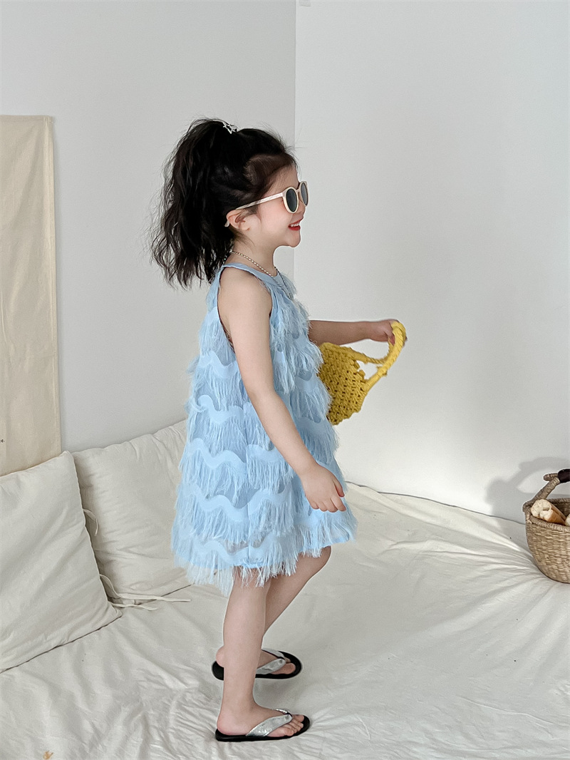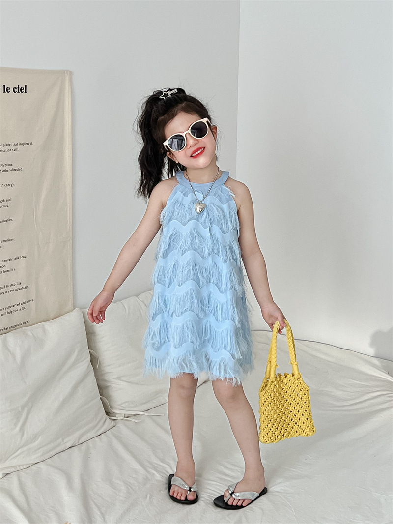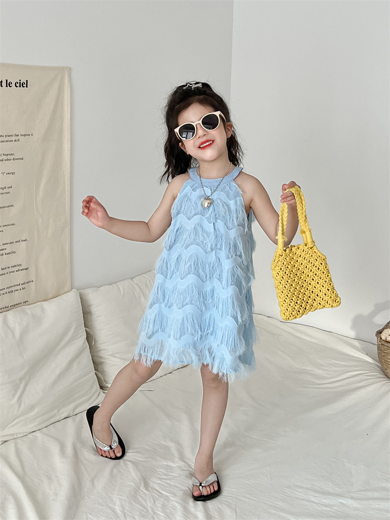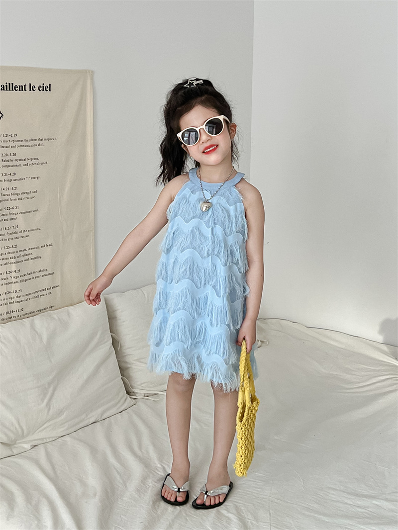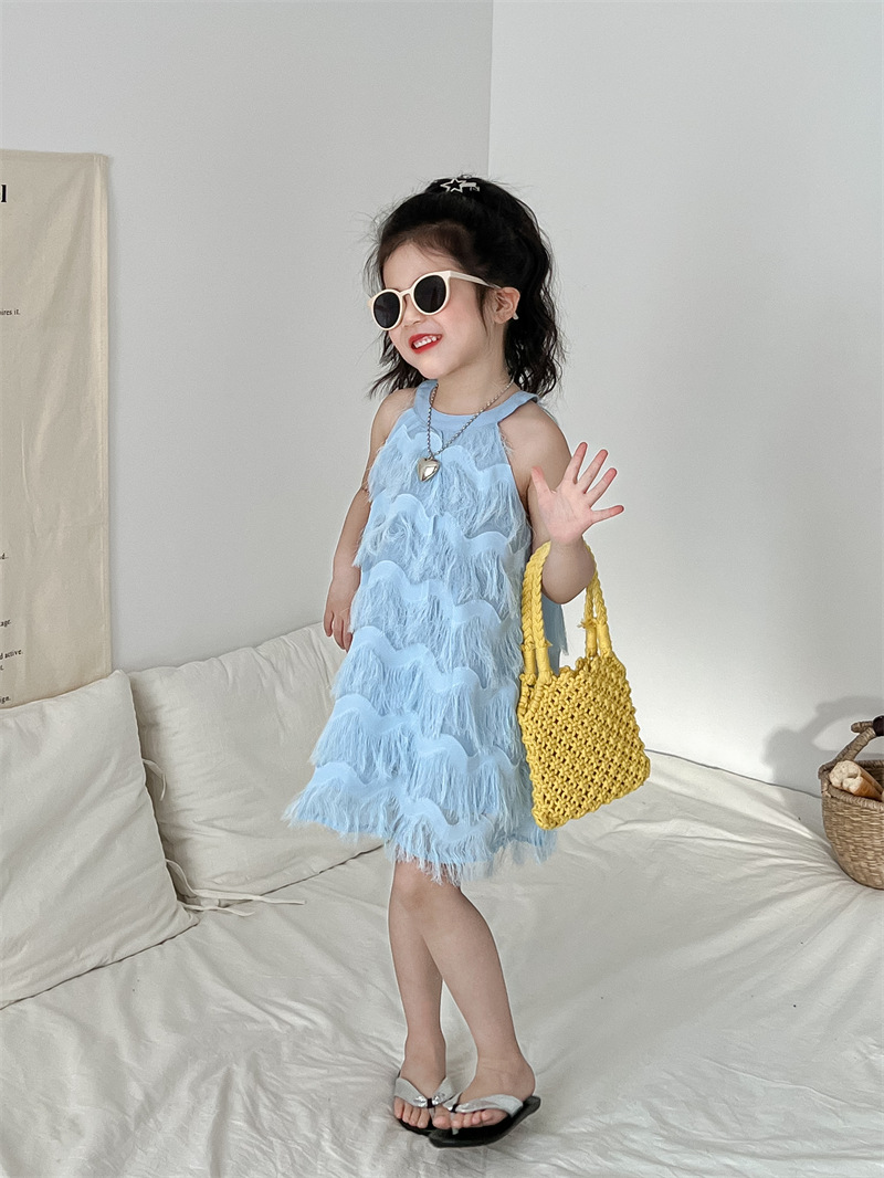 봄/여름 2025 ~ 한국 스타일 소녀 패션 우아한 목 블루 술 웨이브 패턴 민소매 보프 스커트 원피스