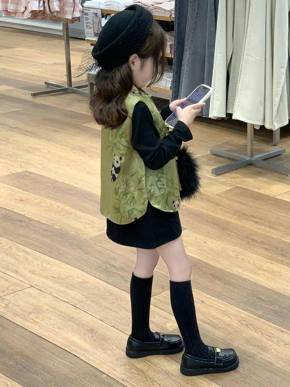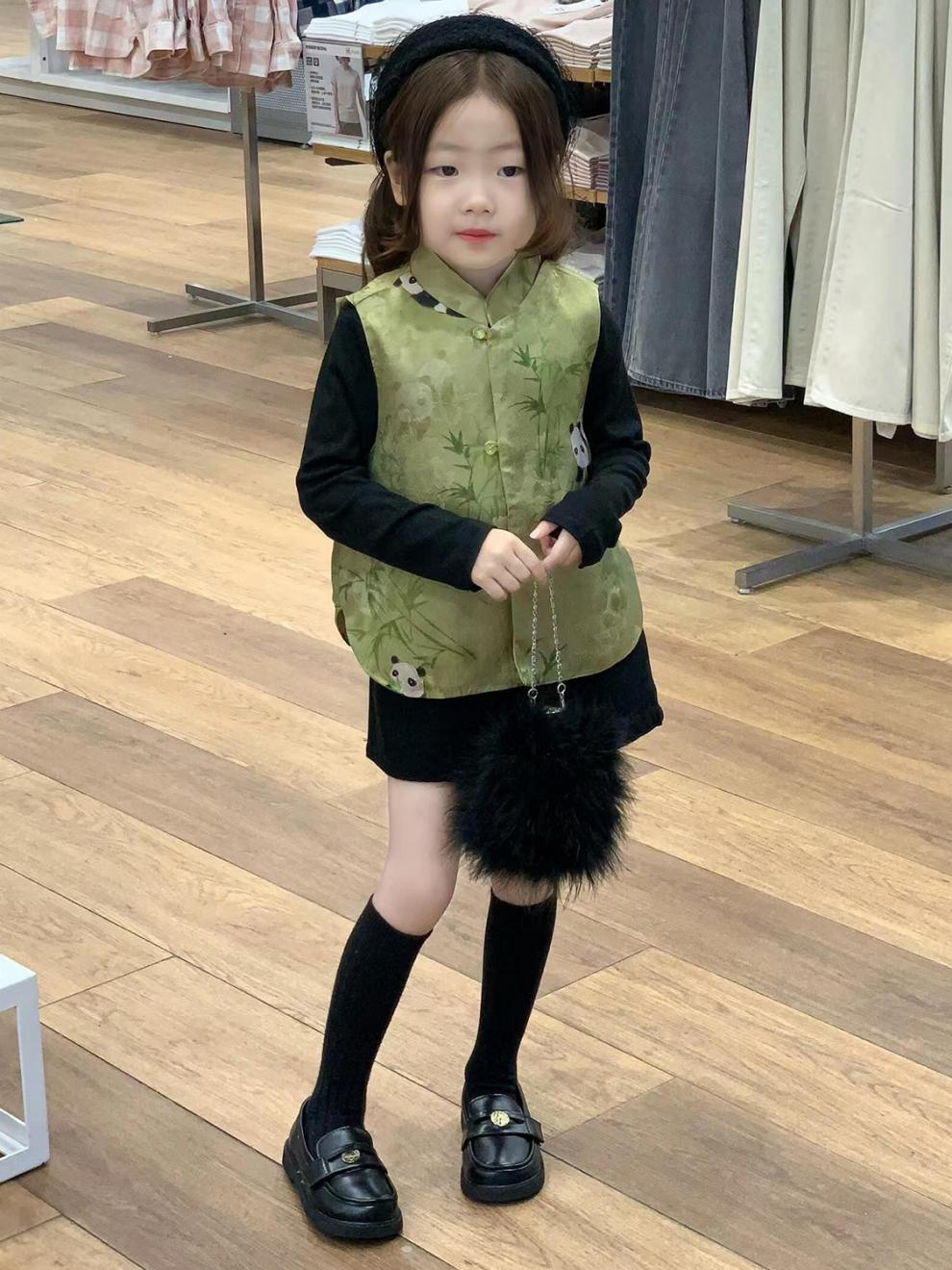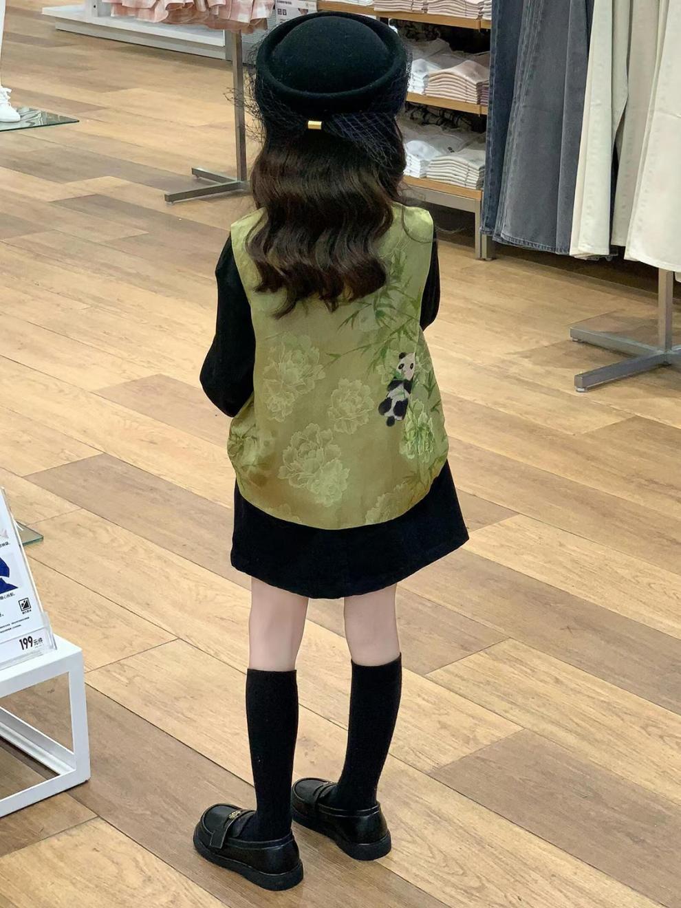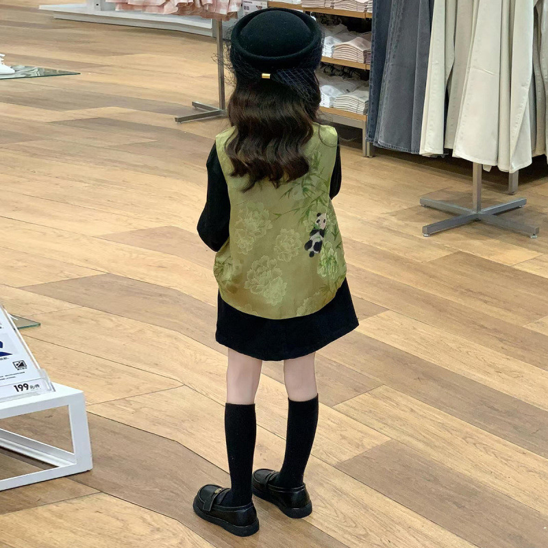 새로운 중국 아동복 2025 가을 새로운 녹색 팬더 자카드 국가 스타일 탕 스타일 조끼 소녀 블랙 스커트스토어 가기