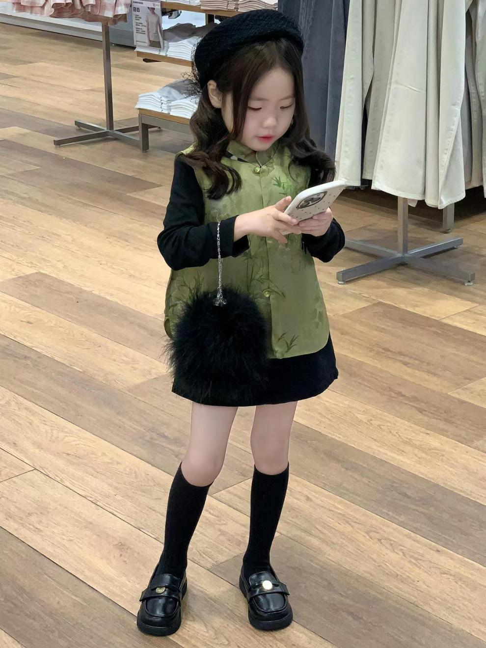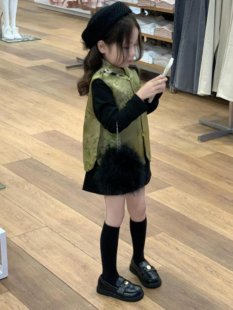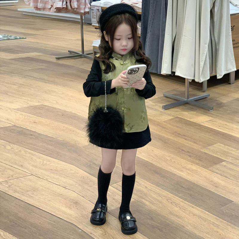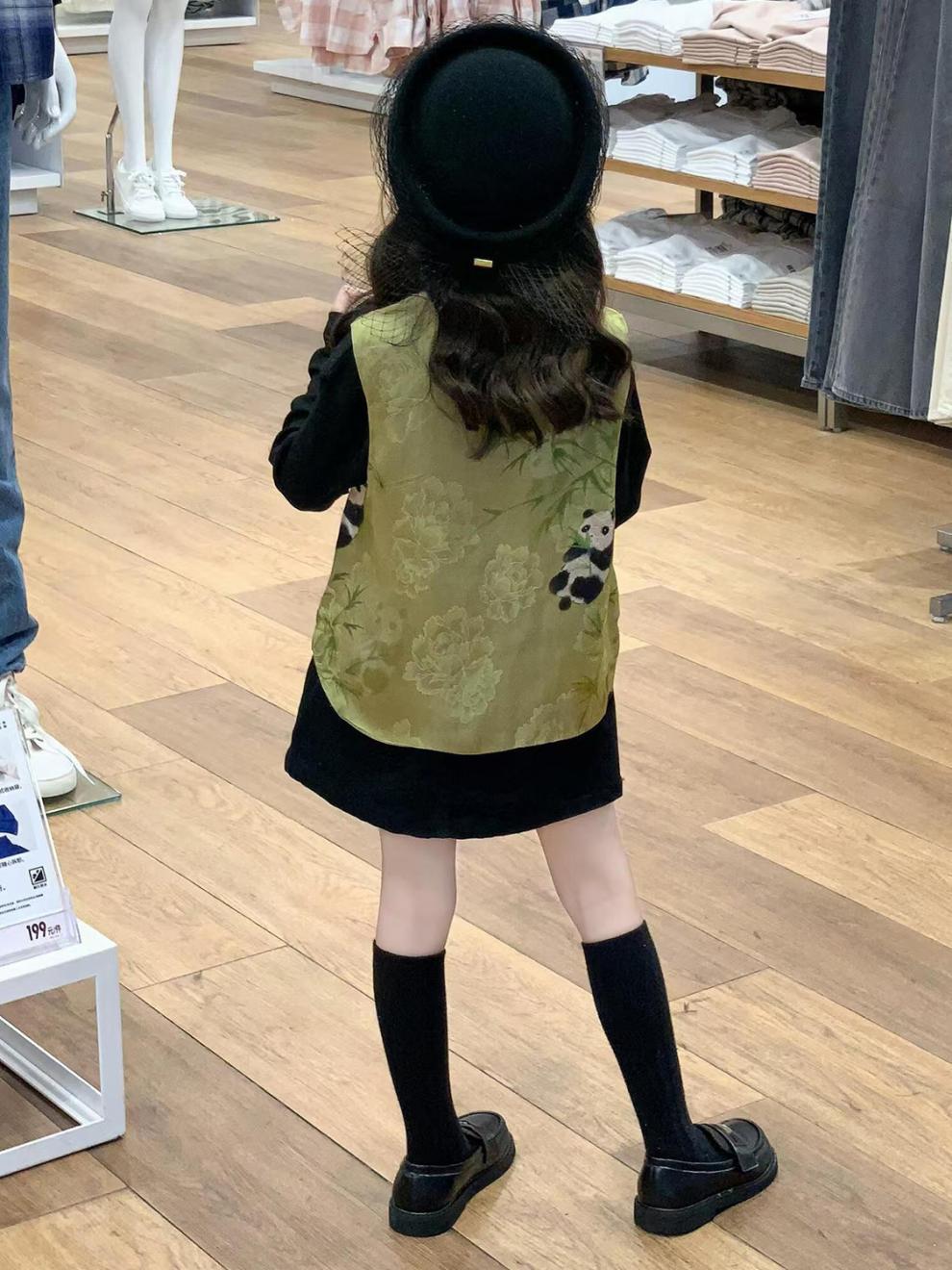 새로운 중국 아동복 2025 가을 새로운 녹색 팬더 자카드 국가 스타일 탕 스타일 조끼 소녀 블랙 스커트스토어 가기