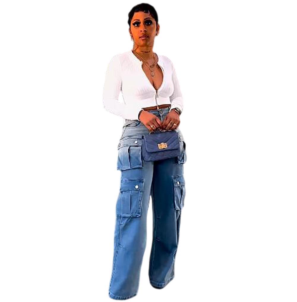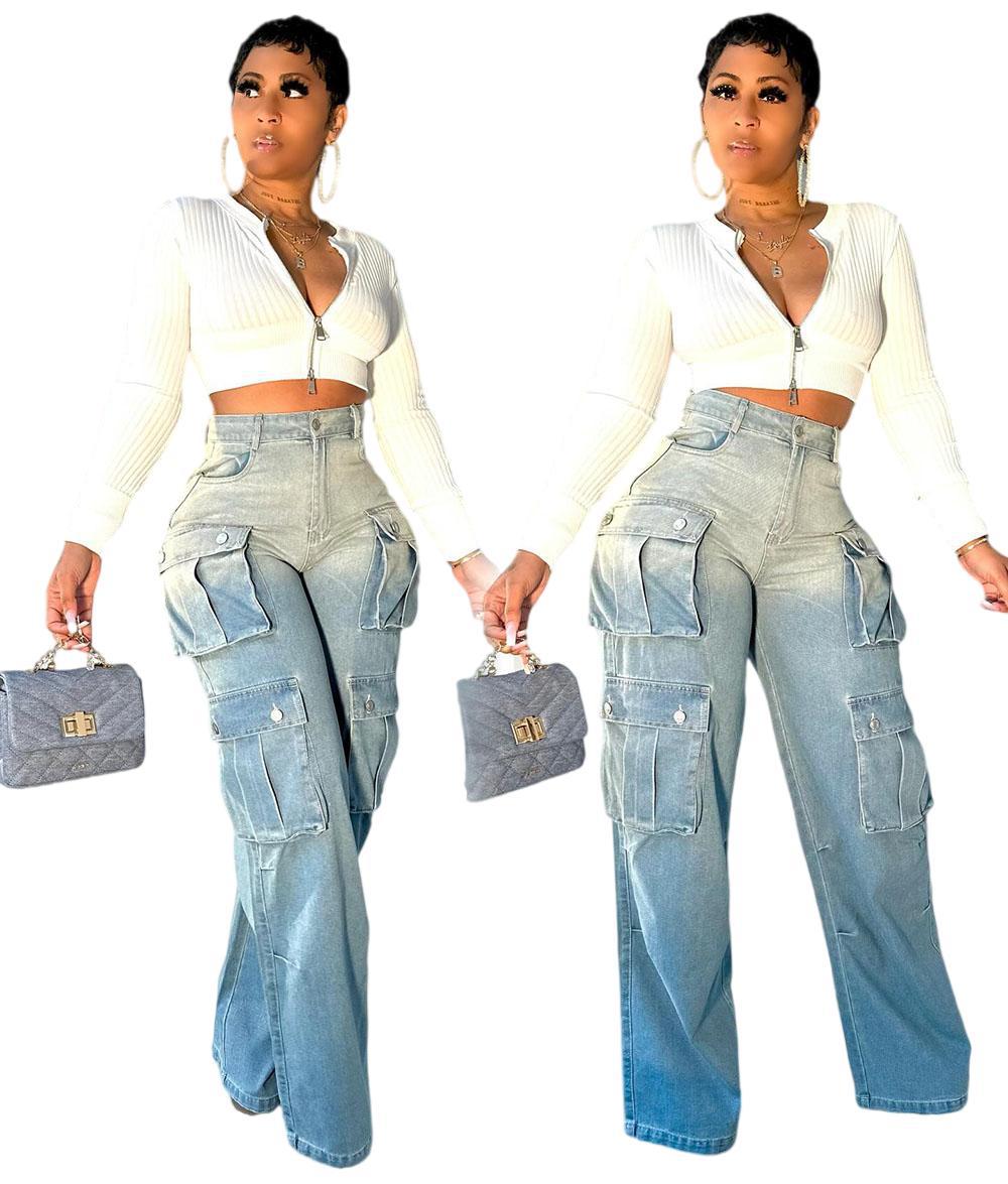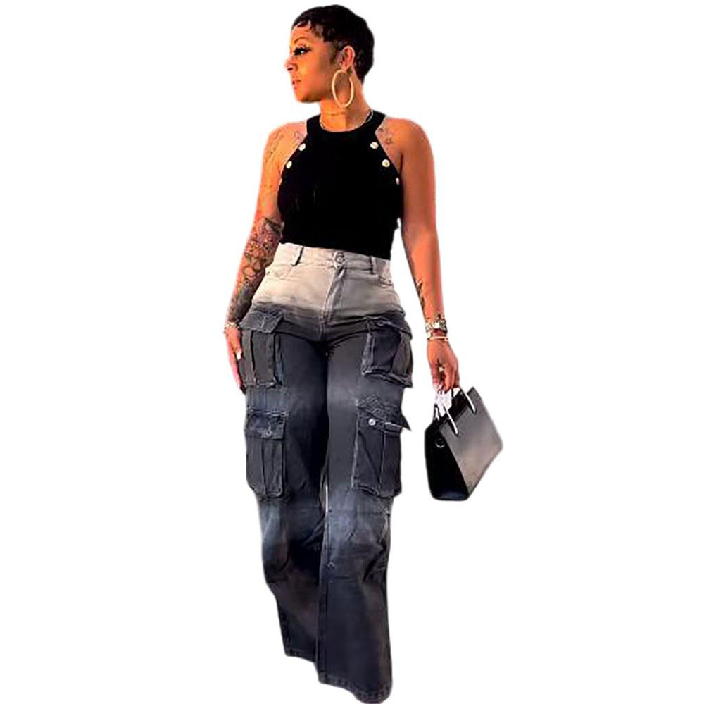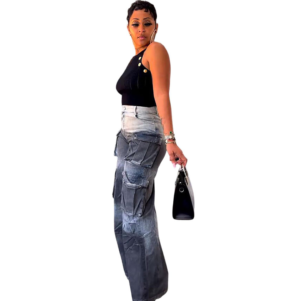 유럽과 미국 여성의 타이 염색 청바지 아마존 크로스 보더 여성 패션 하이 웨이스트 멀티 포켓 그라디언트 와이드 레그 팬츠