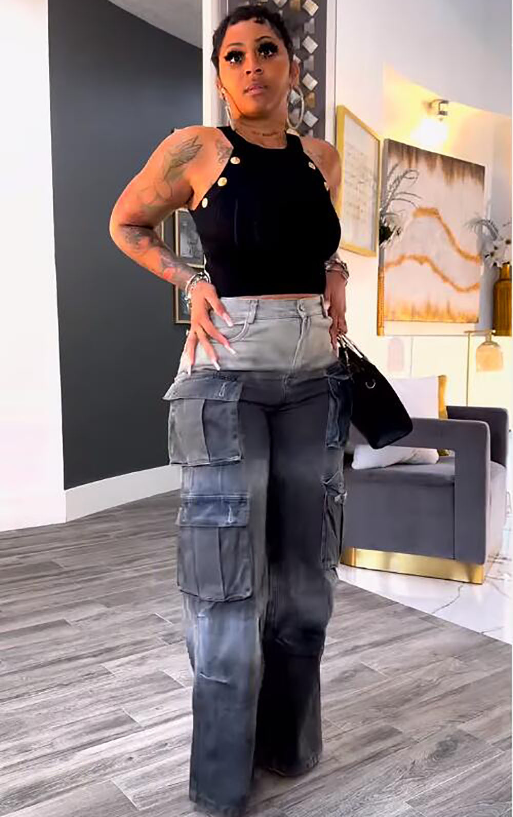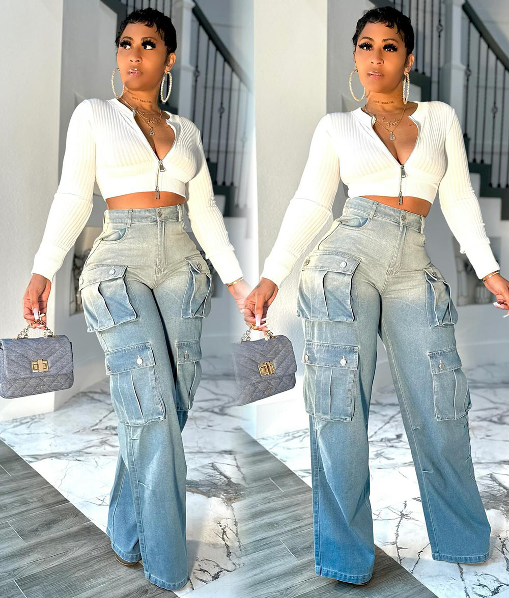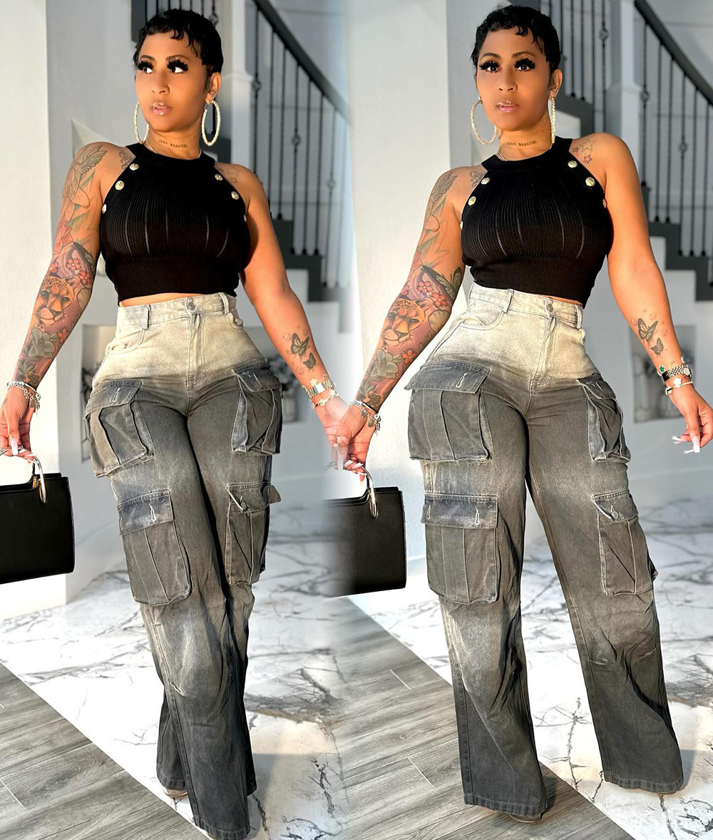 유럽과 미국 여성의 타이 염색 청바지 아마존 크로스 보더 여성 패션 하이 웨이스트 멀티 포켓 그라디언트 와이드 레그 팬츠