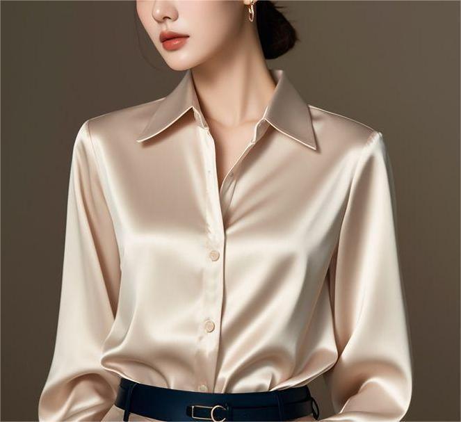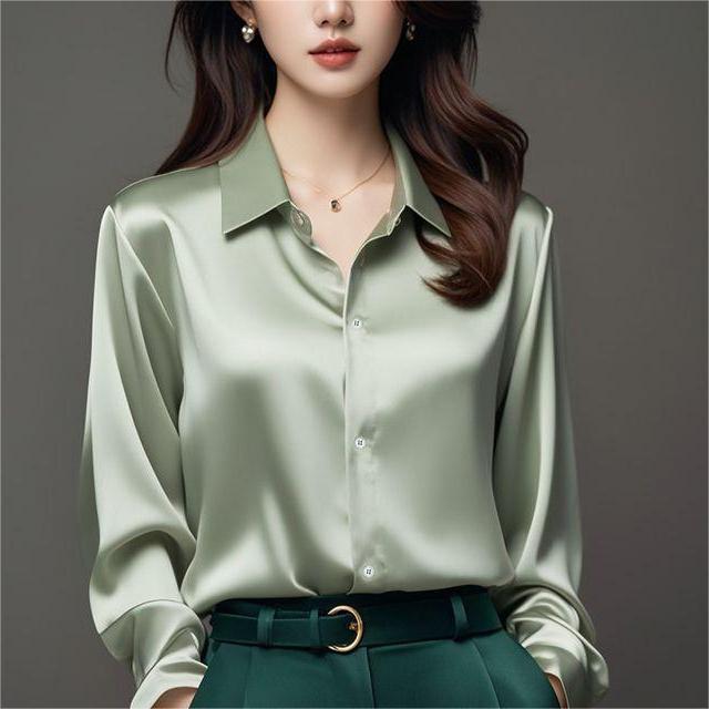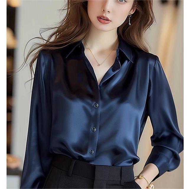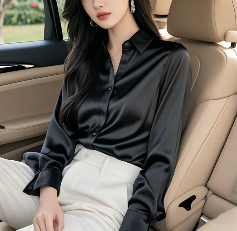 2025 봄과 가을 새로운 하이 엔드 센스 그레이 아세테이트 새틴 셔츠 여성용 긴팔 세련된 프랑스 실크 전문 셔츠스토어 가기