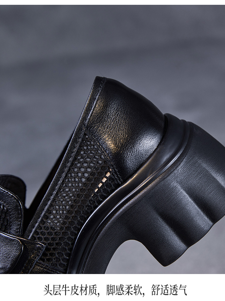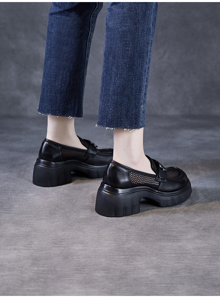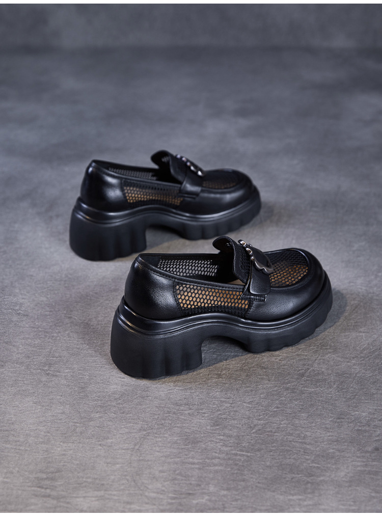 메쉬 플랫폼 로퍼 여성 2025 년 봄과 여름 새로운 정품 가죽 통기성 메쉬 신발 슬립 온 싱글 슈즈