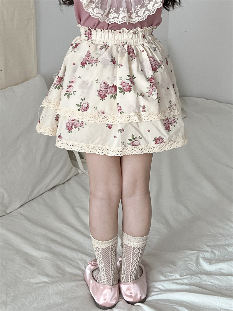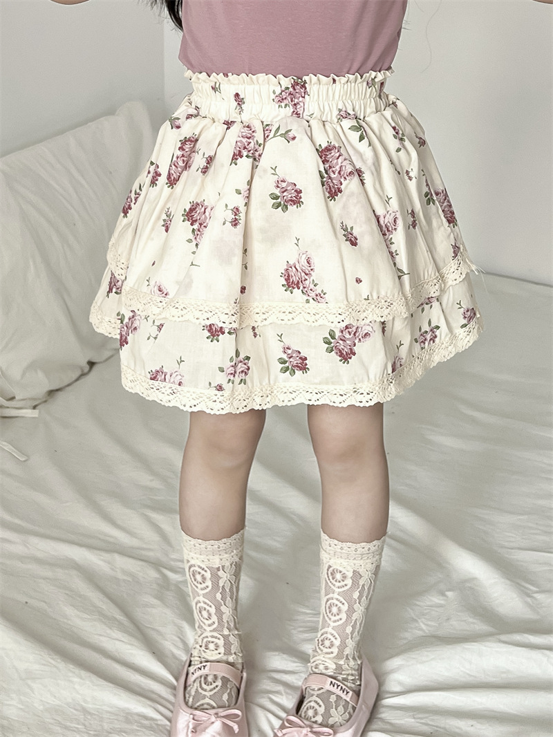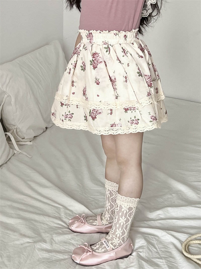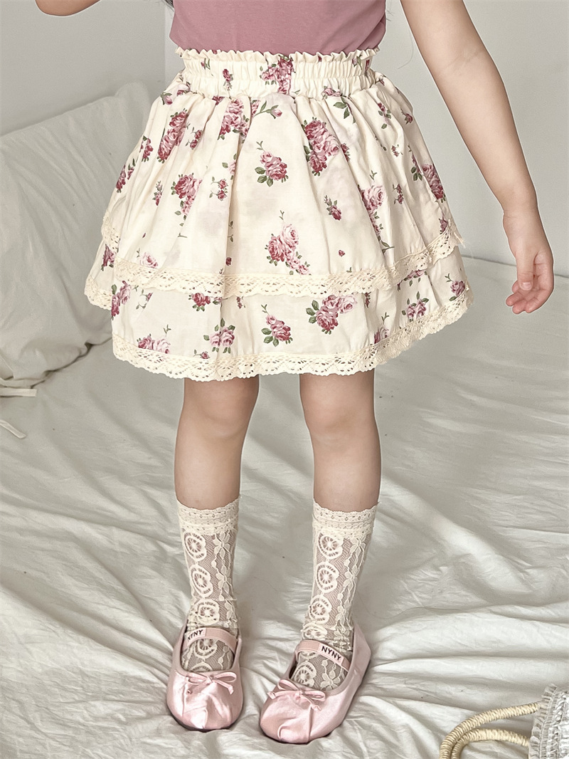 봄/여름 2025 ~ 소녀의 봄/여름 스트레치 허리 순면 전체 인쇄 자주색 꽃 레이스 트림 치마 안전 치마스토어 가기