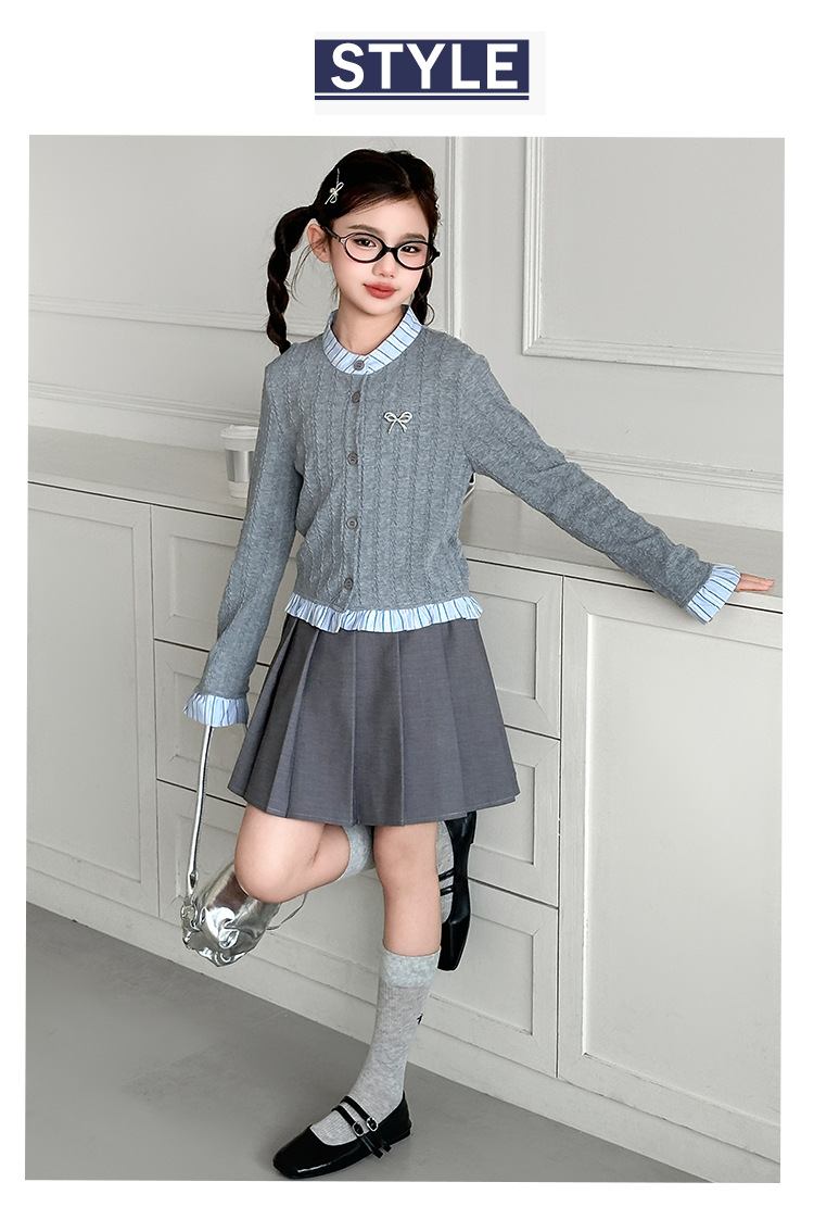 소녀의 가짜 두 조각 세트 2025 봄 새 스타일 소녀의 주름 긴 소매 아카데미 스타일 주름 치마 두 조각 세트