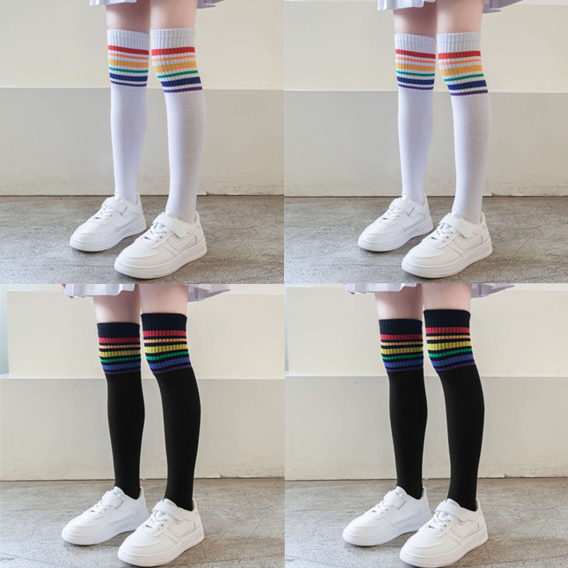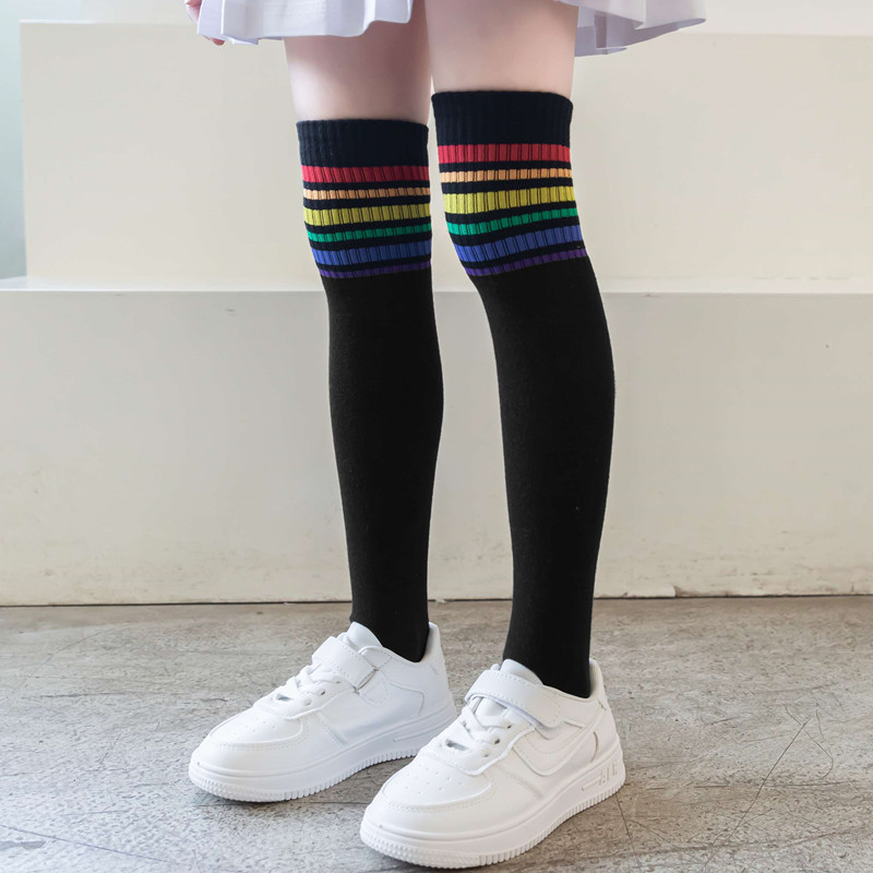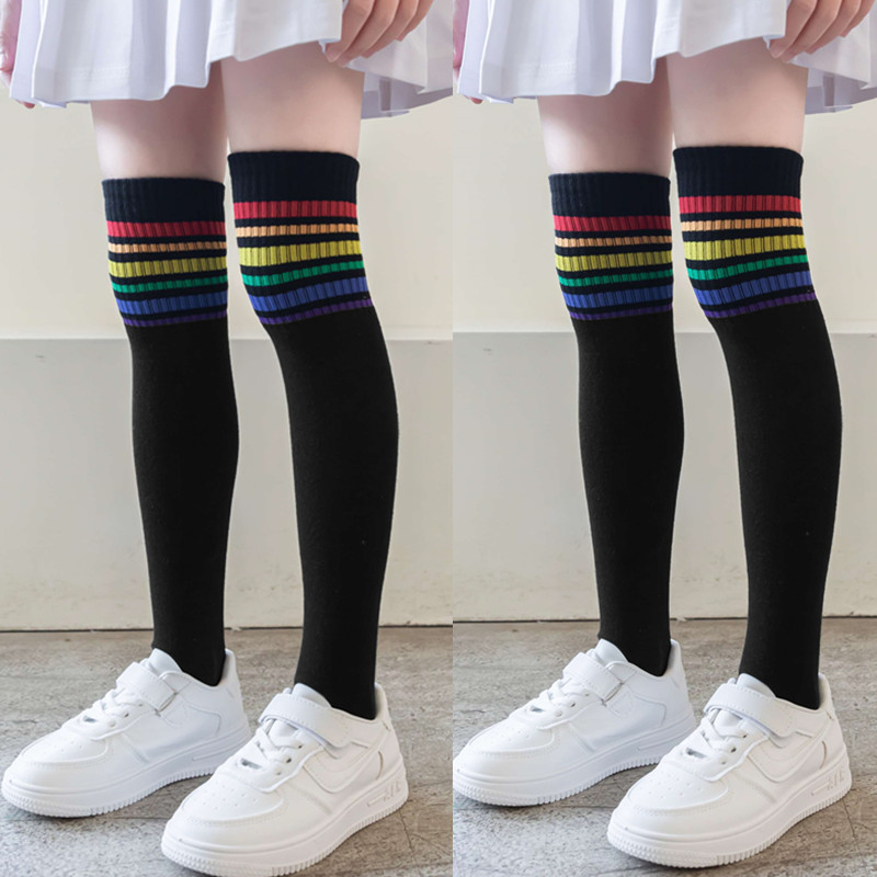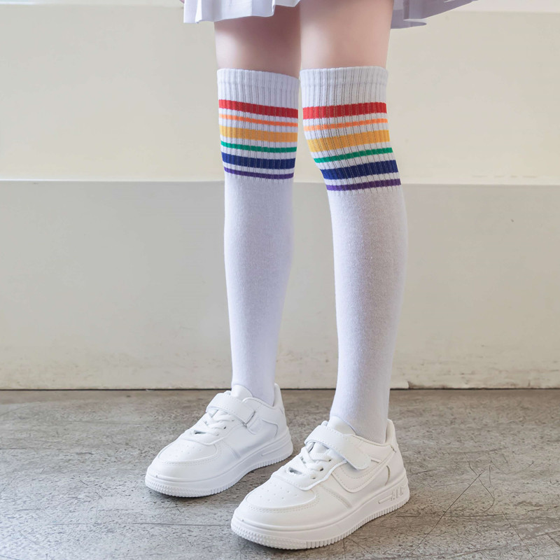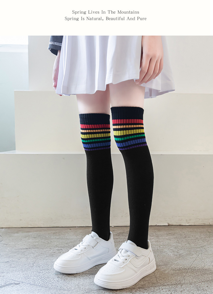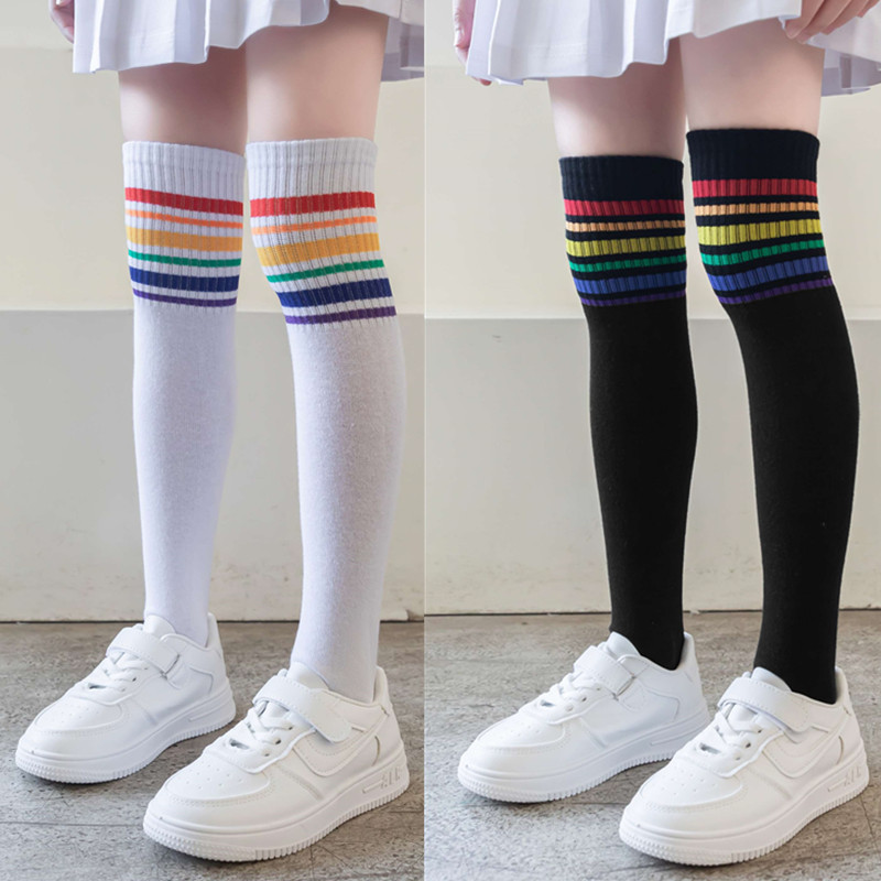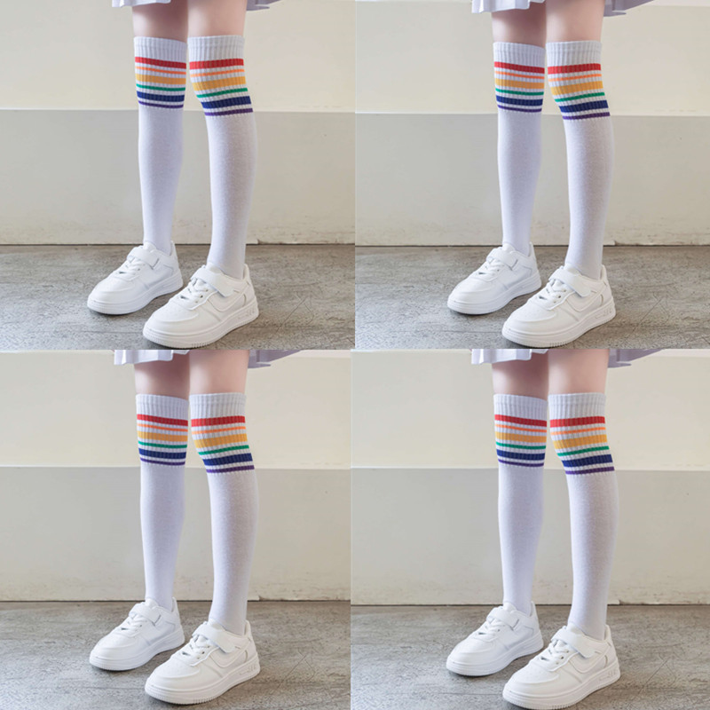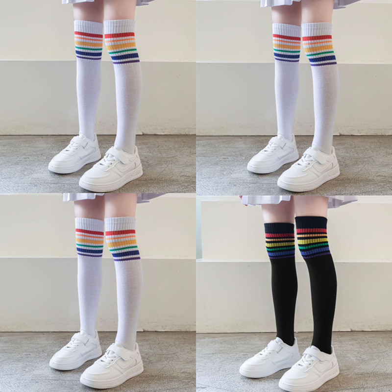 어린이 스타킹 봄과 가을 얇은 중간 튜브 무릎 높은 양말 어린 소녀 무릎 높은 축구 양말 아기 무지개 양말