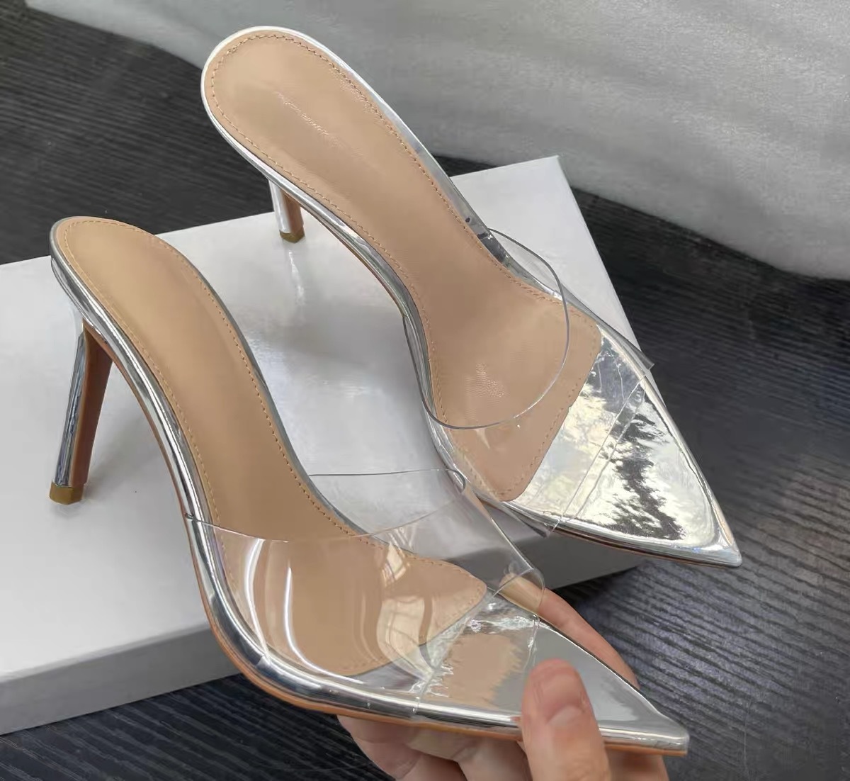 여성용 투명 하이힐 샌들 및 슬리퍼 2025 여름 새로운 패션 얇은 뒤꿈치 포인팅 섹시한 오픈 발가락 슬라이드