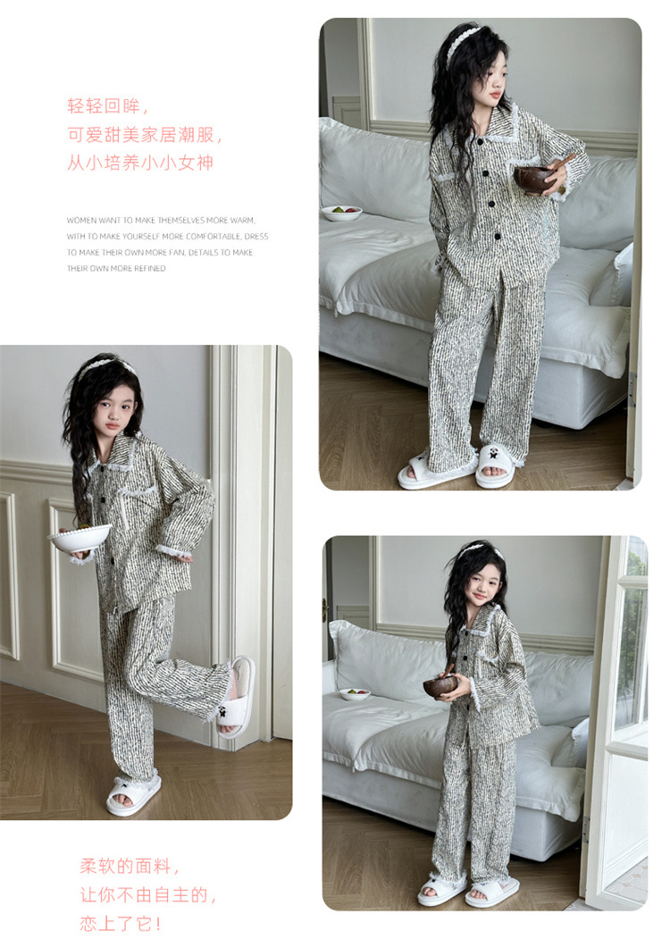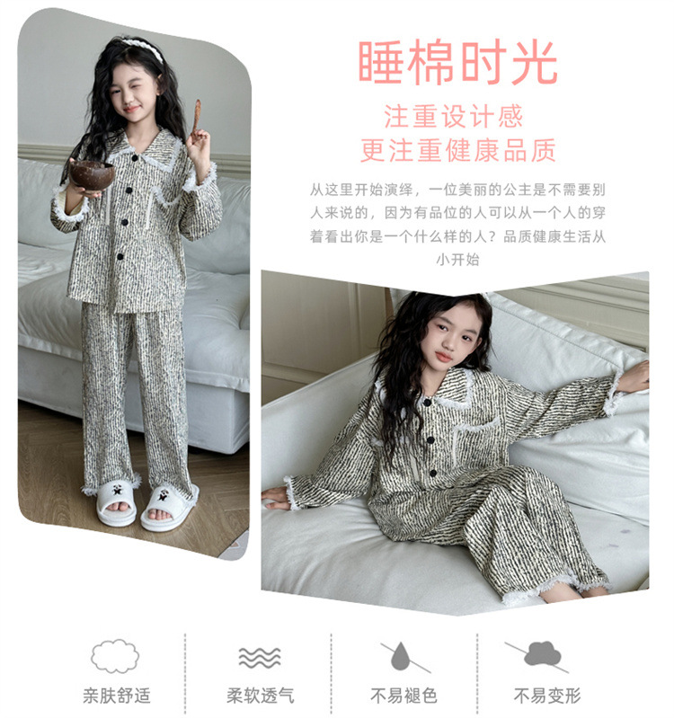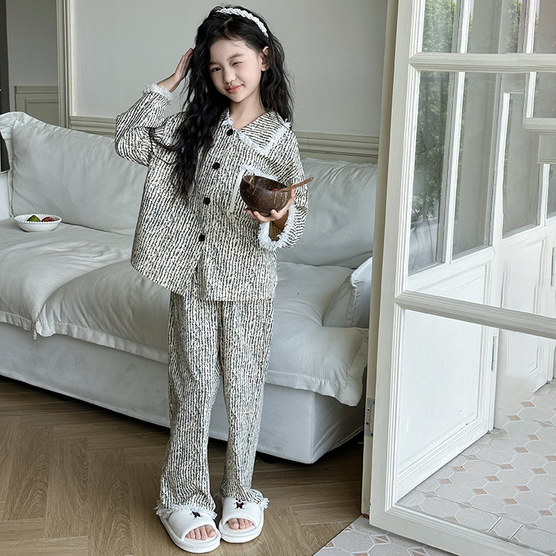 소녀 잠옷 봄과 가을 새로운 어린이 카디건 모피 가장자리 서양식 캐주얼 걸스 홈 옷 세트 후 저우 질리