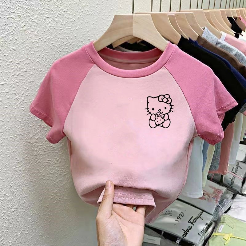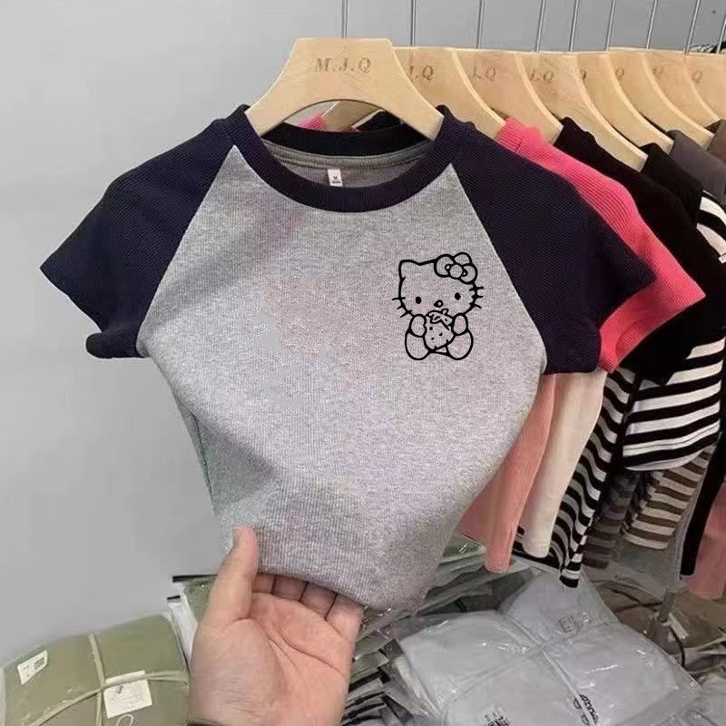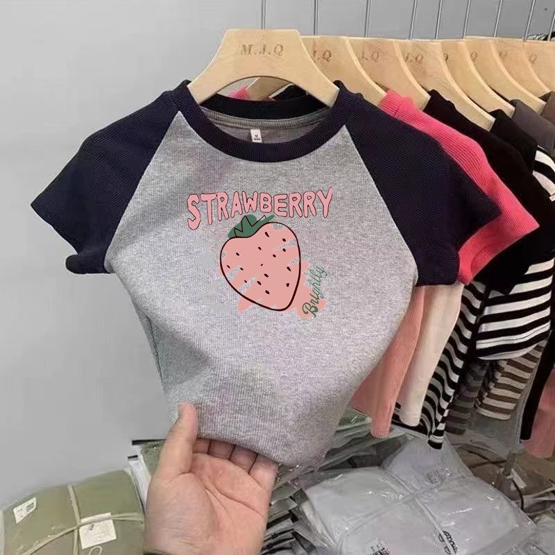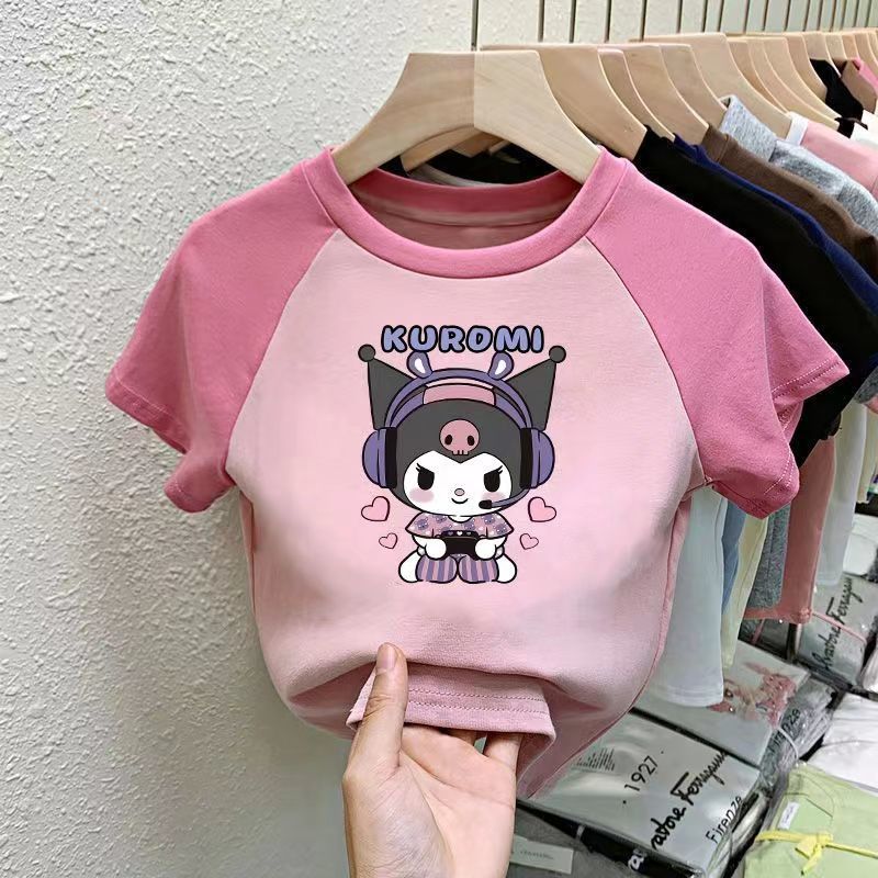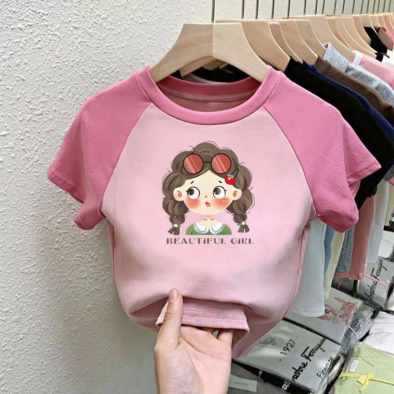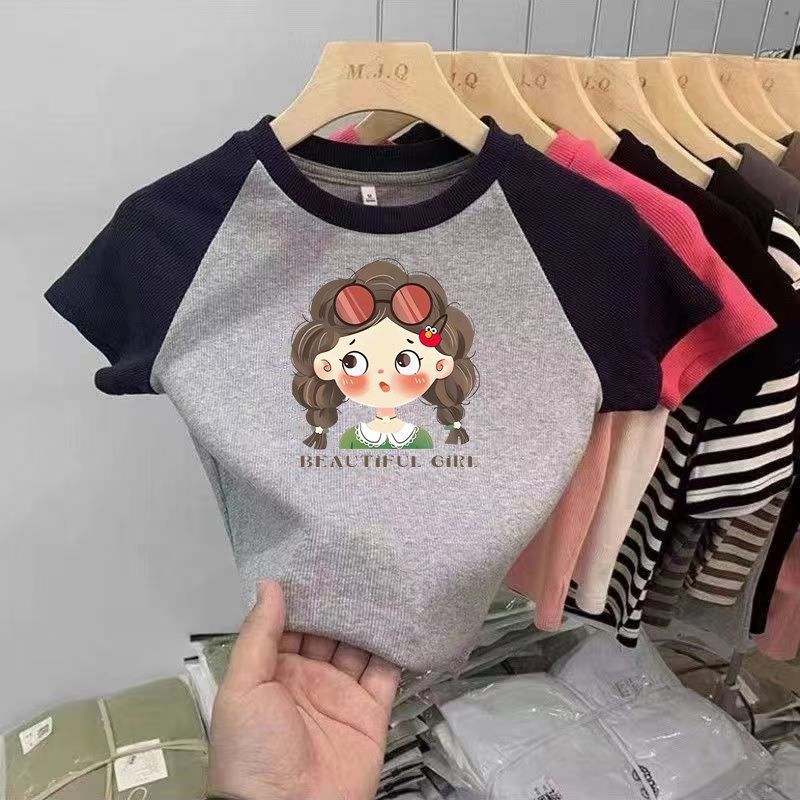 소녀 면 반팔 티셔츠 2025 새로운 여름 어린이 서양식 만화 Kulomi Raglan 슬리브 컬러 매칭 탑