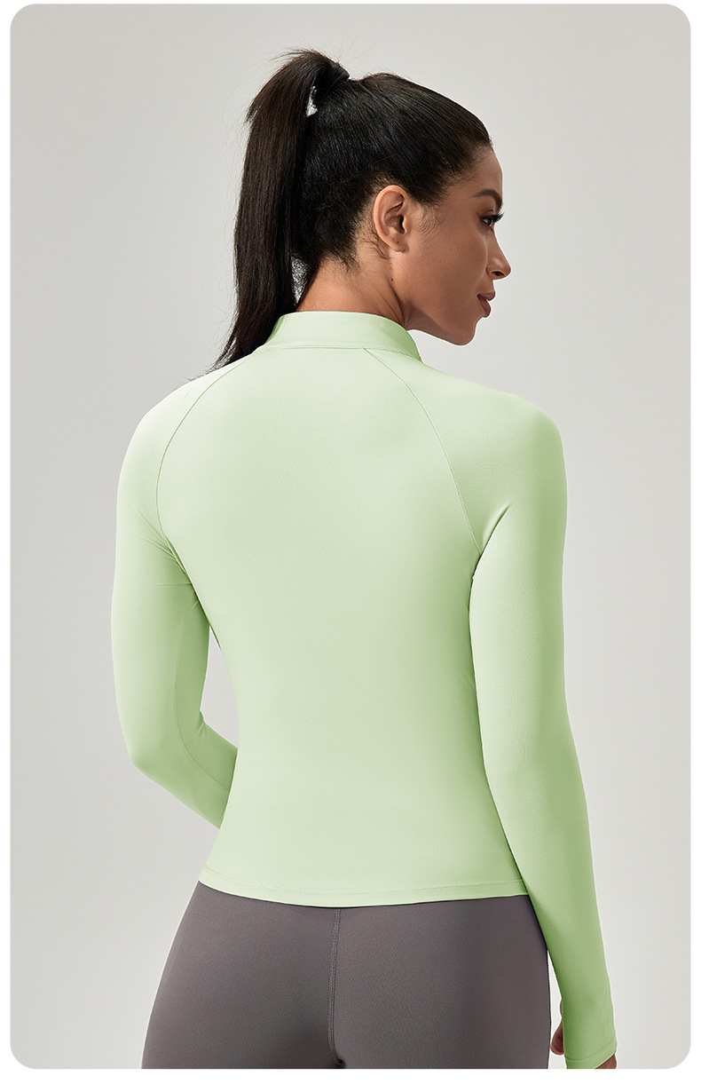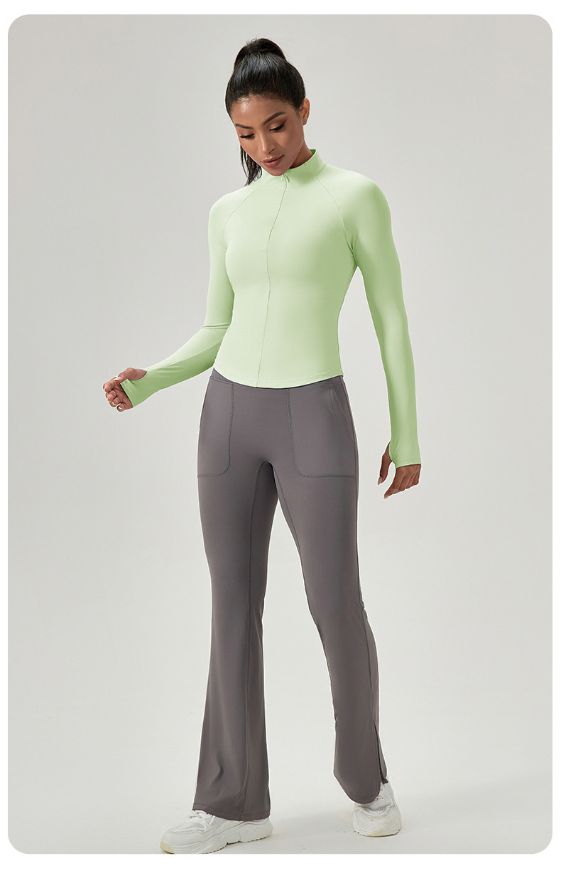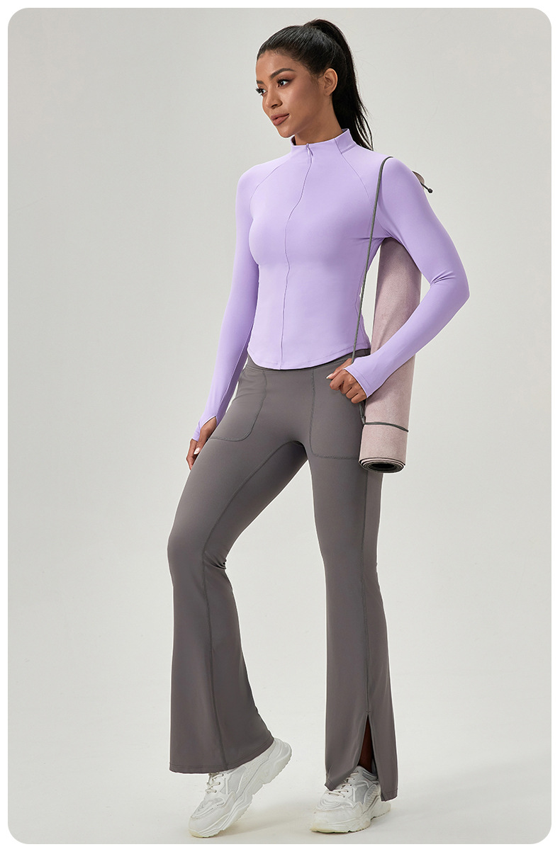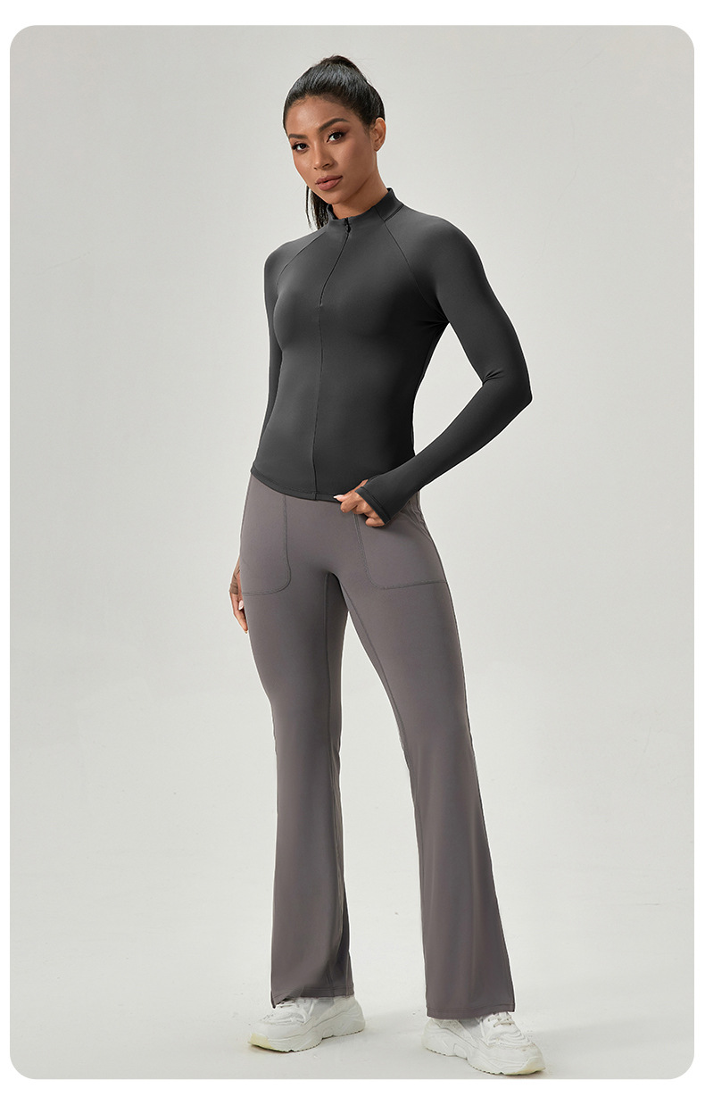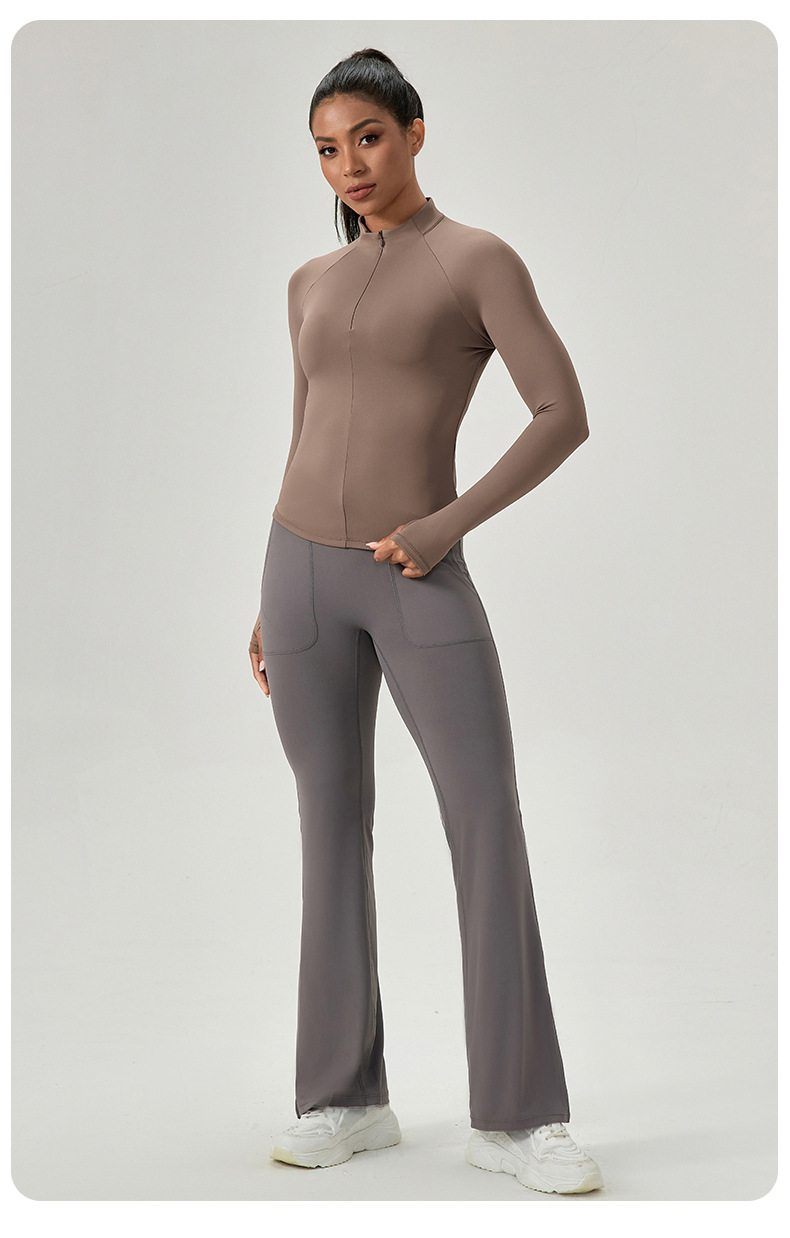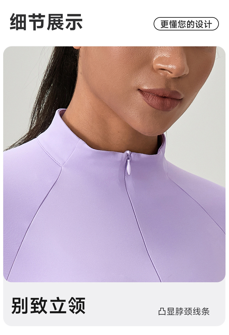 여성용 하프 Zip 요가 세트 긴팔 수직 칼라 스포츠 피트니스 탑 퀵 드라이 알몸 센스 러닝 타이트 52559
